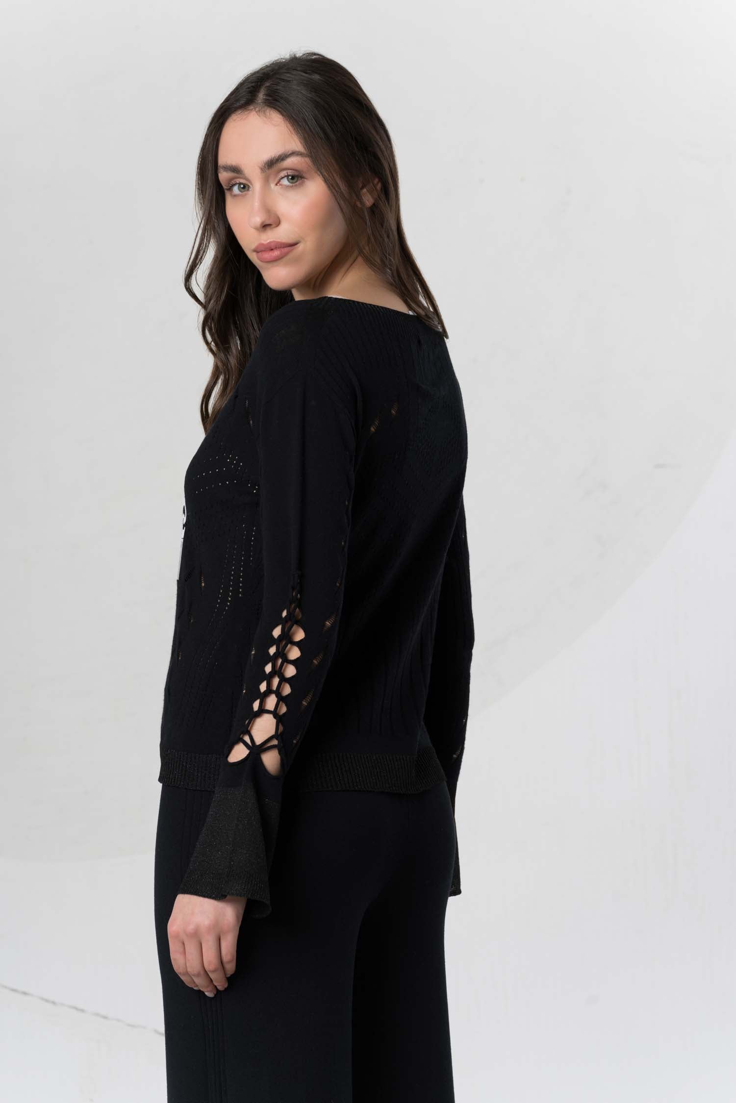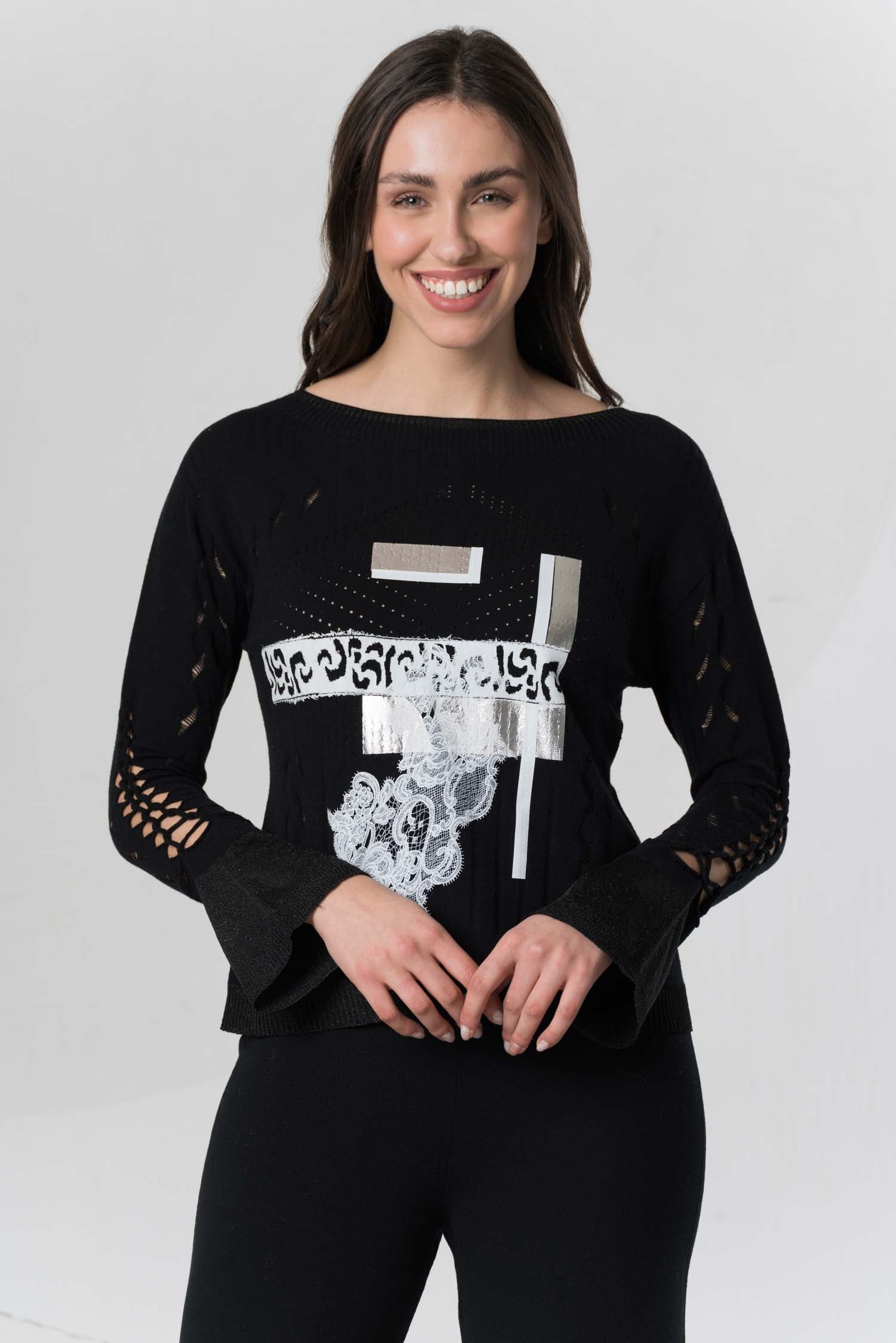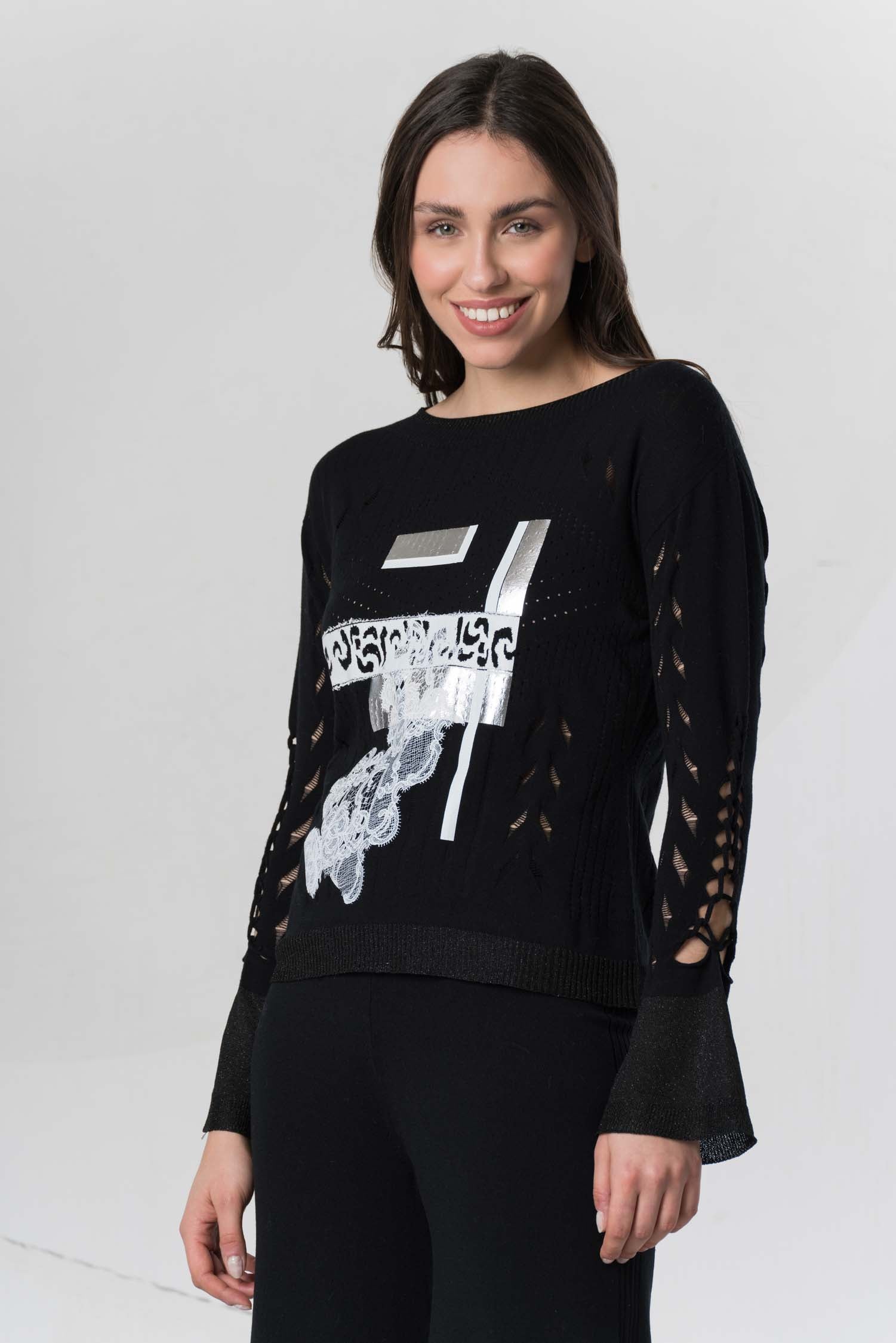 This black sweater impresses with its elegant design and striking print, which lends the garment a modern and stylish touch. High-quality materials guarantee comfort and long-lasting quality, ideal for a variety of looks from casual to chic. A must-have for fashion-conscious wearers who appreciate clean lines and expressive details.