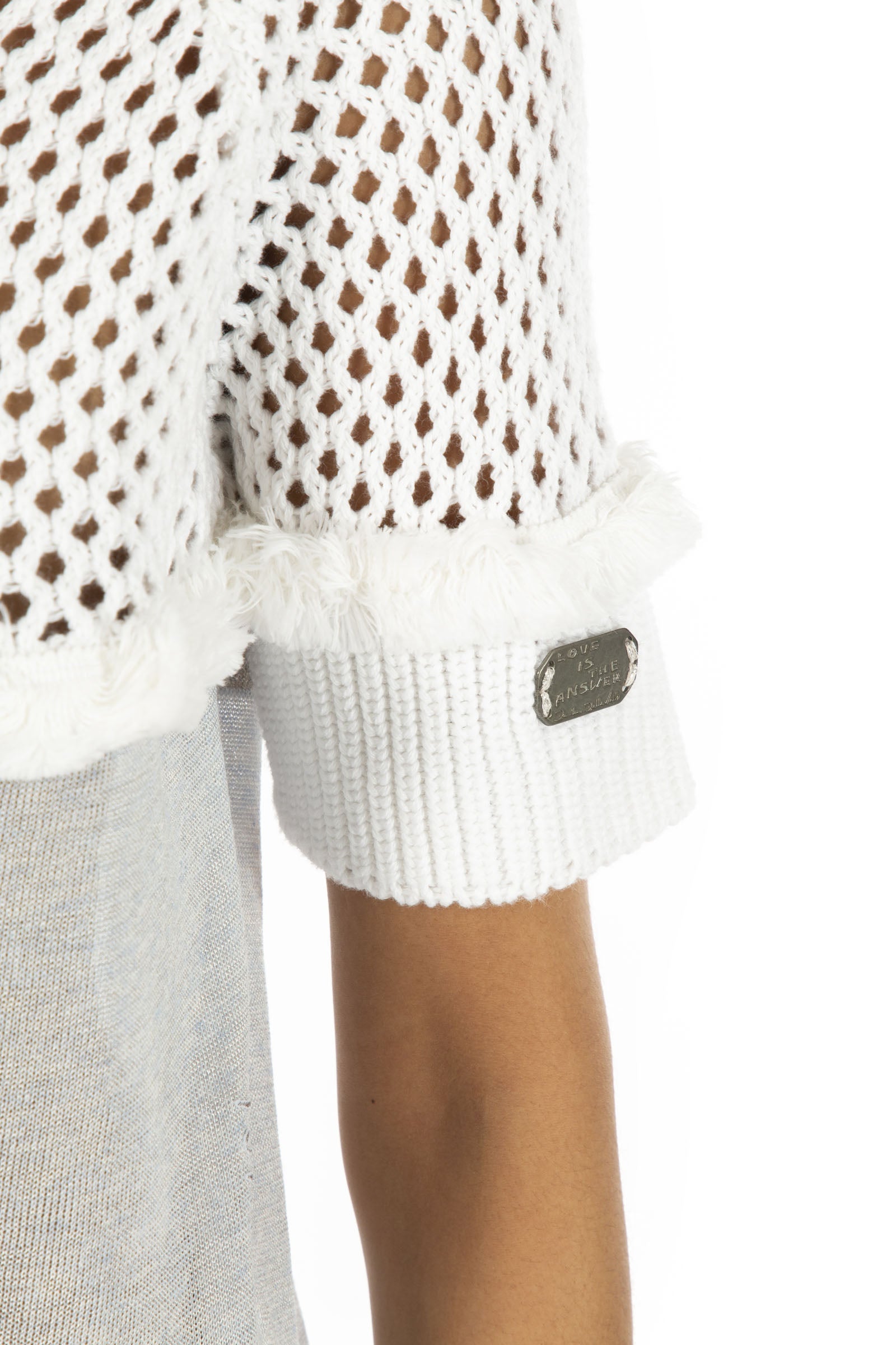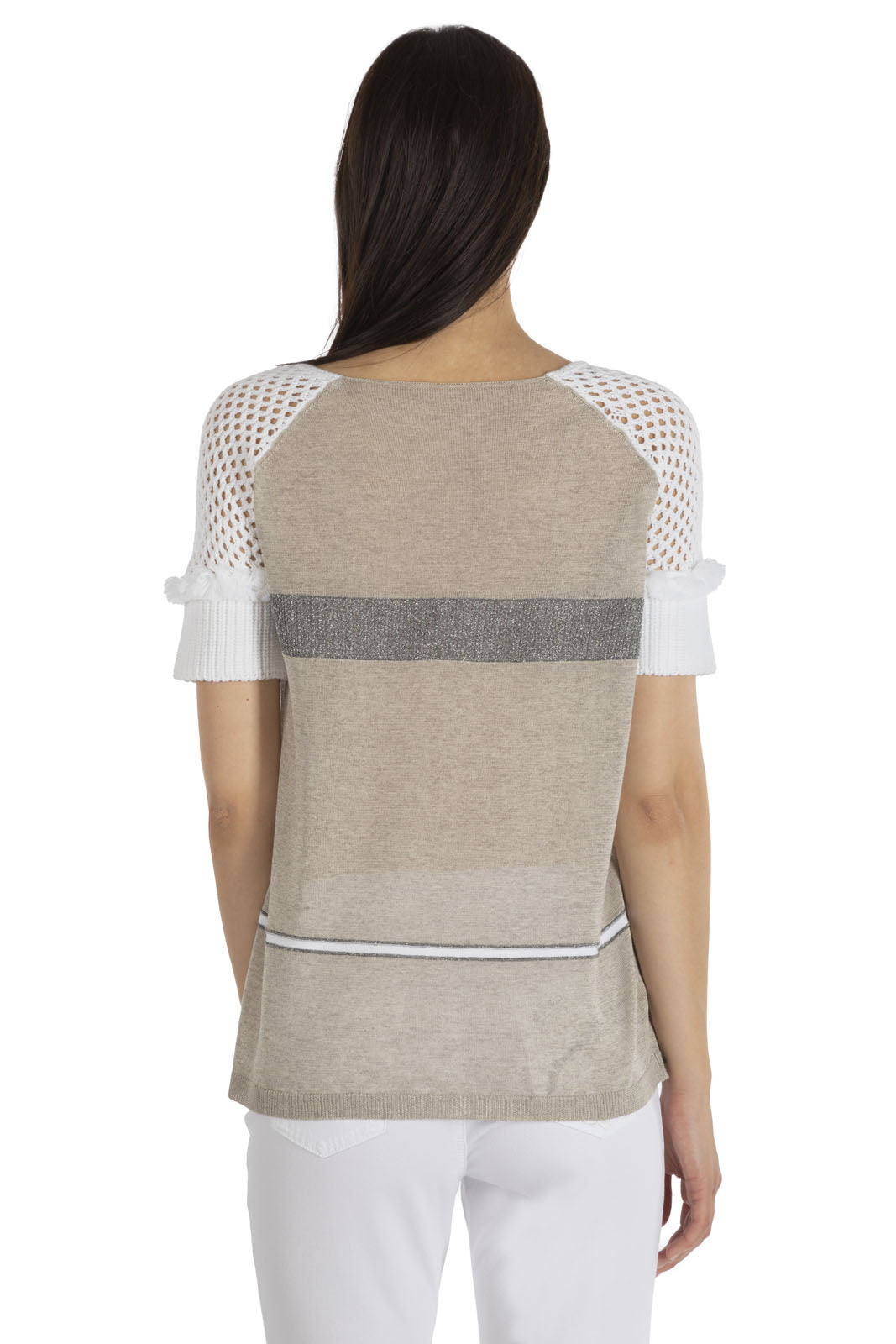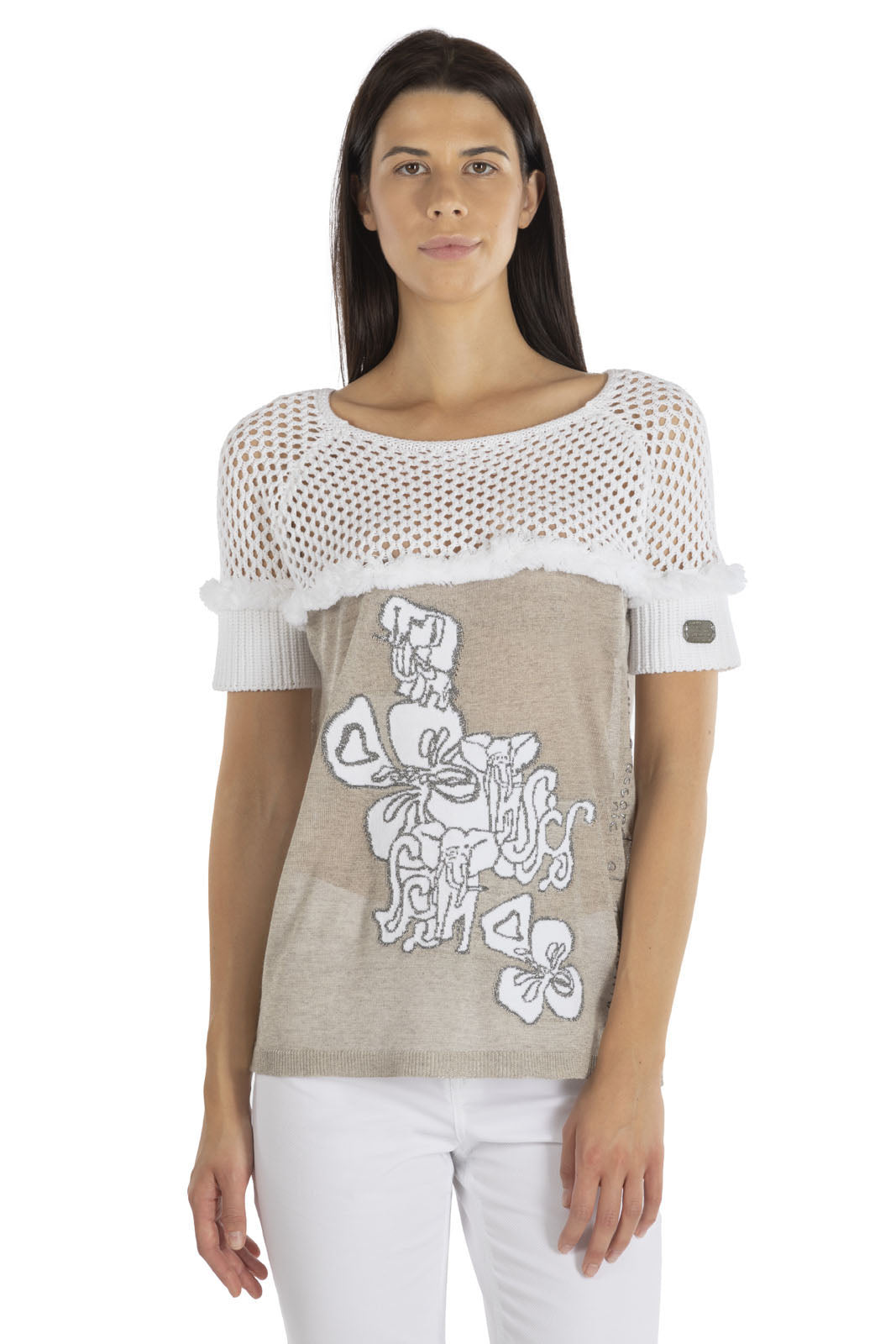 This summery knit top impresses with its airy openwork pattern and harmonious white and beige color scheme. With short sleeves, it offers comfortable wear on warm days, while its understated design makes it versatile enough to combine with other pieces. A perfect garment for style-conscious women who prefer light and elegant fashion.