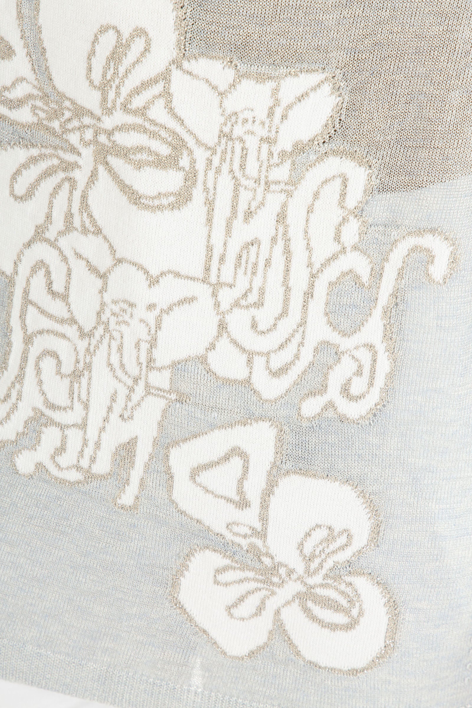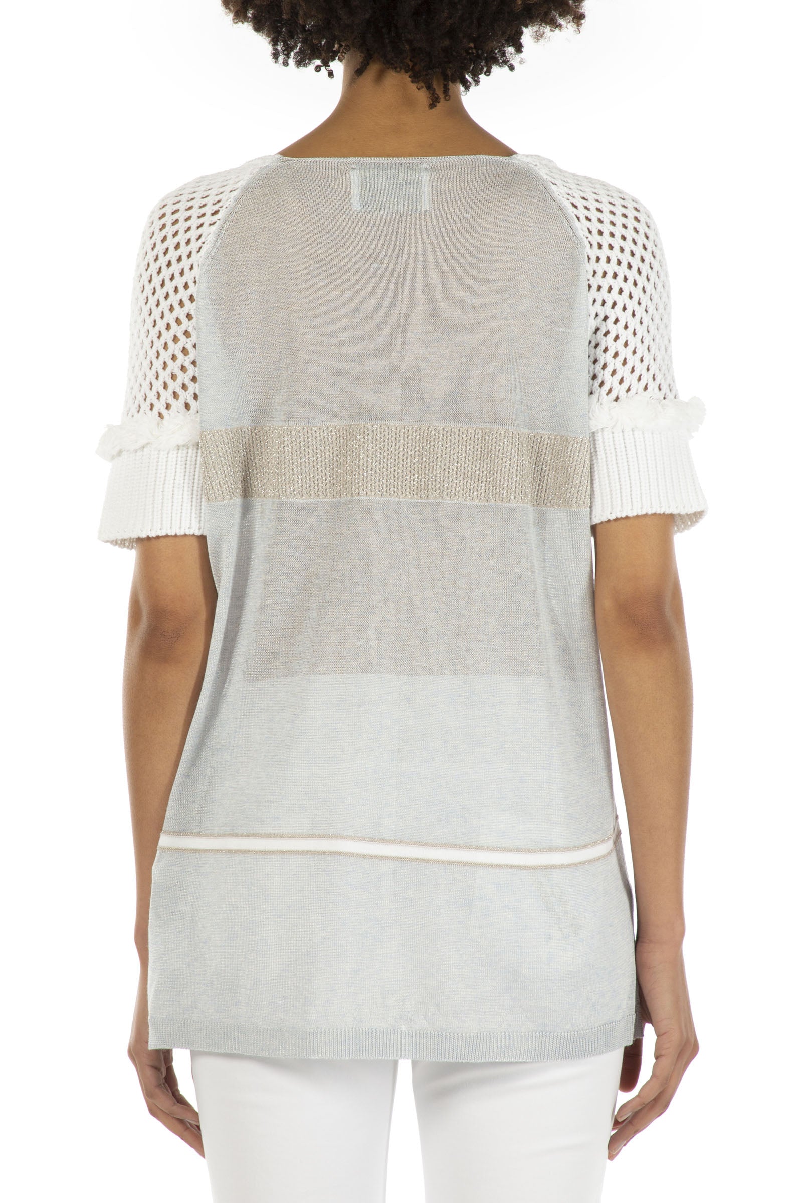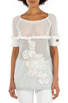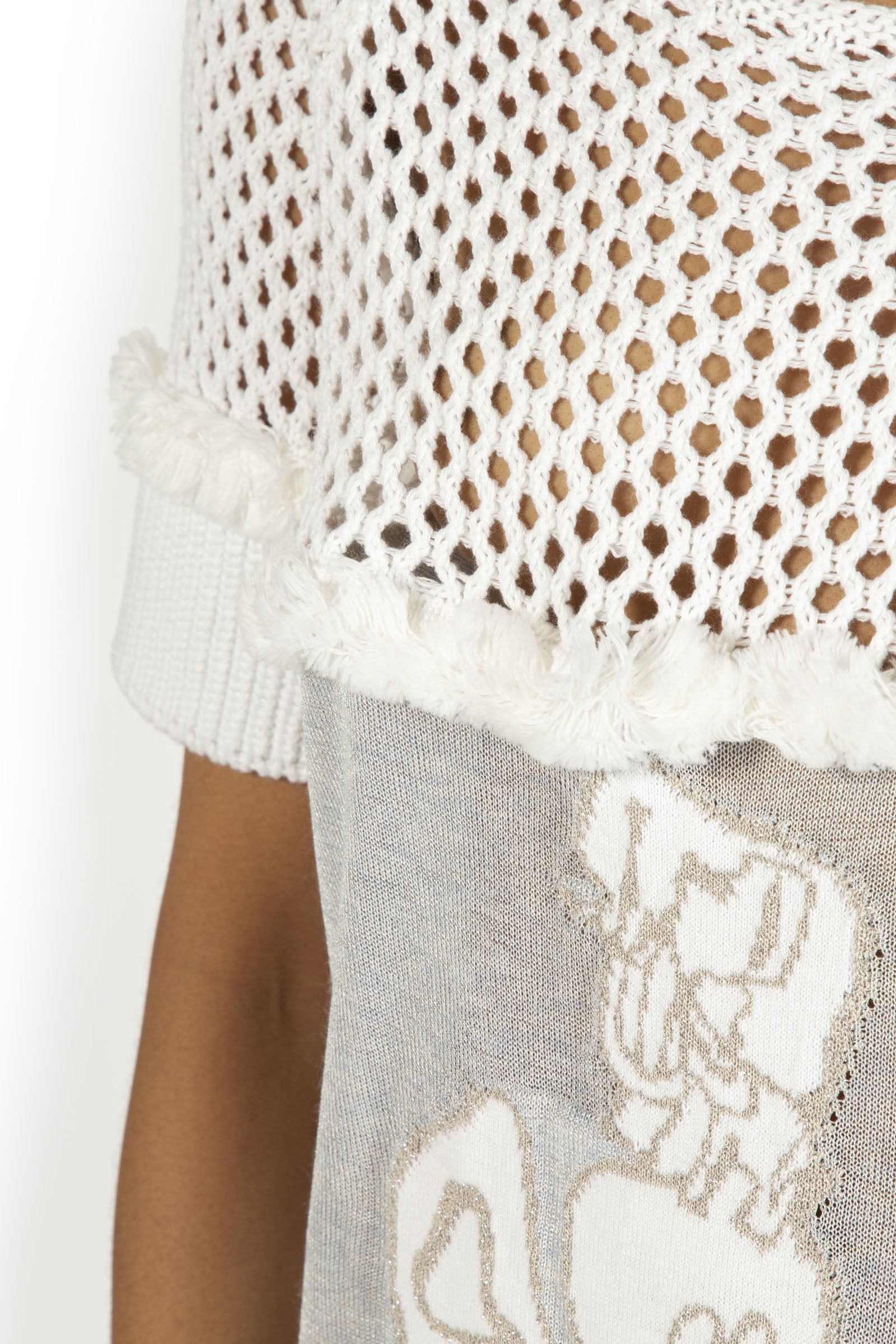 This summery knit top impresses with its airy openwork pattern and harmonious white and beige color scheme. With short sleeves, it offers comfortable wear on warm days, while its understated design makes it versatile enough to combine with other pieces. A perfect garment for style-conscious women who prefer light and elegant fashion.