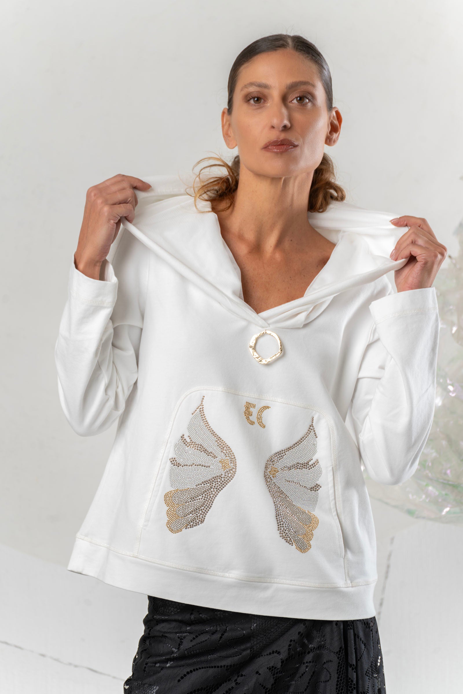 Dieser stylische Hoodie überzeugt mit einem modernen, cleanen Design und besonderen Details. Die dekorative Flügel-Applikation auf der Front setzt einen ausdrucksstarken Akzent, während die Kapuze mit edlem Schmuckring dem Look eine raffinierte Note verleiht. Ein bequemes Statement-Piece, das lässigen Komfort mit eleganter Ausstrahlung verbindet.