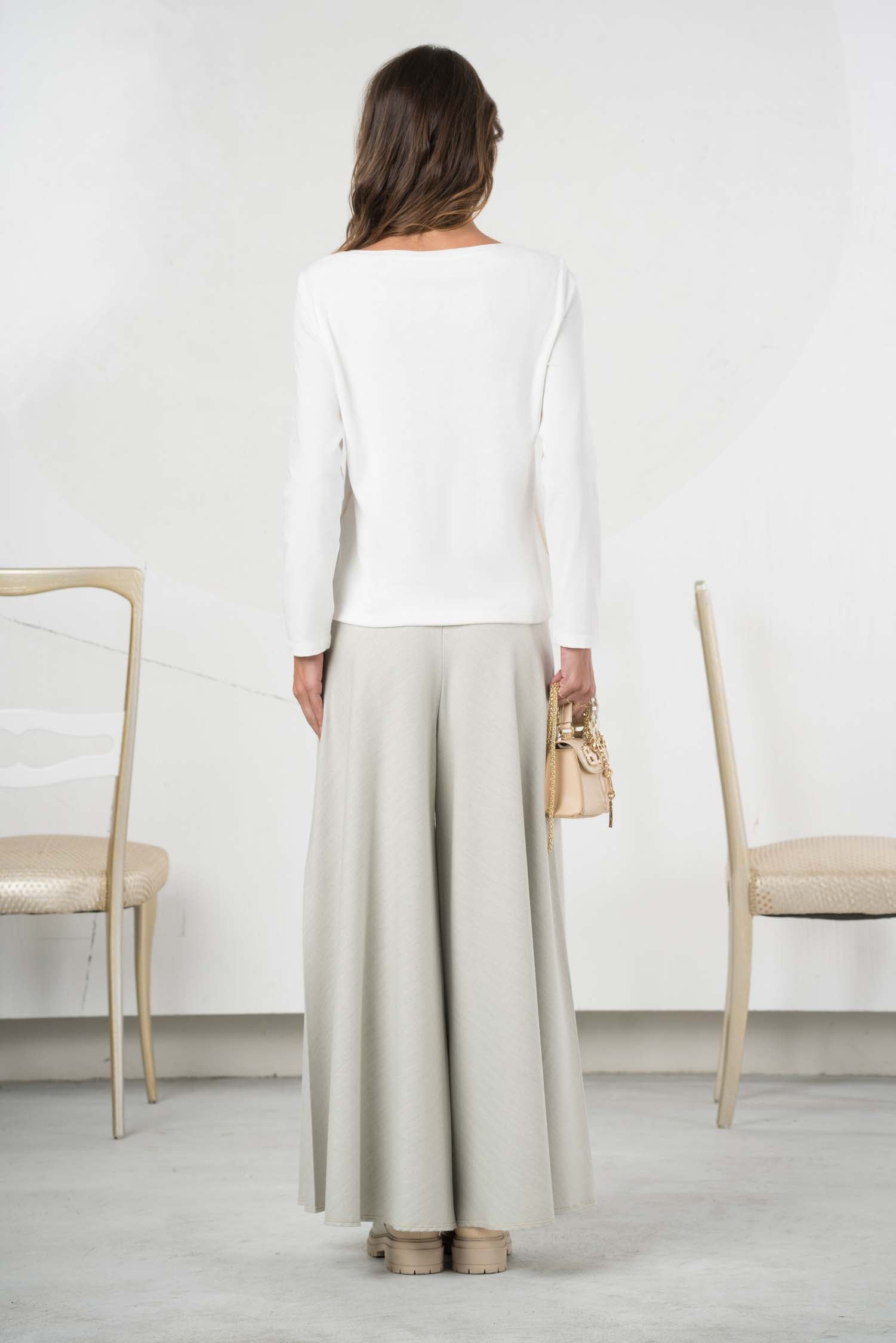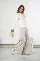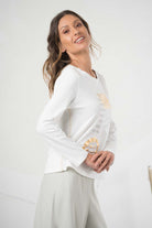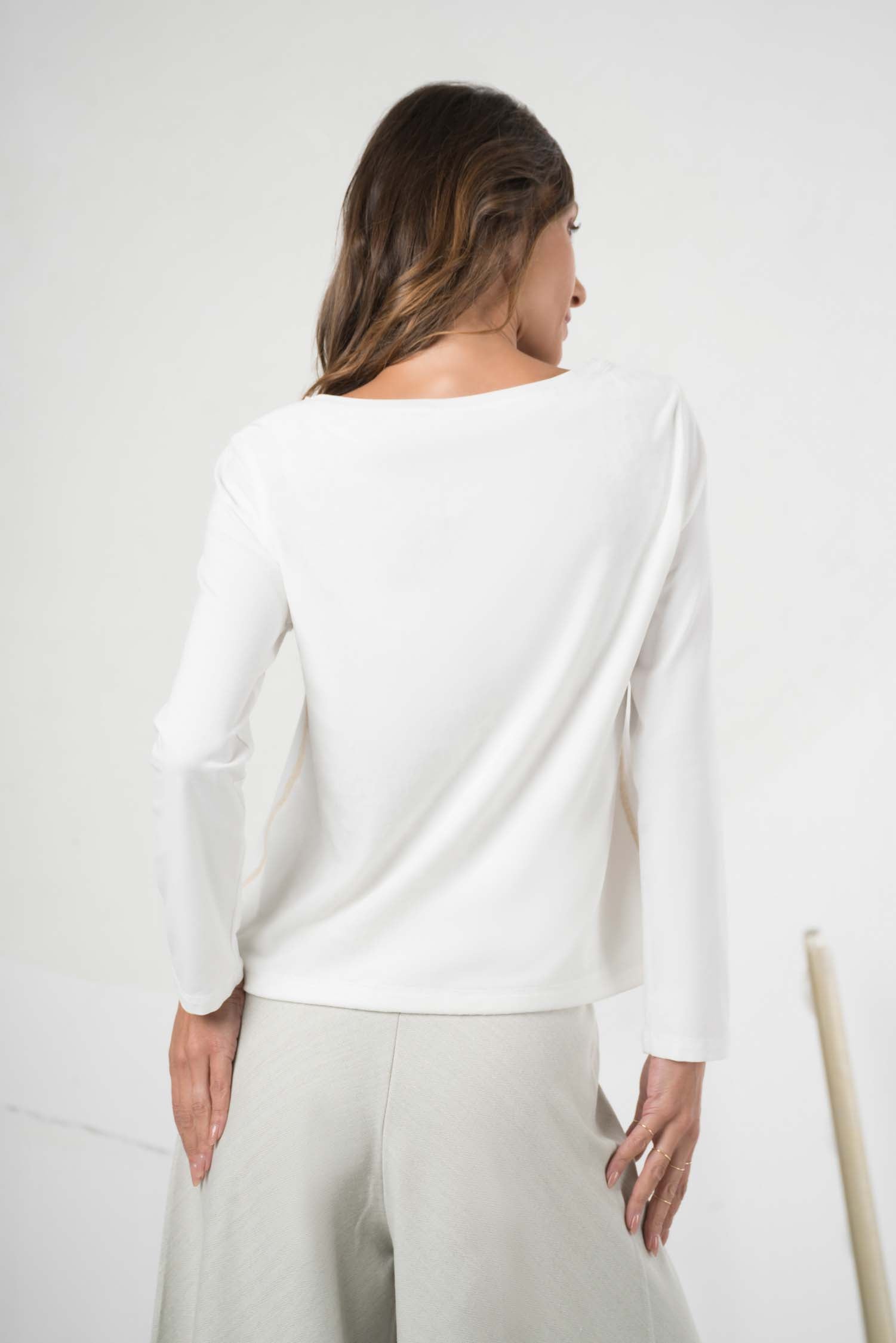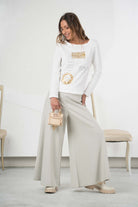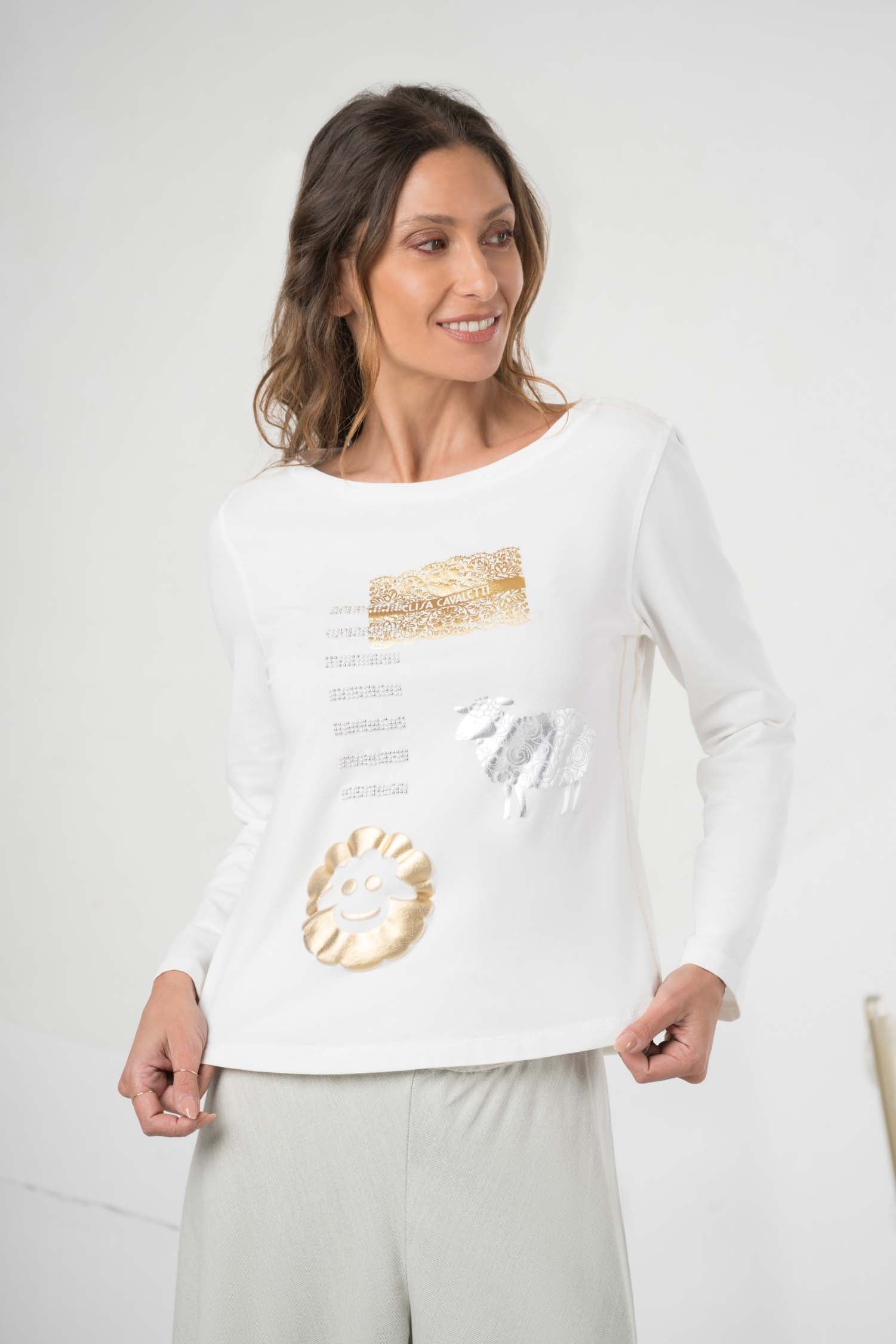 This stylish white long-sleeved sweatshirt features elegant gold and silver prints that subtly add a touch of luxury. It combines comfort with high-quality design and is ideal for sophisticated casual styles. The elegant metallic tones make it versatile and fashionable to style.