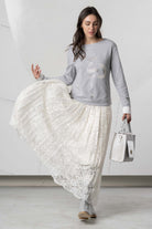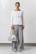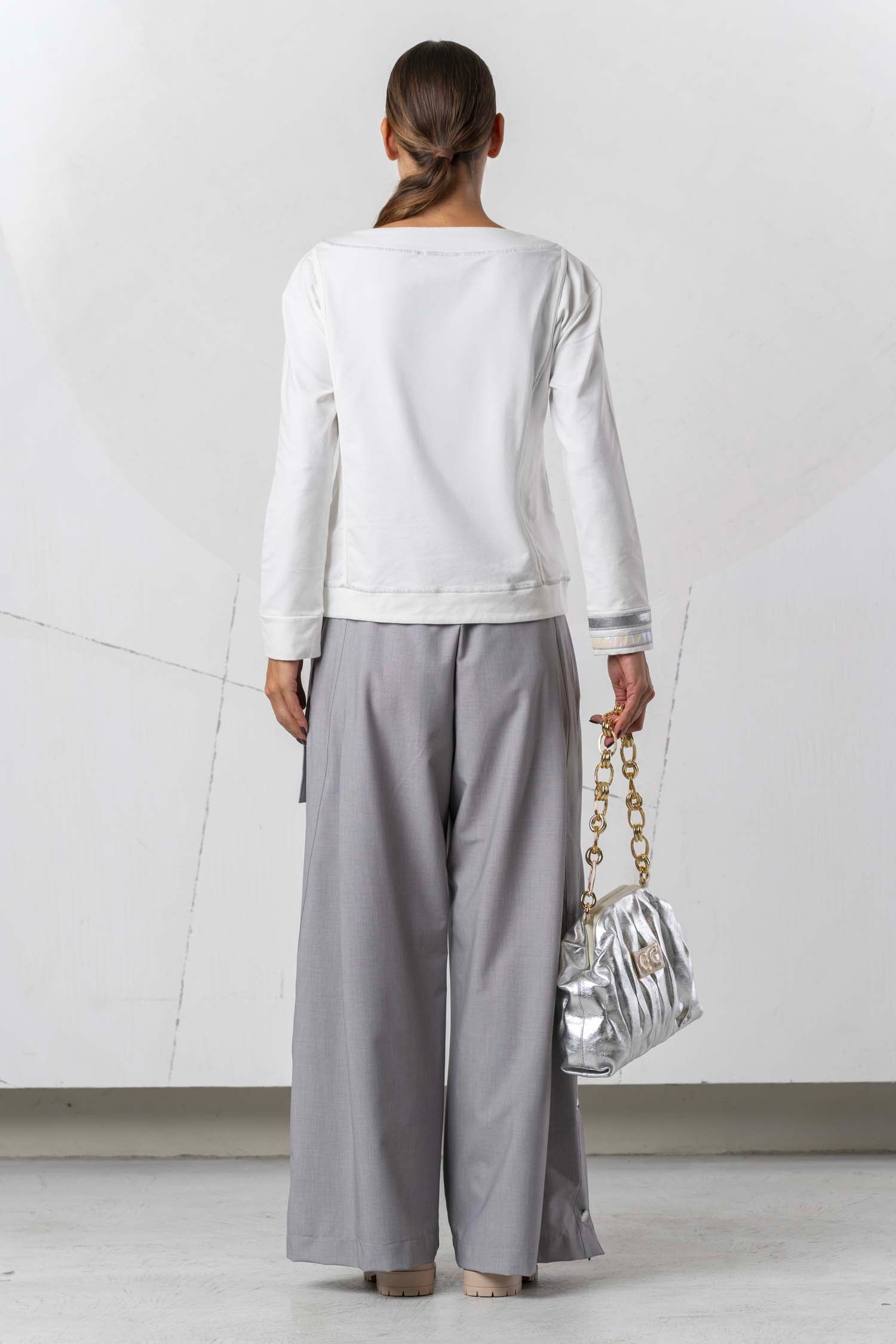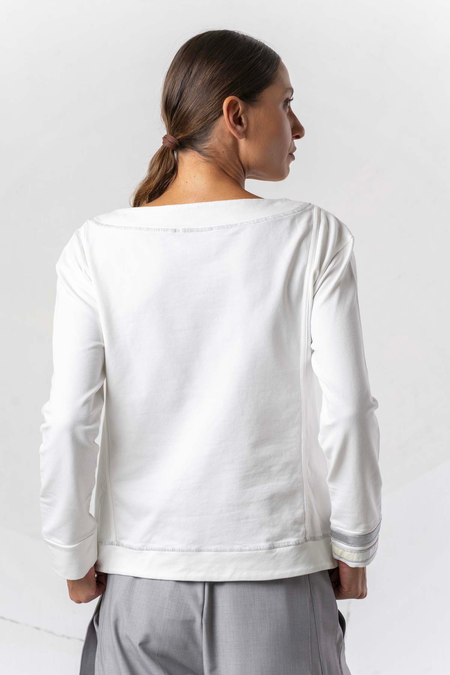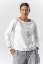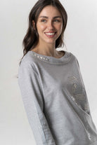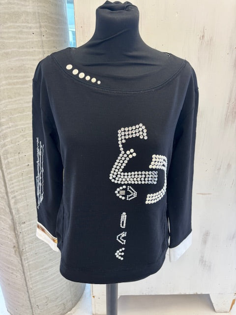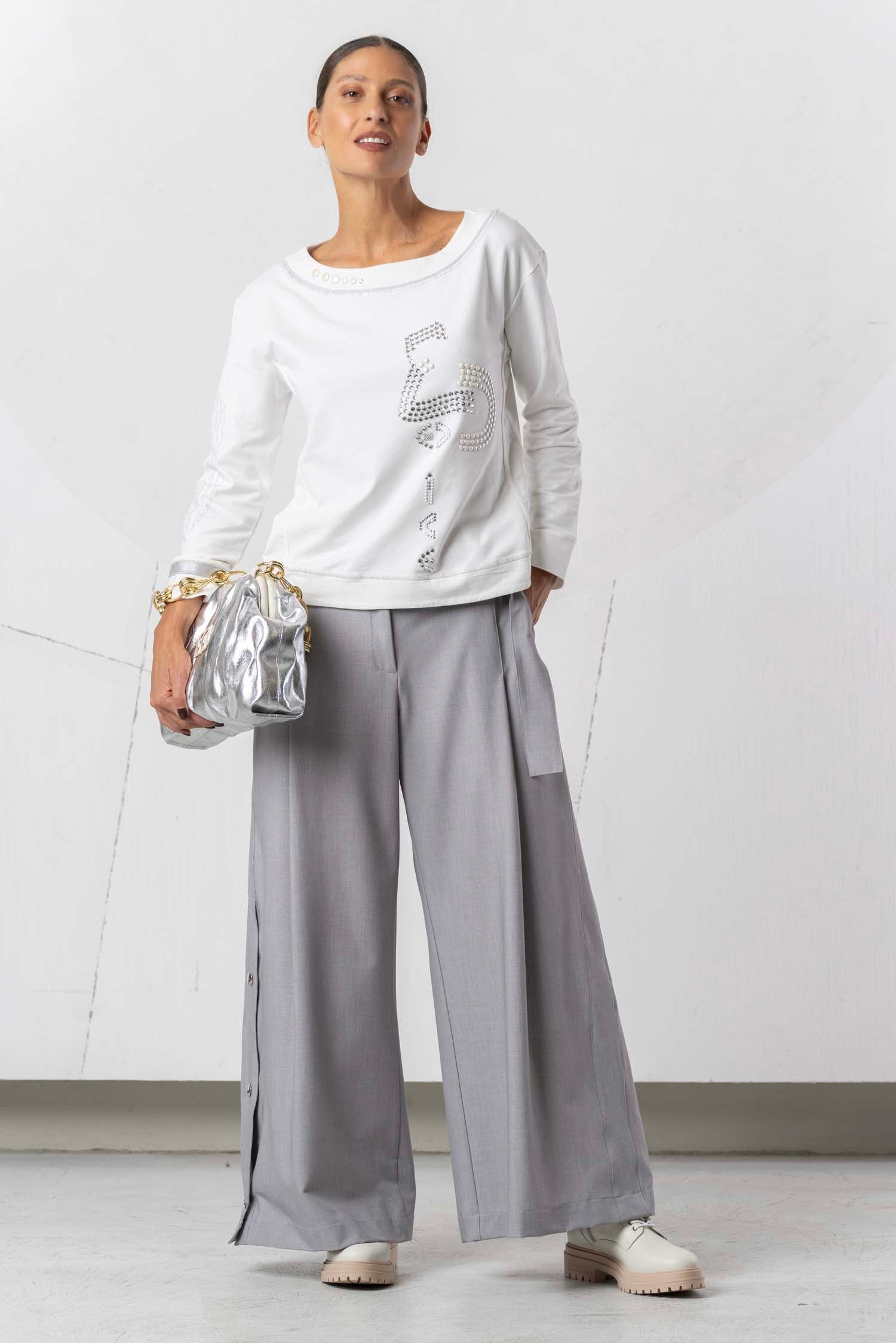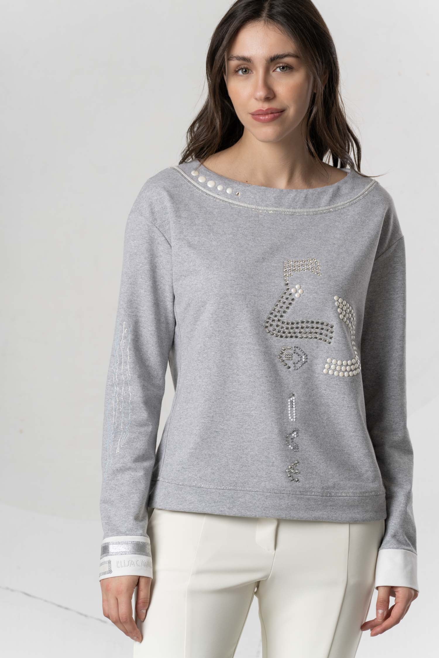 This long-sleeved sweatshirt impresses with its stylish design and is available in three different colors. With varied appliqués and sparkling rhinestone details, it adds elegant accents and lends a special touch to any outfit. Ideal for fashion-conscious wearers who value comfort and a sophisticated look.