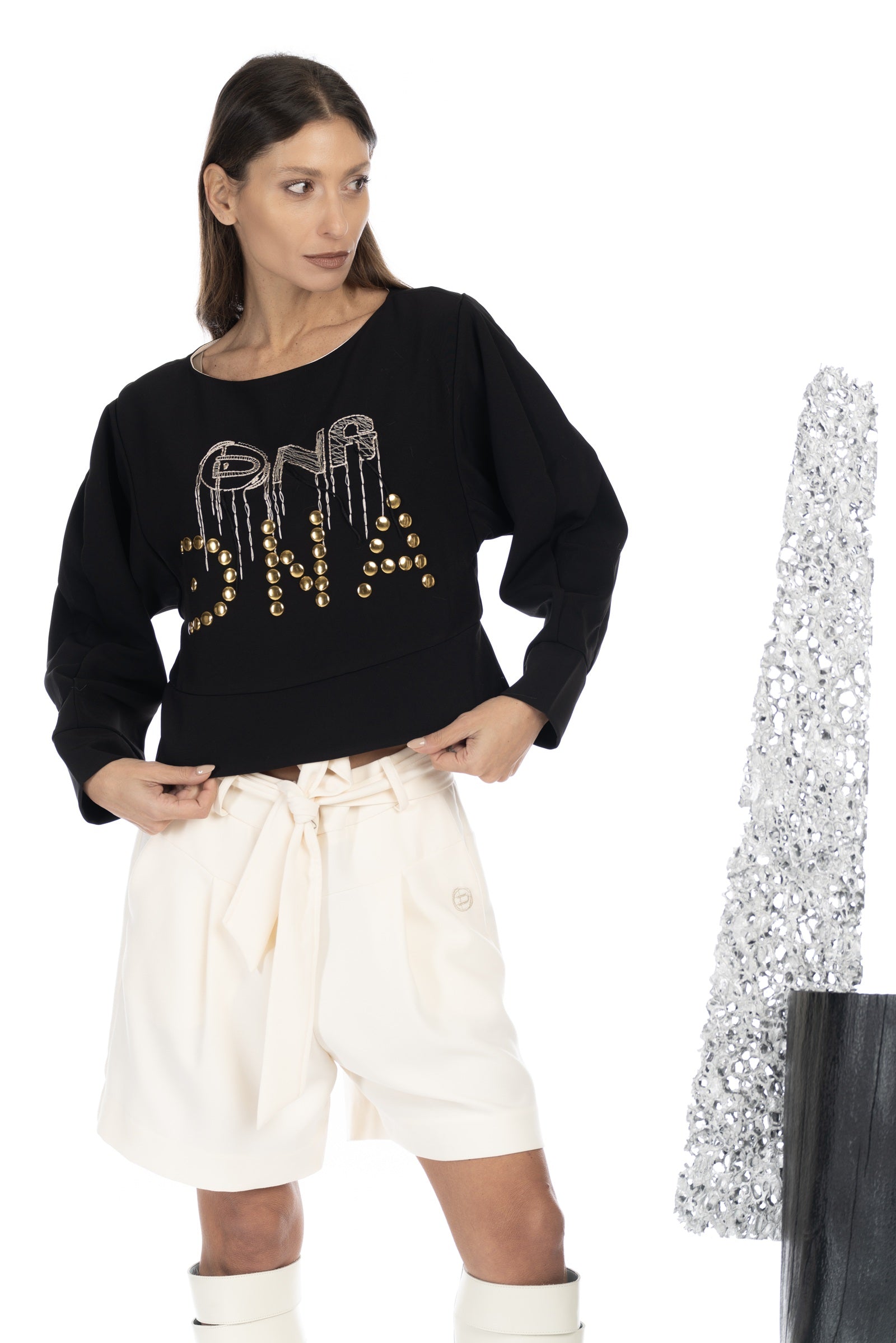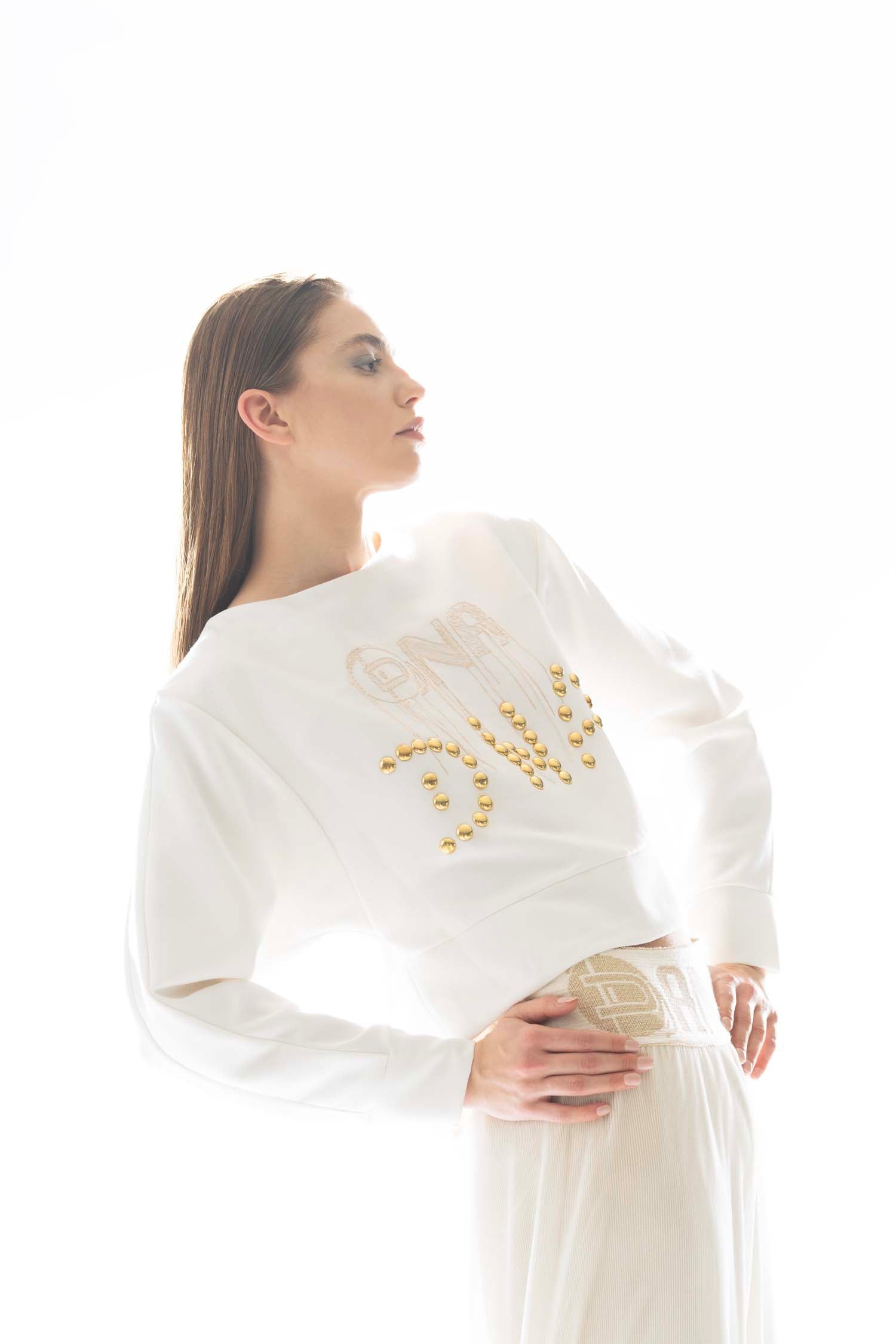 Add sparkle and style to your wardrobe with the DANIELA DALLAVALLE Black and White Sweatshirt. This beautifully designed sweatshirt comes in classic black and white and is embellished with large rhinestones that will elevate any outfit. Be stylish and shine with this must-have piece!