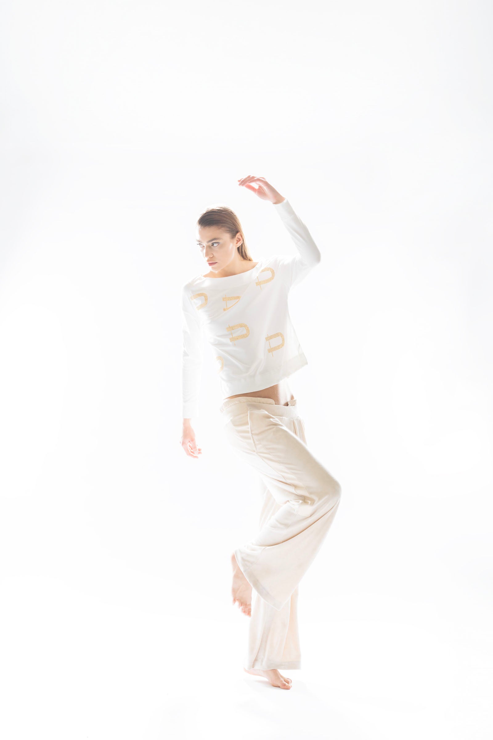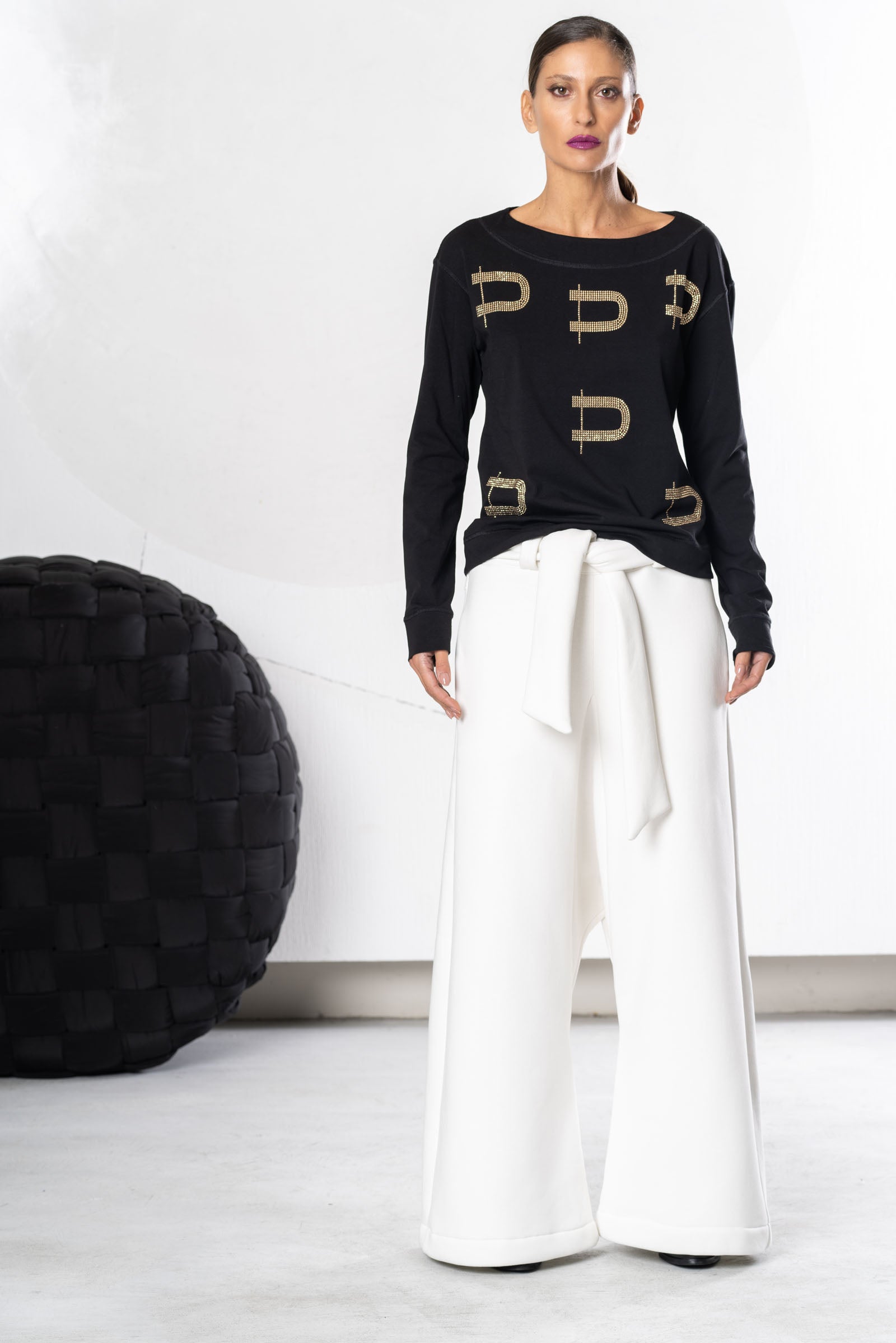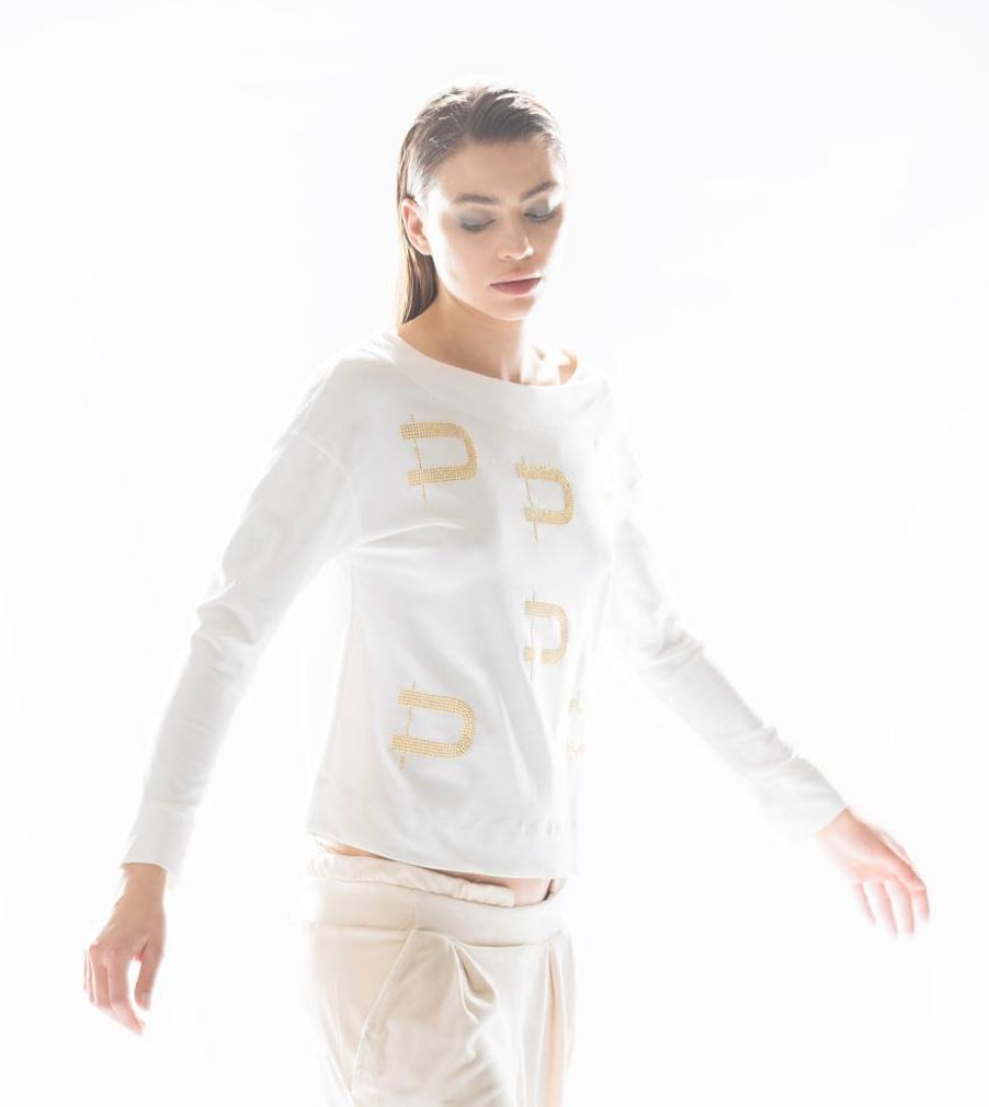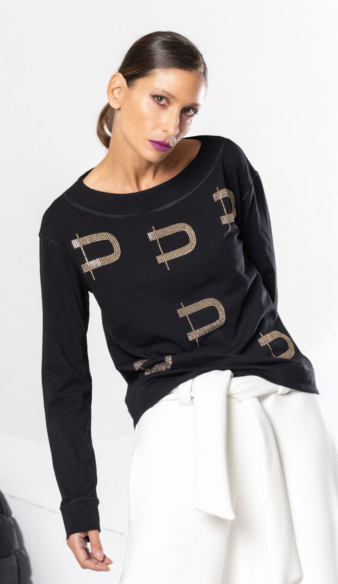 Choose the DANIELA DALLAVALLE sweatshirt in black and white. The cool gold lettering gives the shirt a unique look. The perfect garment for anyone who values ​​style and comfort. Get your new favorite sweatshirt now!