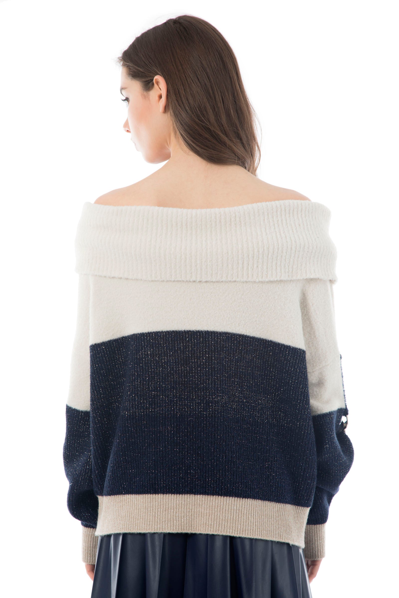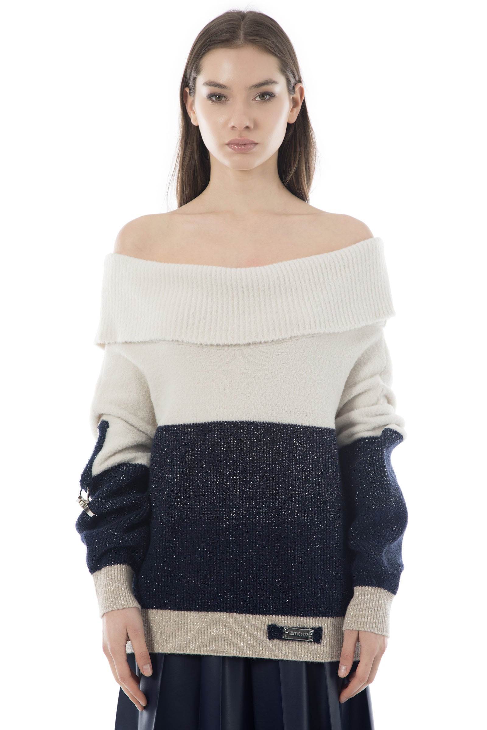 Cozy and distinctive, the Flauto Oboe sweater is the perfect companion on cold days. This soft, beige-dark blue sweater with an off-the-shoulder design impresses with its stylish look and pleasantly soft material. Add a touch of luxury to your outfit while staying comfortably warm. An absolute must-have for your wardrobe!