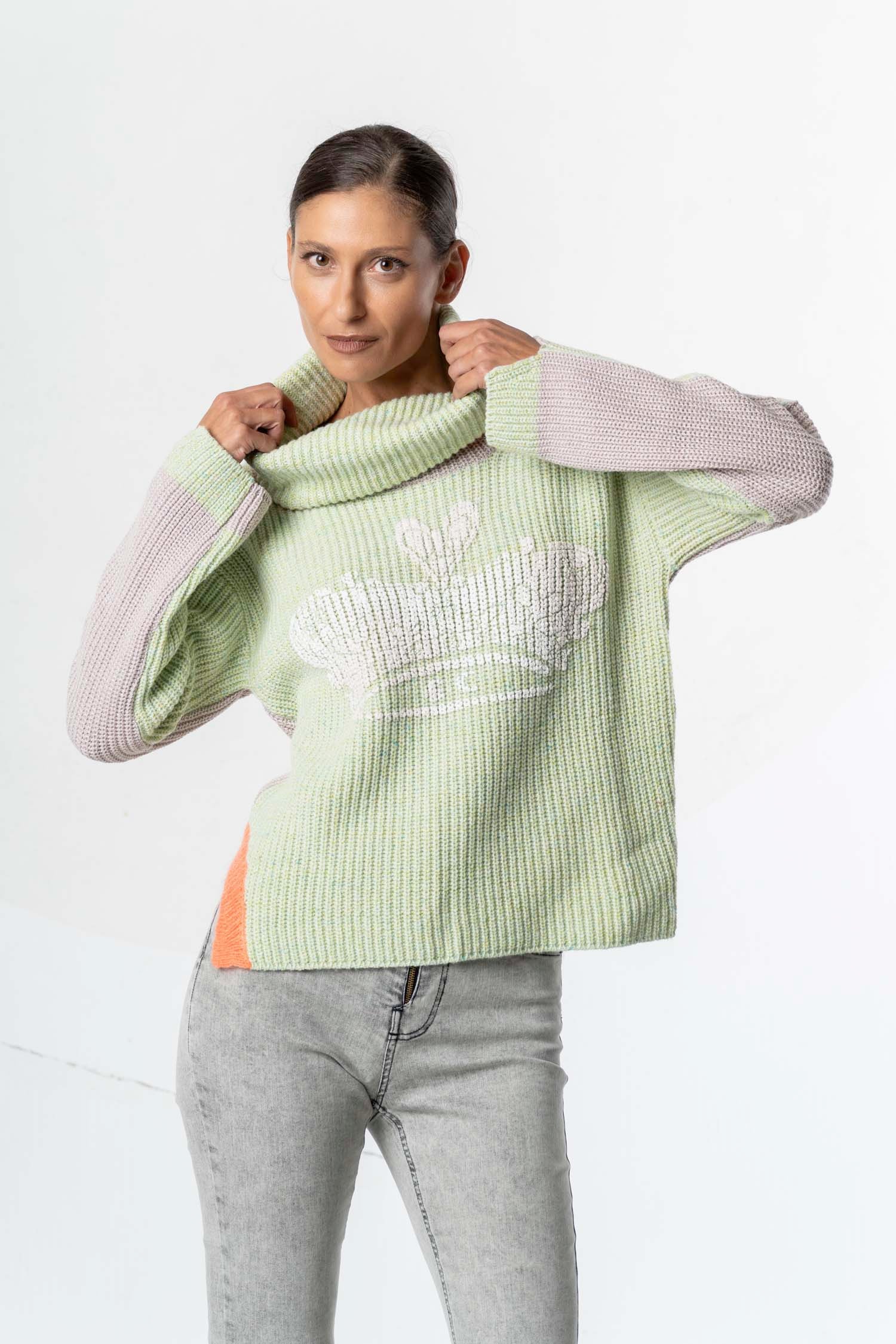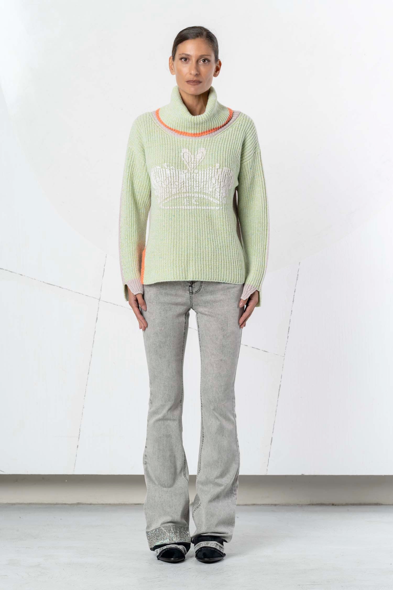A real eye-catcher: the ELISA CAVALETTI Pianoforte Organo sweater in elegant wool and cashmere! This beautiful knit sweater features a lovely mint green with pink appliqués, creating a stunning and vibrant combination. Feel radiant and enchanting – the Pianoforte Organo sweater is a must-have in your wardrobe!