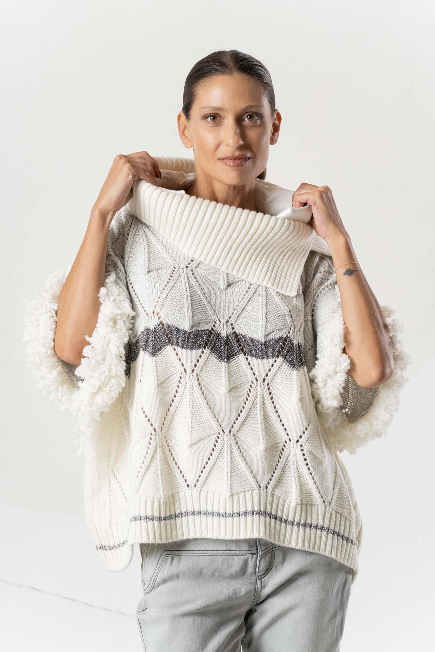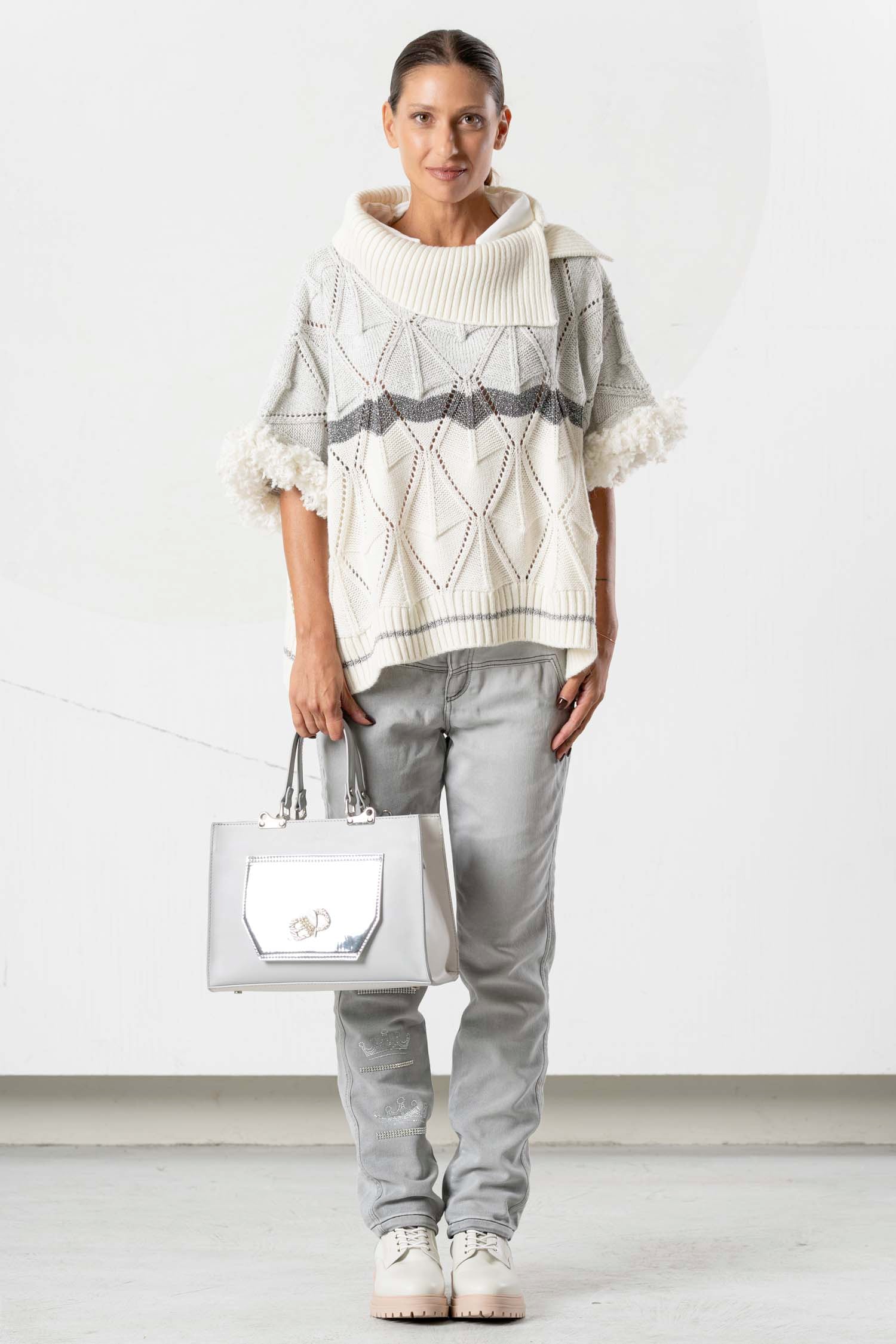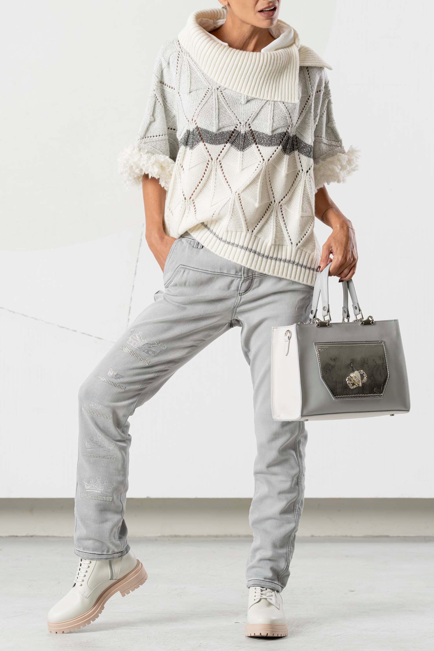 This stylish knit sweater impresses with its light beige tone and grey design, making it exceptionally versatile. Subtle fur appliqués add elegant accents, while a grey stripe underscores the modern look. A high-quality garment for sophisticated looks, featuring a unique texture and clean color scheme.