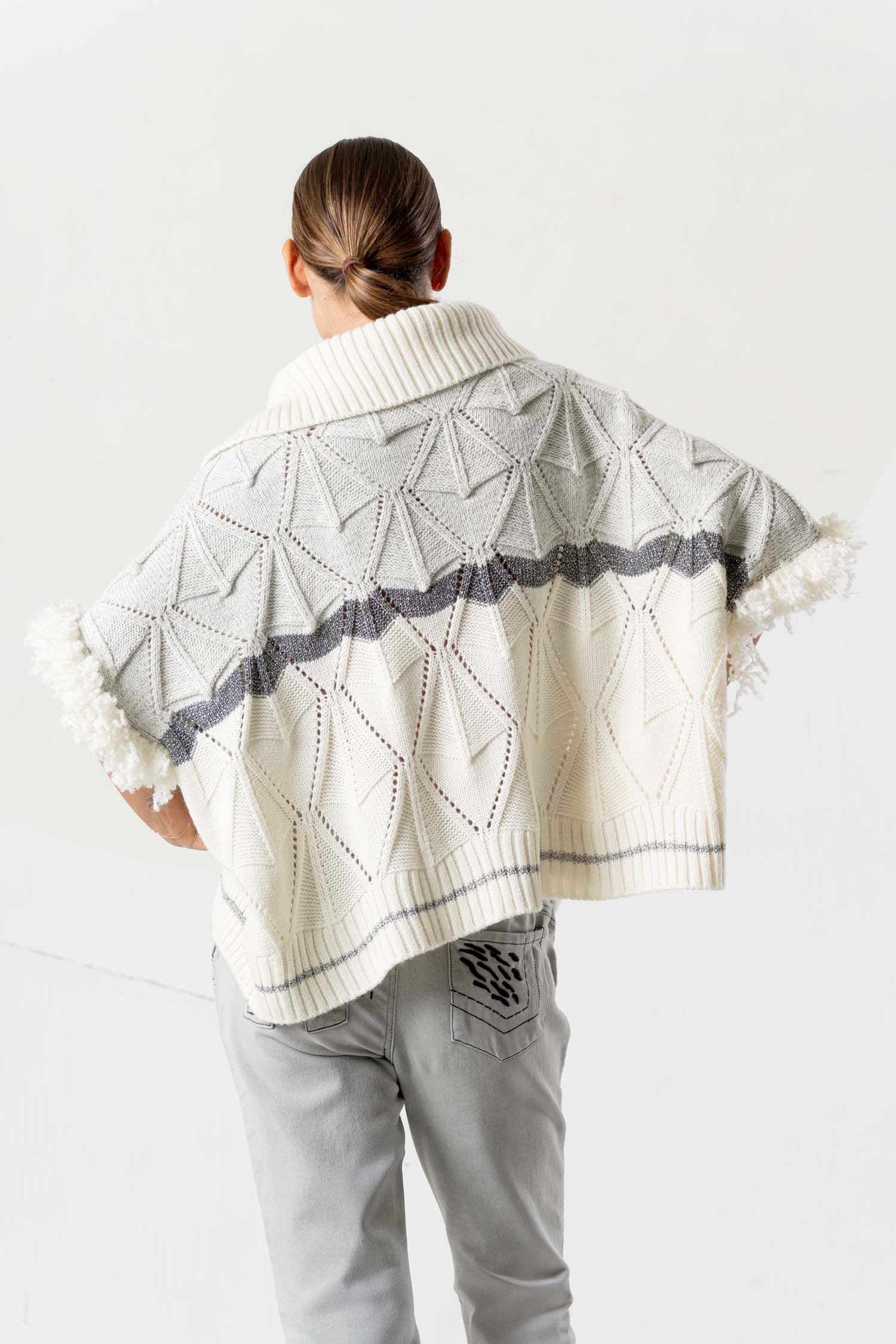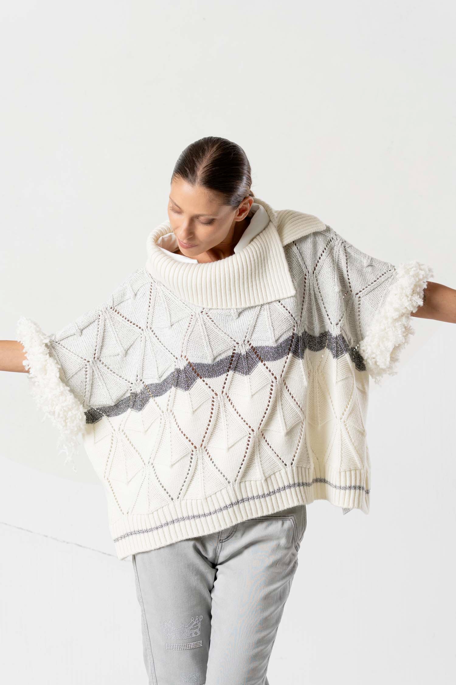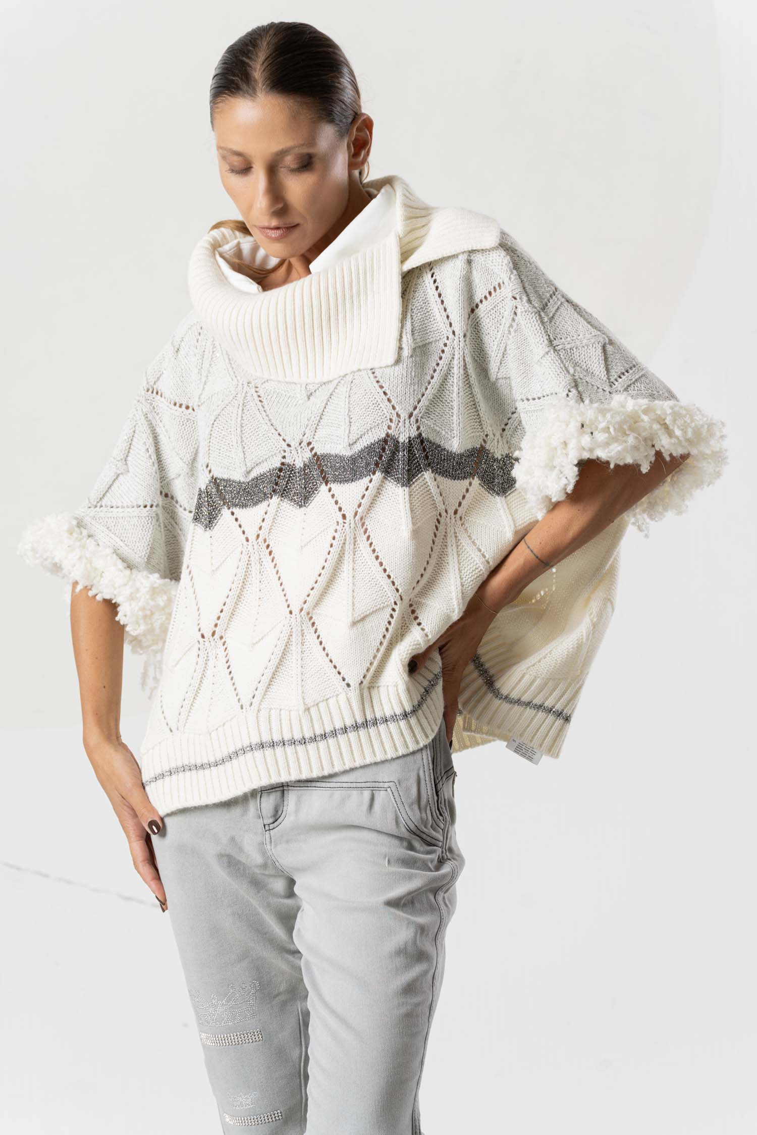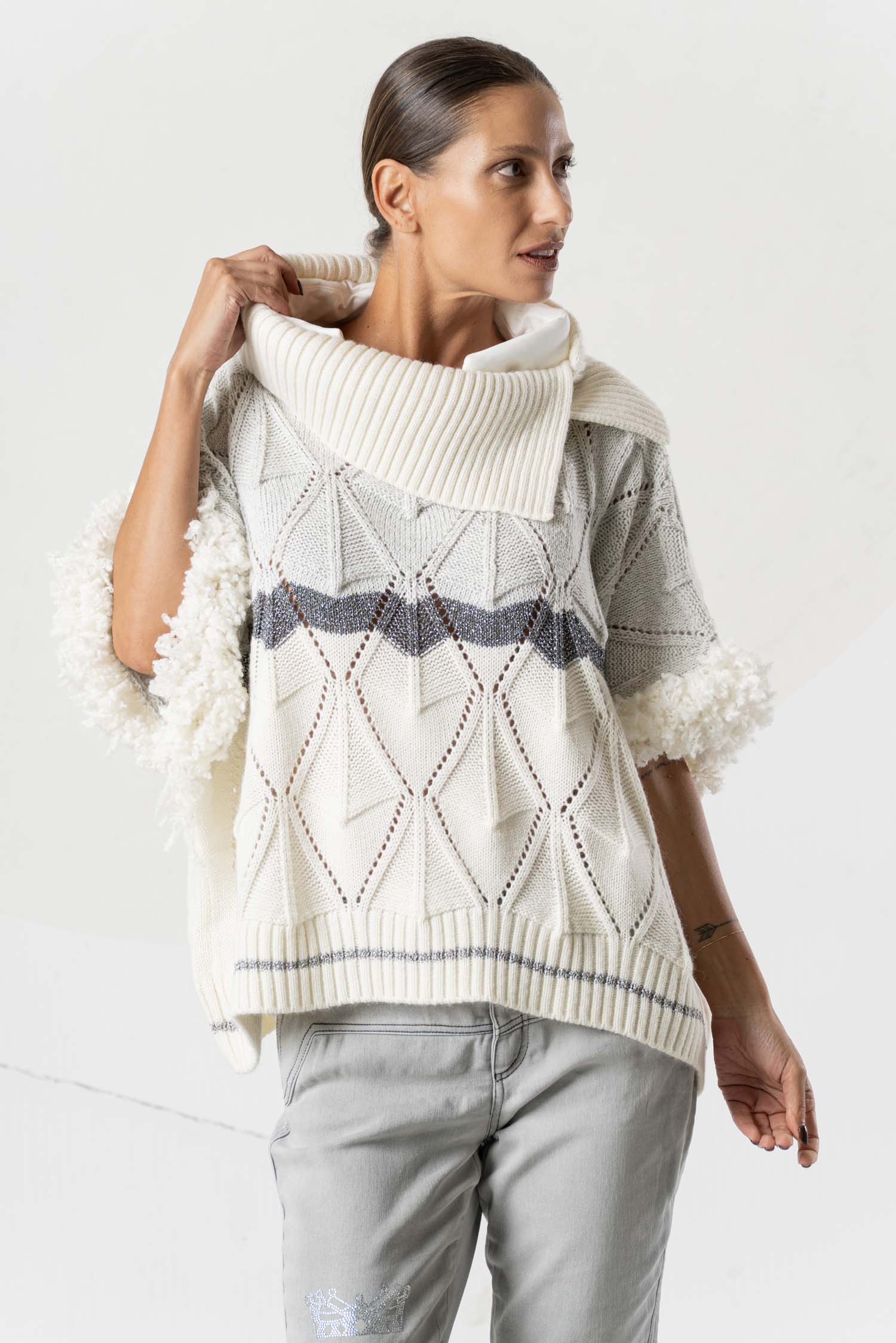 This stylish knit sweater impresses with its light beige tone and grey design, making it exceptionally versatile. Subtle fur appliqués add elegant accents, while a grey stripe underscores the modern look. A high-quality garment for sophisticated looks, featuring a unique texture and clean color scheme.