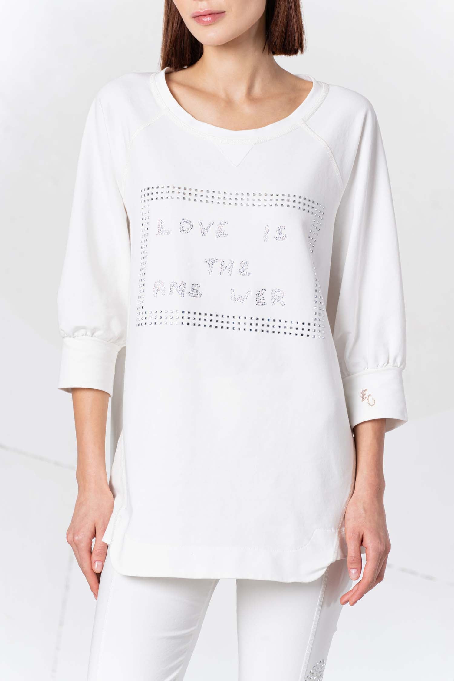 Experience luxury with our ELISA CAVALETTI Bianco sweatshirt. Enjoy the stunning white fabric and glamorous lettering adorned with silver rhinestones. This unique combination of elegance and functionality will captivate you! Get this exquisite sweatshirt now and feel like a true fashionista.