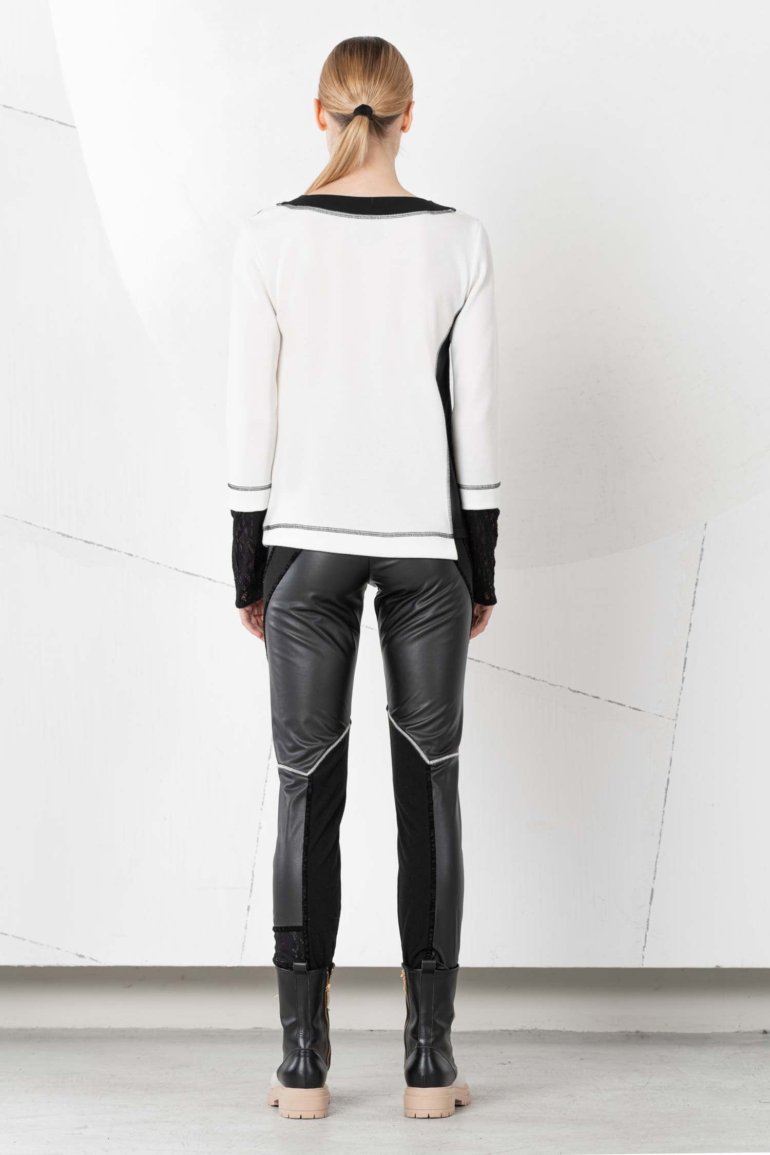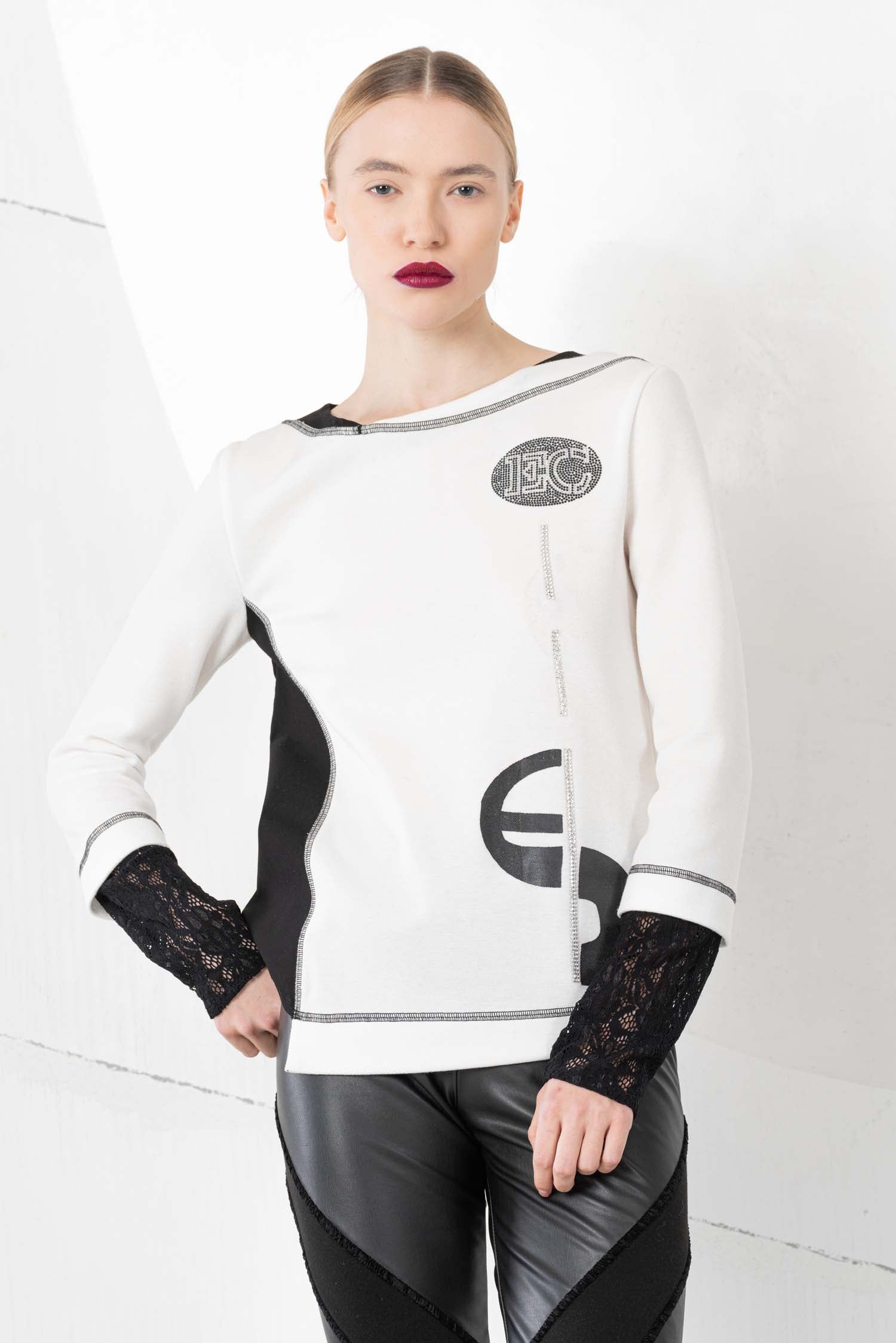 Transform your look with the ELISA CAVALETTI Incontro-Nero sweatshirt. Elegant white with artful black appliqués, it exudes a touch of sophistication. The lace sleeves add a feminine touch. The perfect garment for an unforgettable appearance!
