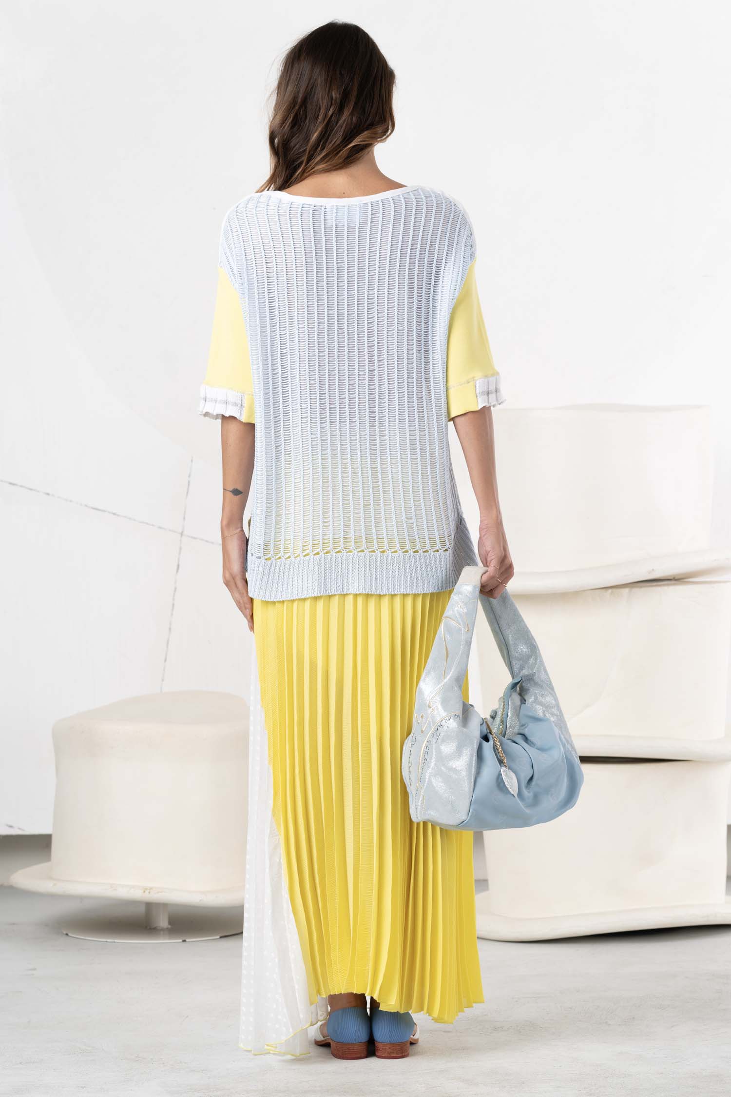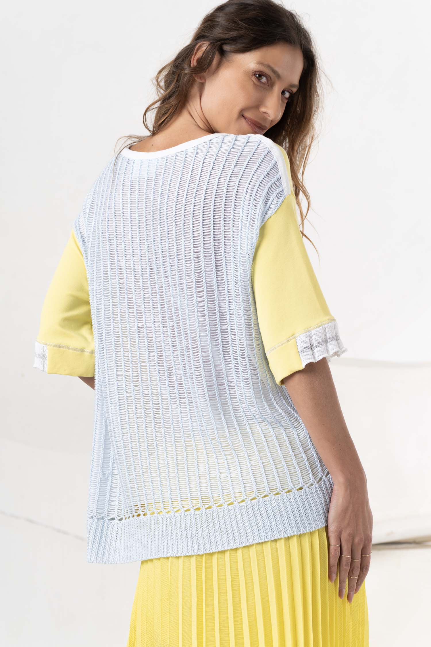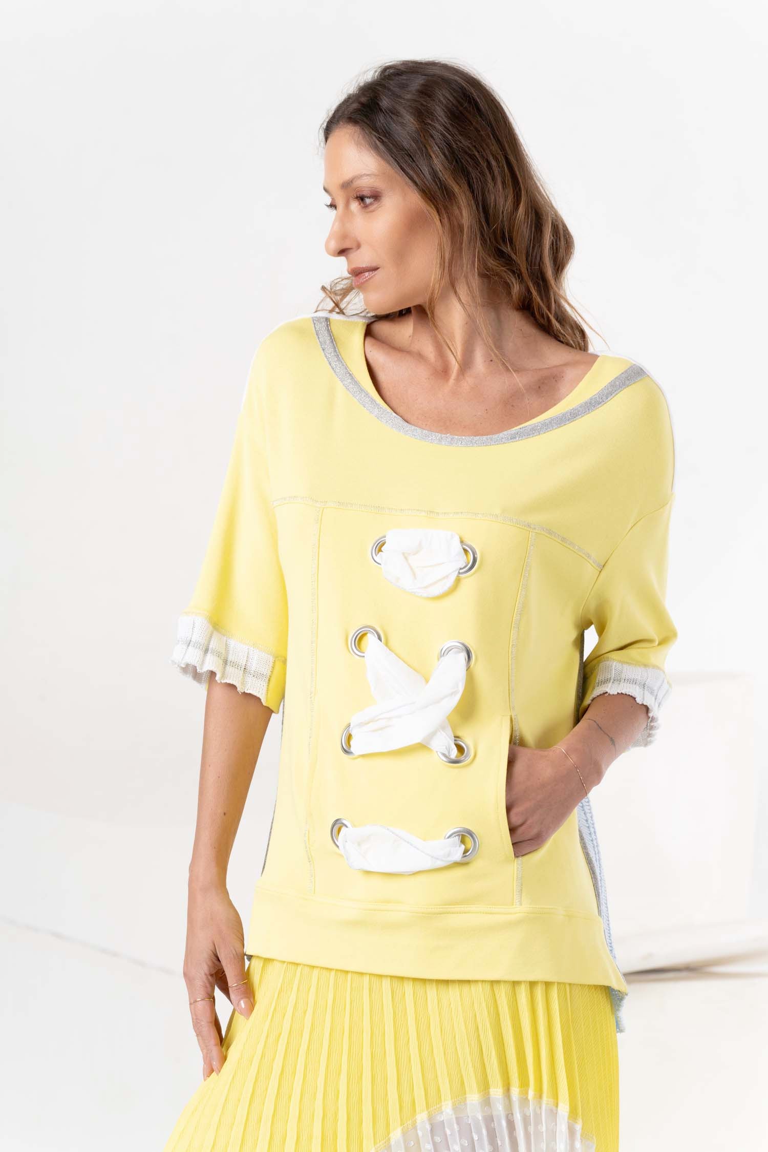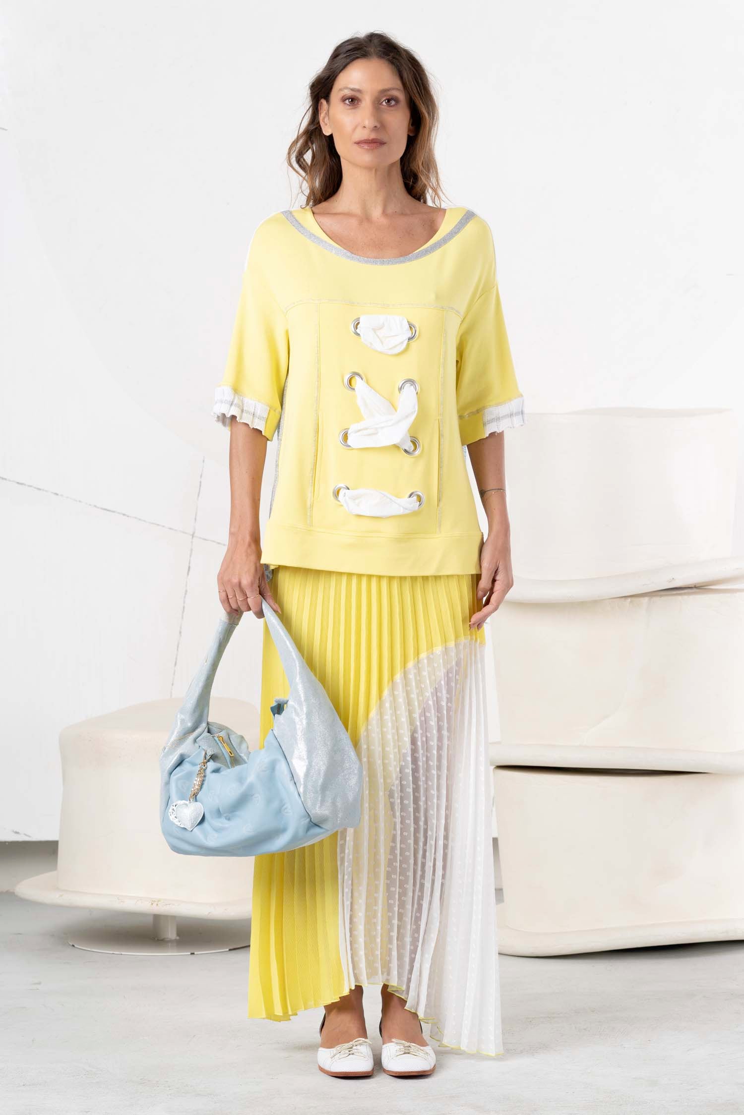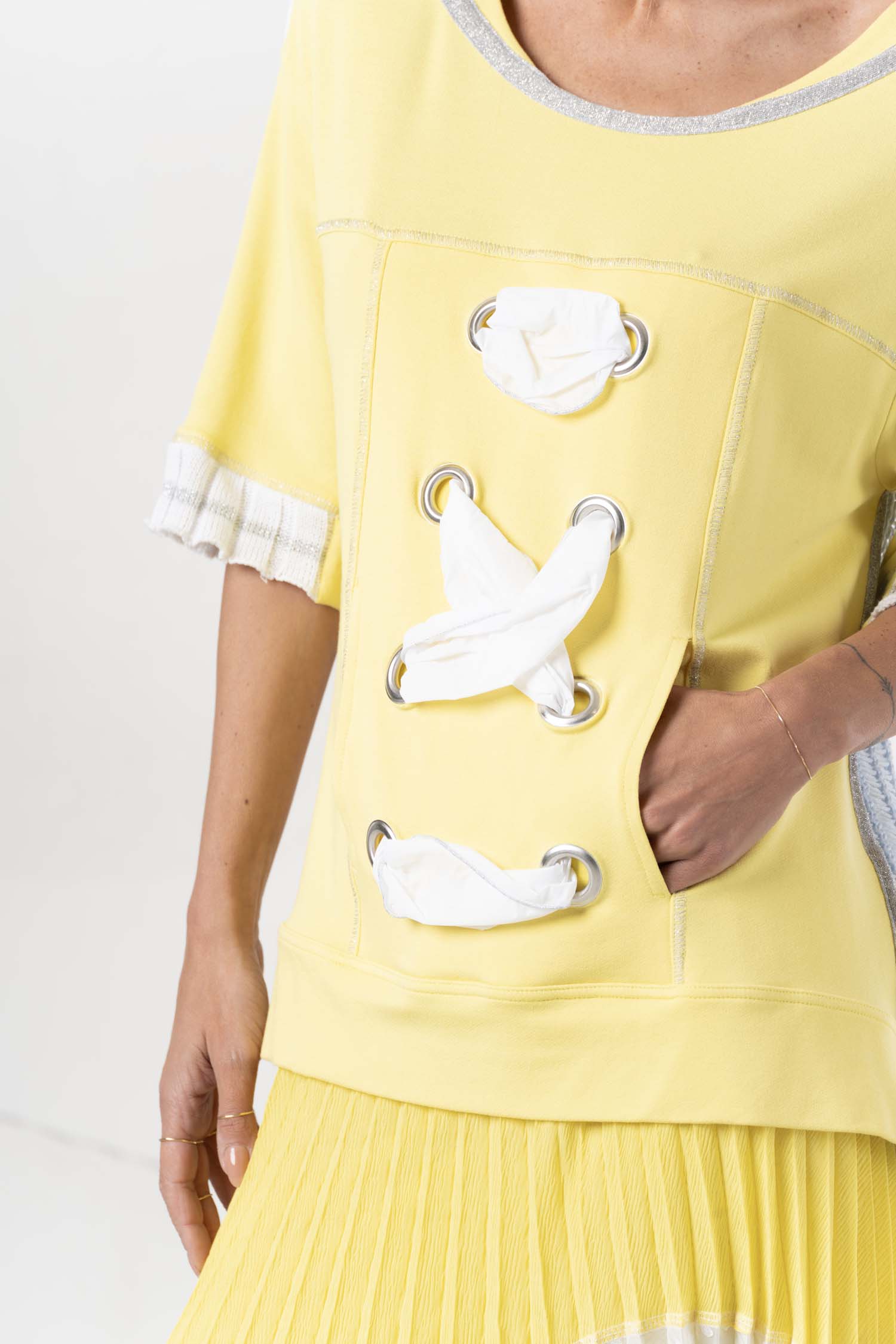 Discover the stylish side of ELISA CAVALETTI with the Mimosa sweatshirt. This yellow T-shirt is adorned with a beautiful white cross pattern, making it a real eye-catcher. A must-have for a modern and trendy look!