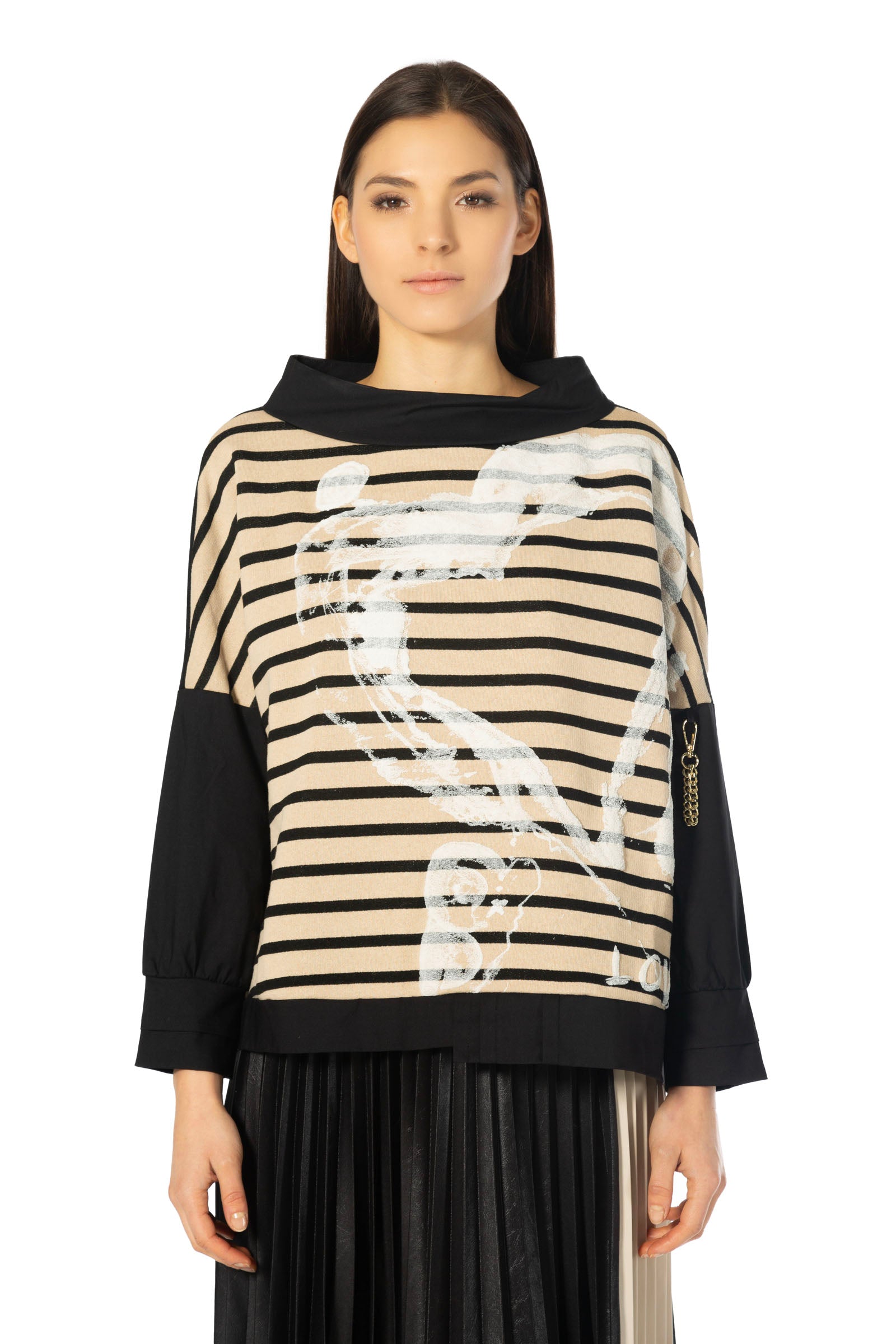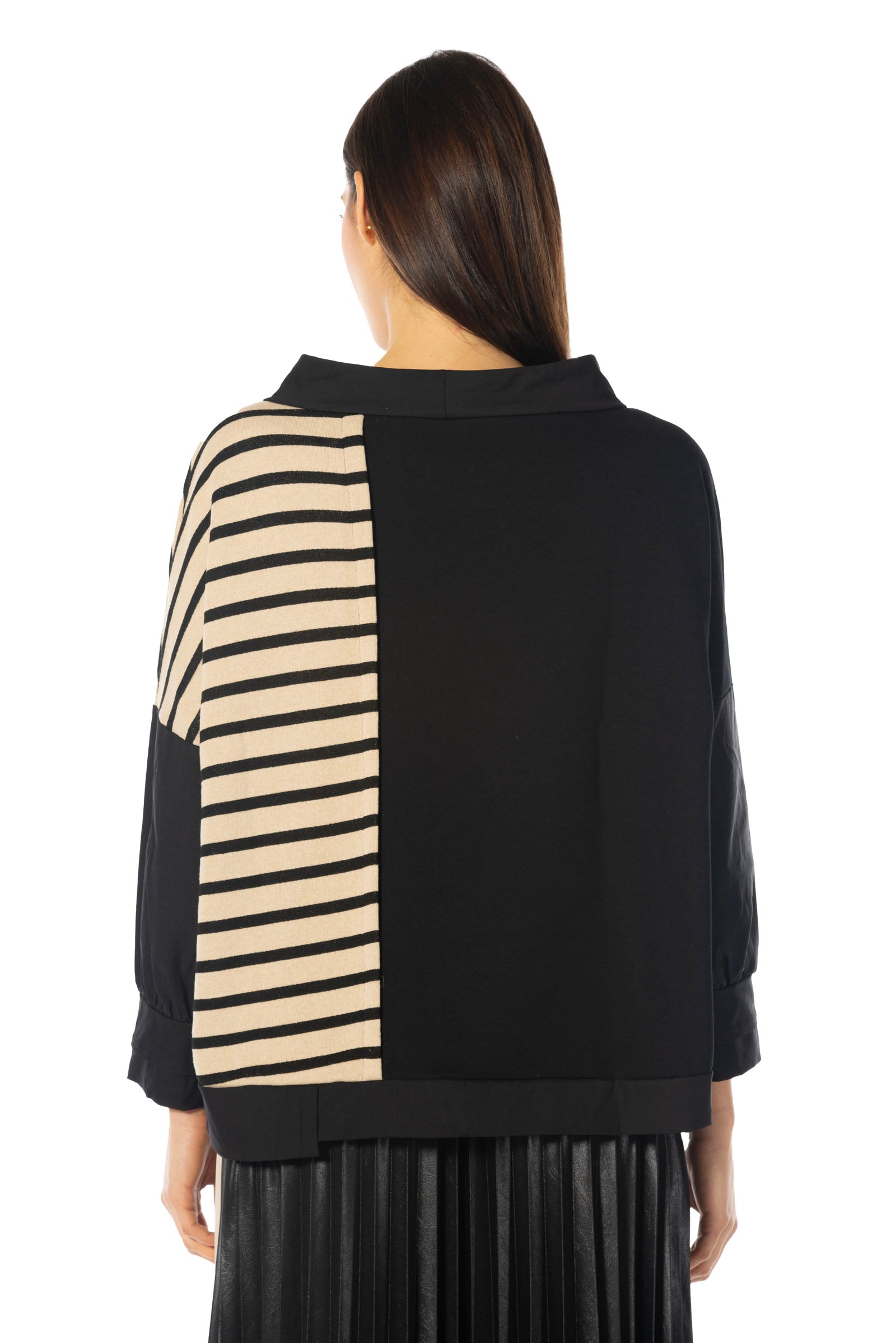 The Nero shirt is a true masterpiece. It comes in black and beige, partially striped and adorned with delicate faux leather appliqués – a luxurious piece of fashion that will give you an elegant look. Let yourself be captivated by it!