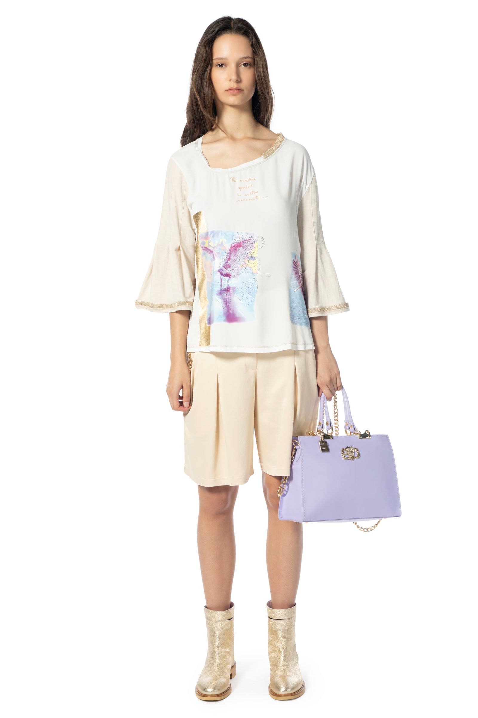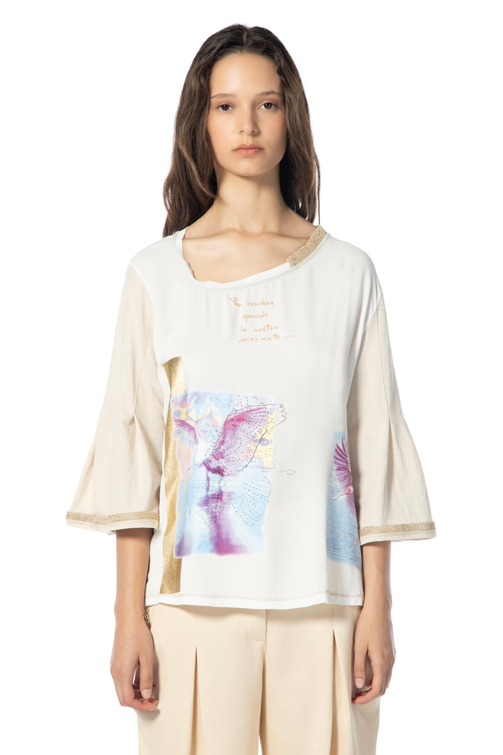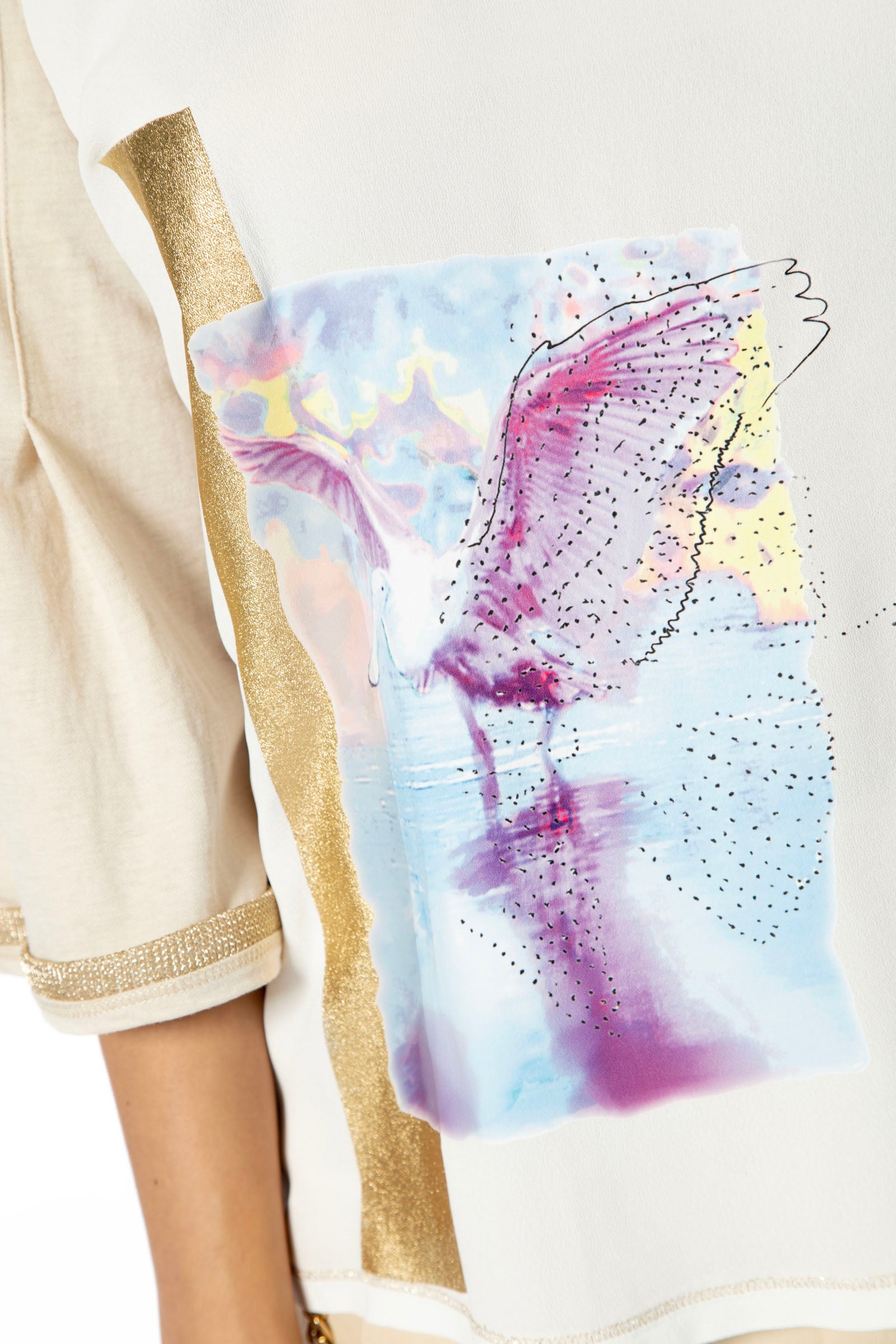 The ELISA CAVALETTI Incontro T-shirt combines a stylish cream tone and shimmering gold appliqués with a vibrant print. The airy batwing sleeves add a playful touch. A perfect blend of elegance and individuality!