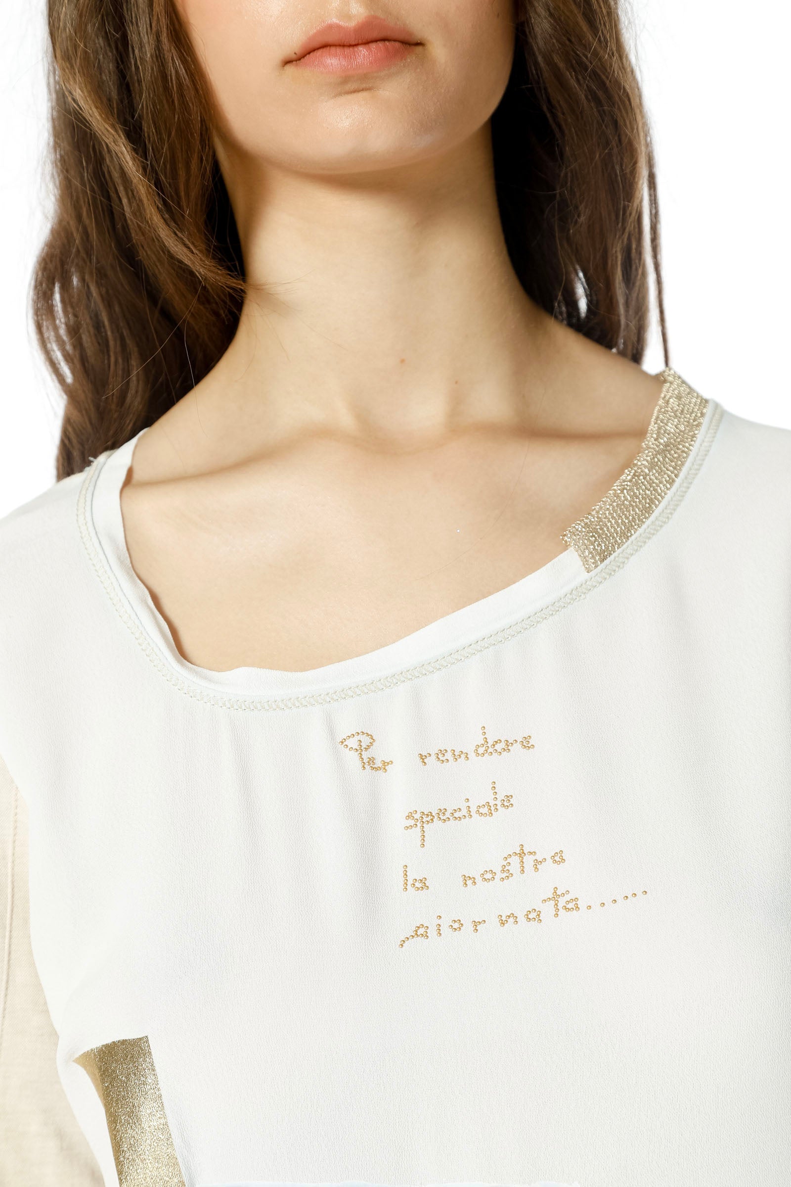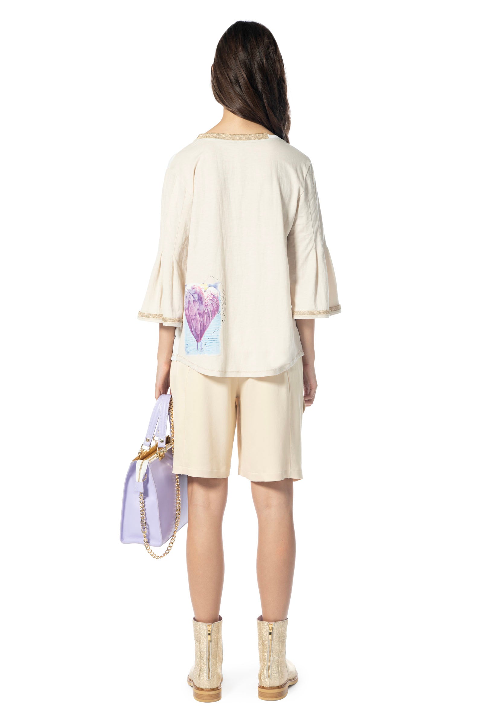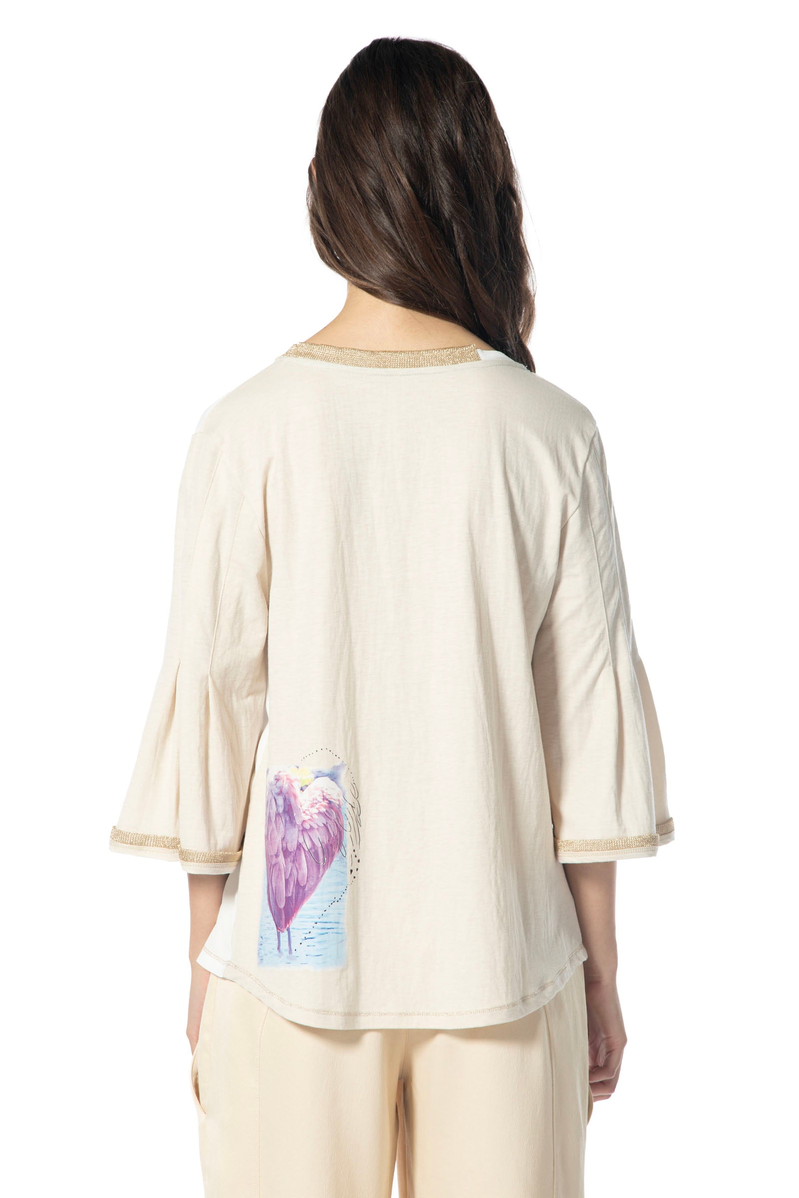 The ELISA CAVALETTI Incontro T-shirt combines a stylish cream tone and shimmering gold appliqués with a vibrant print. The airy batwing sleeves add a playful touch. A perfect blend of elegance and individuality!