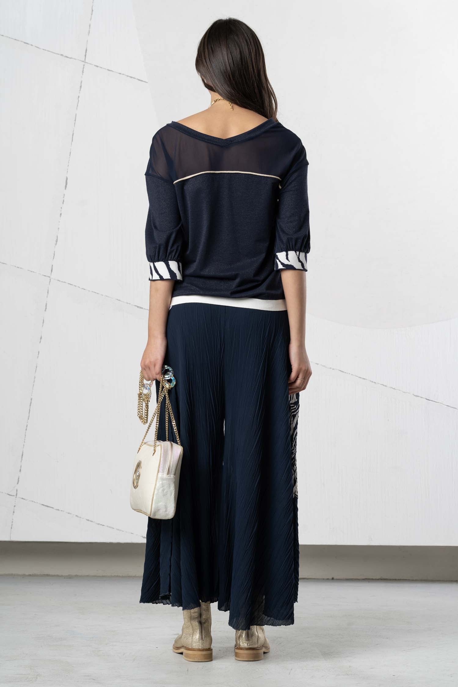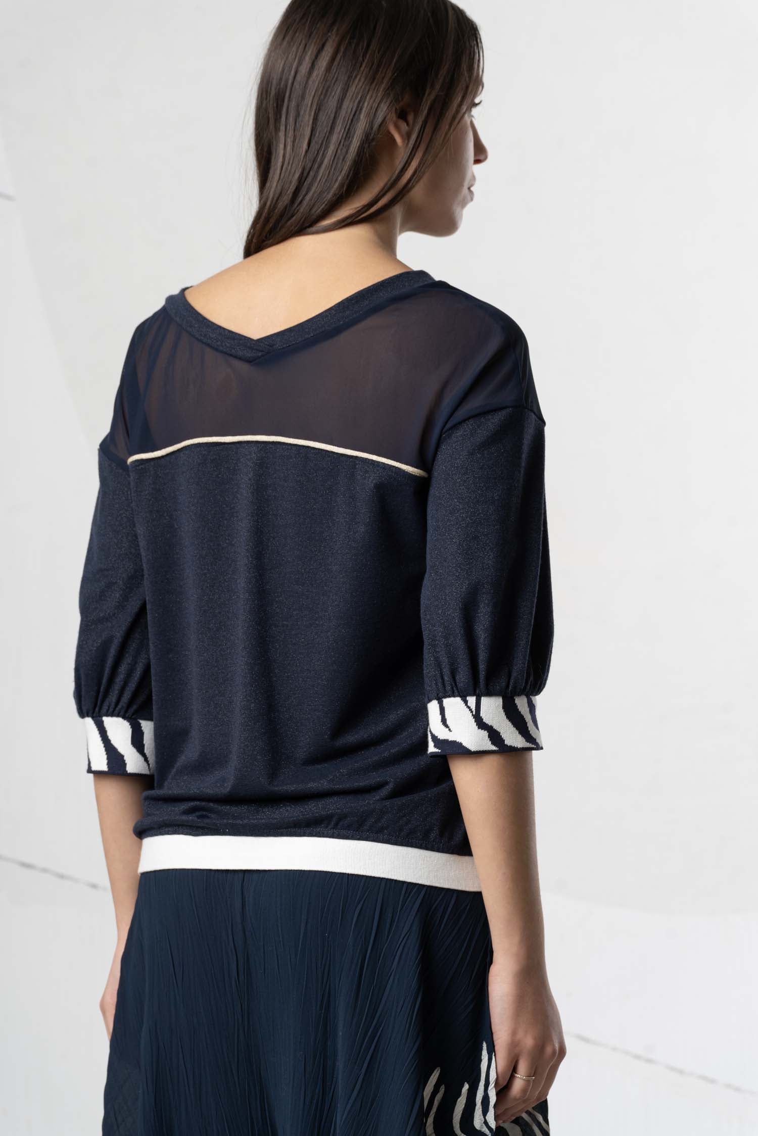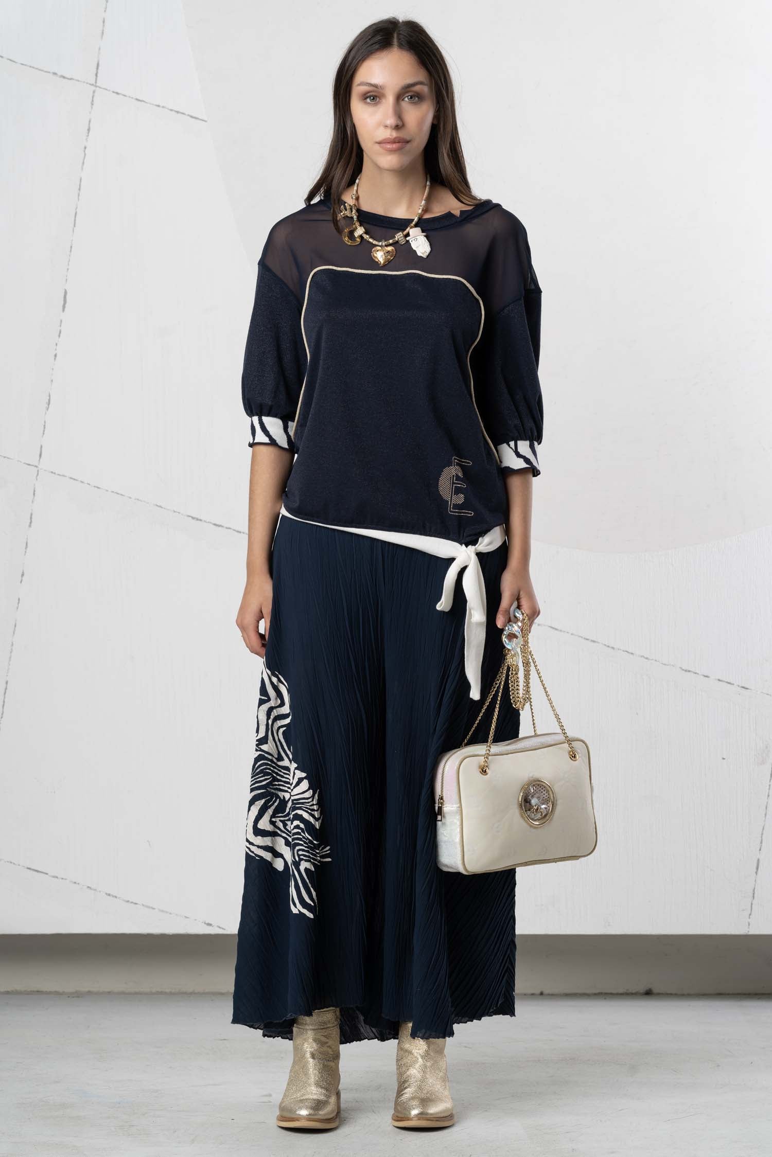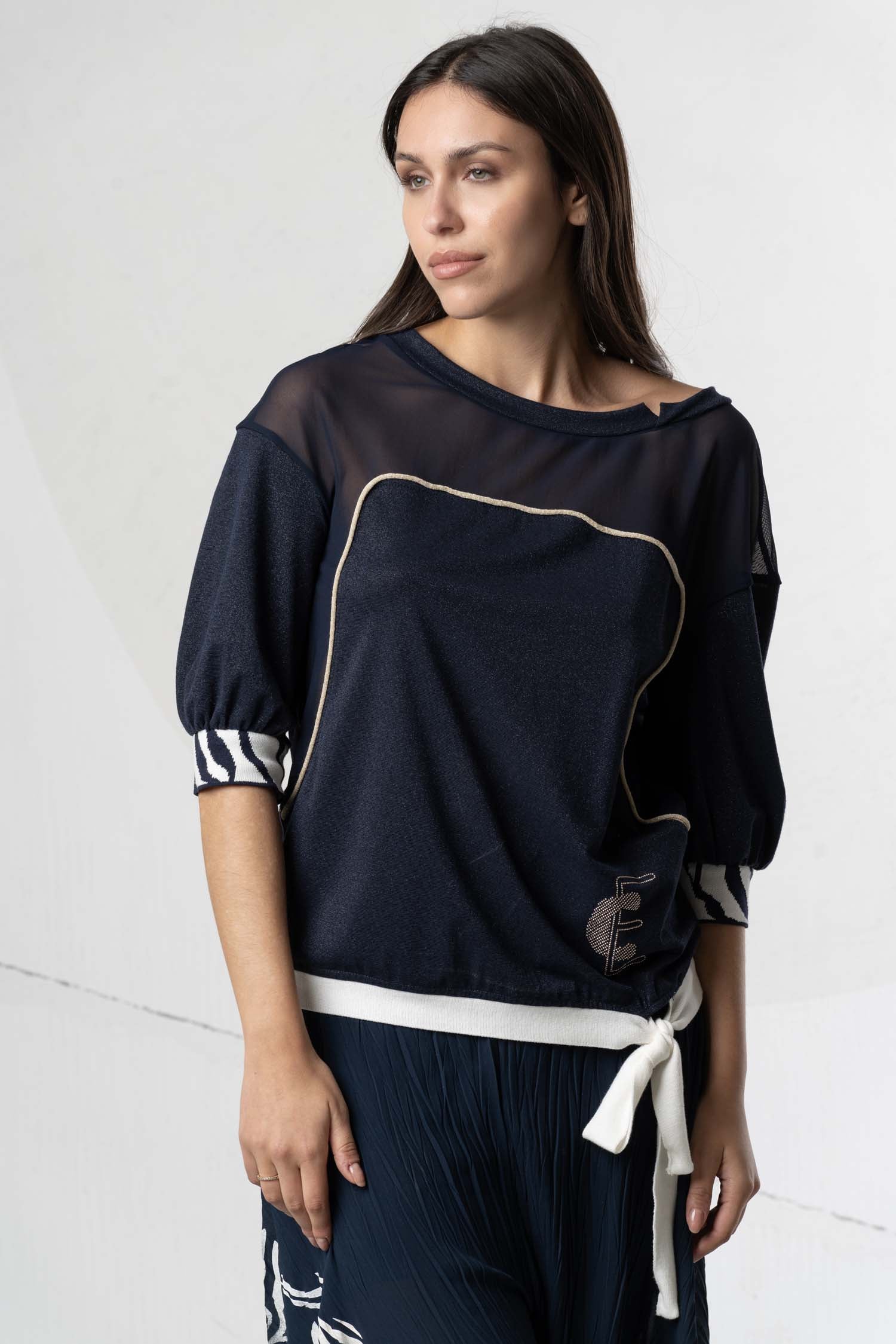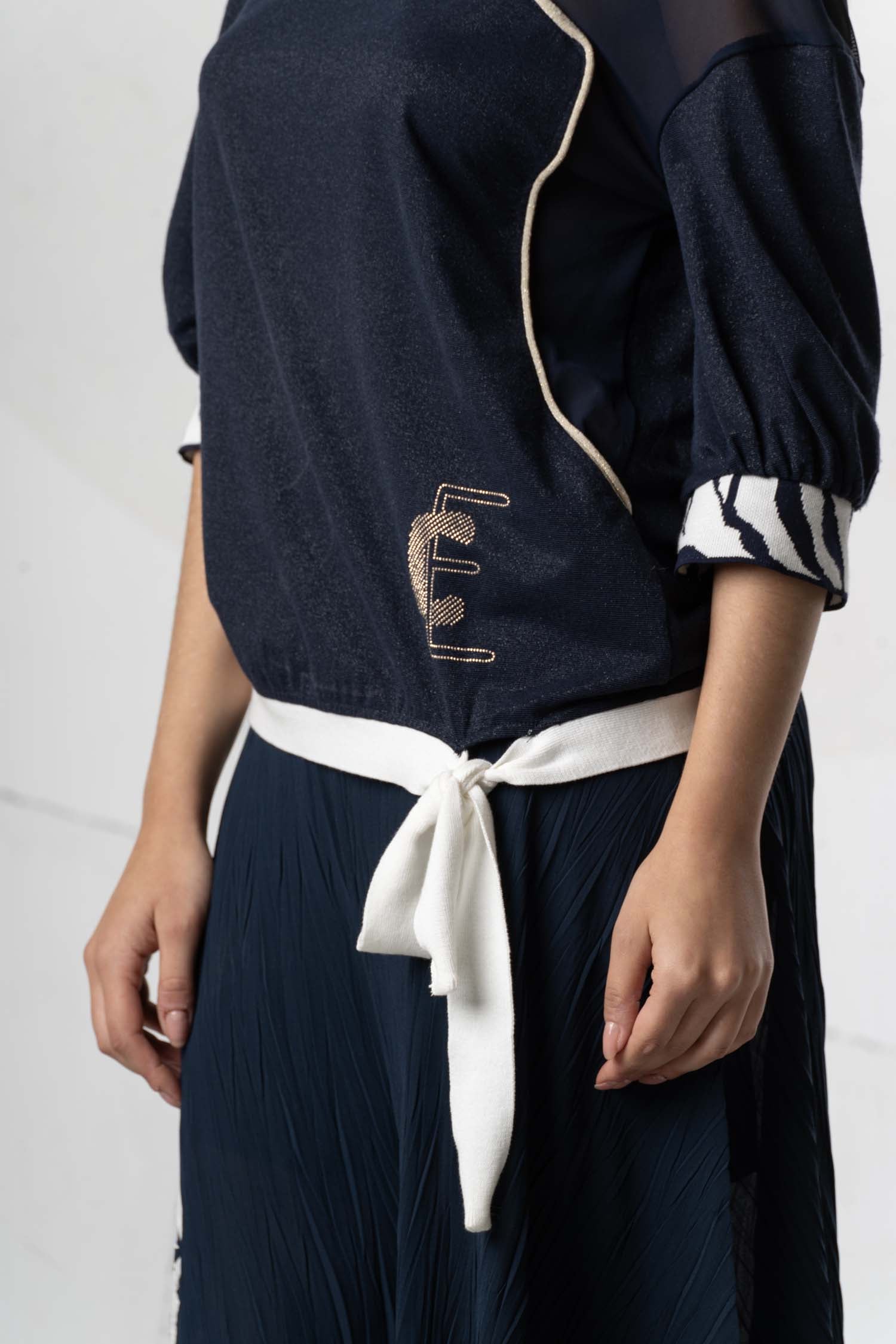 Discover the latest collection from ELISA CAVALETTI with the Tiramisu sweatshirt! The modern design combines dark blue fabric with sheer details and a white cuff for a sophisticated look. A must-have for anyone who appreciates stylish clothing. Get your new favorite shirt now and let its elegance enchant you!