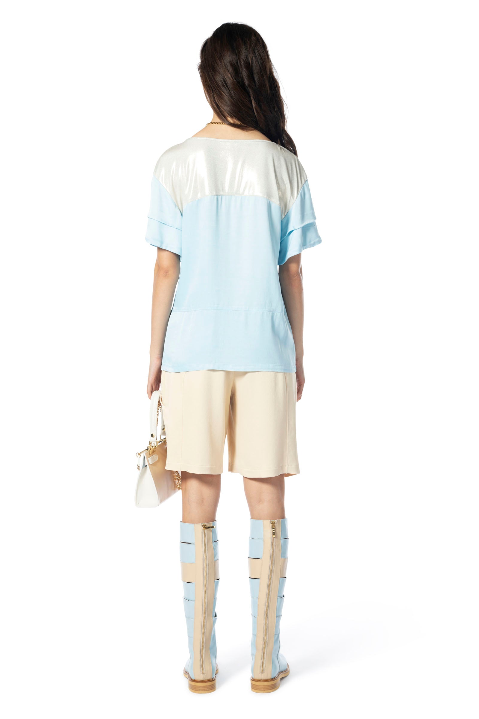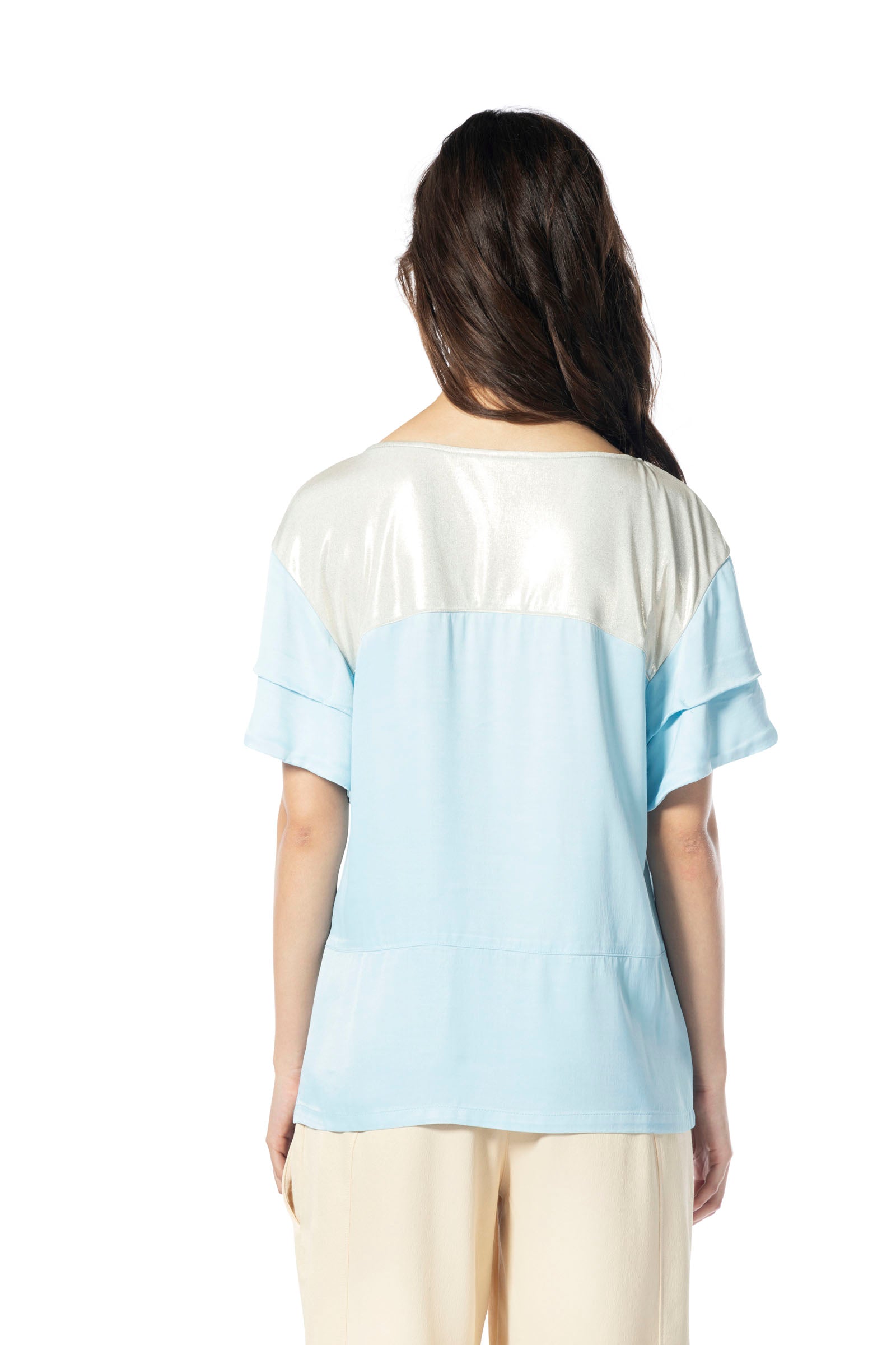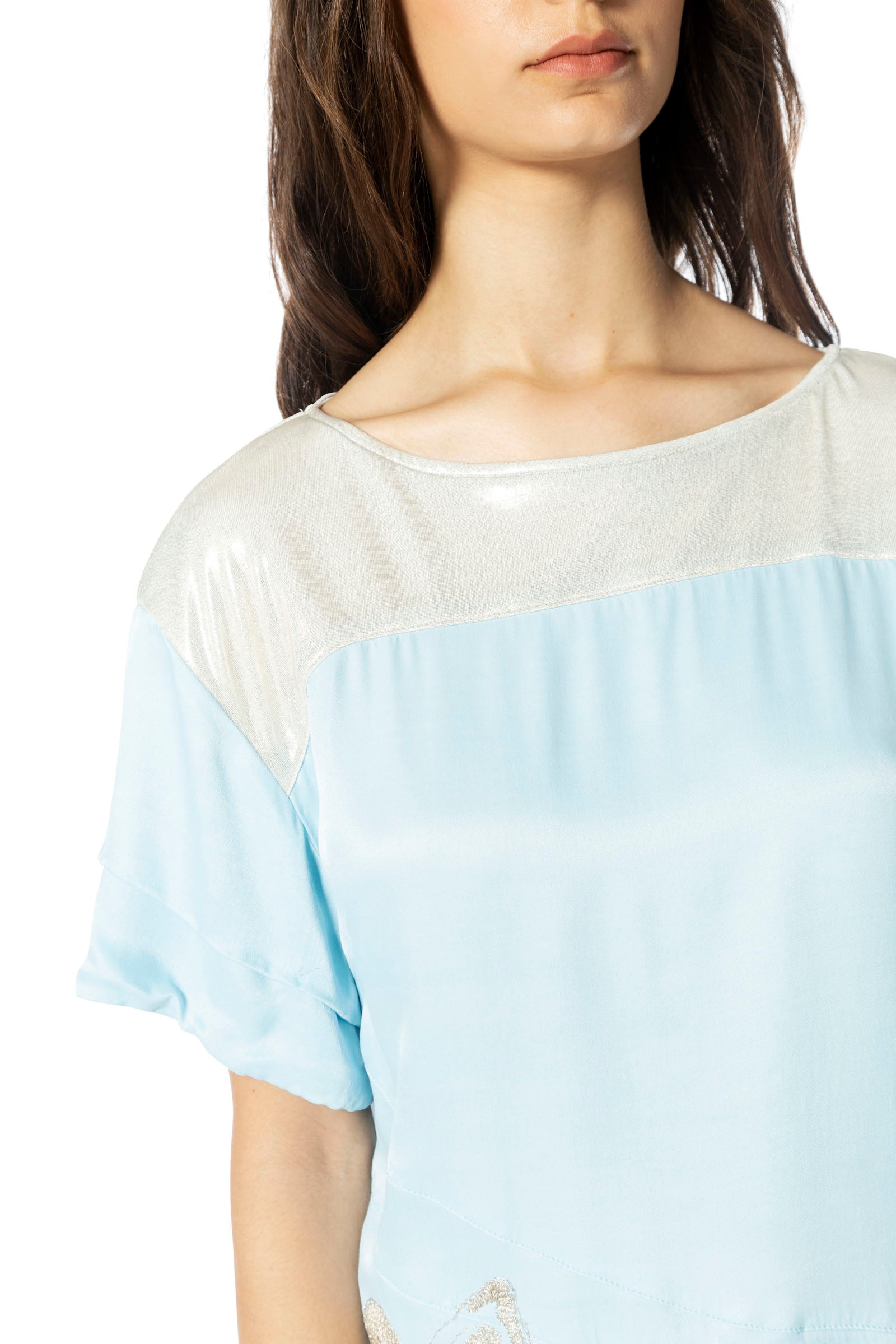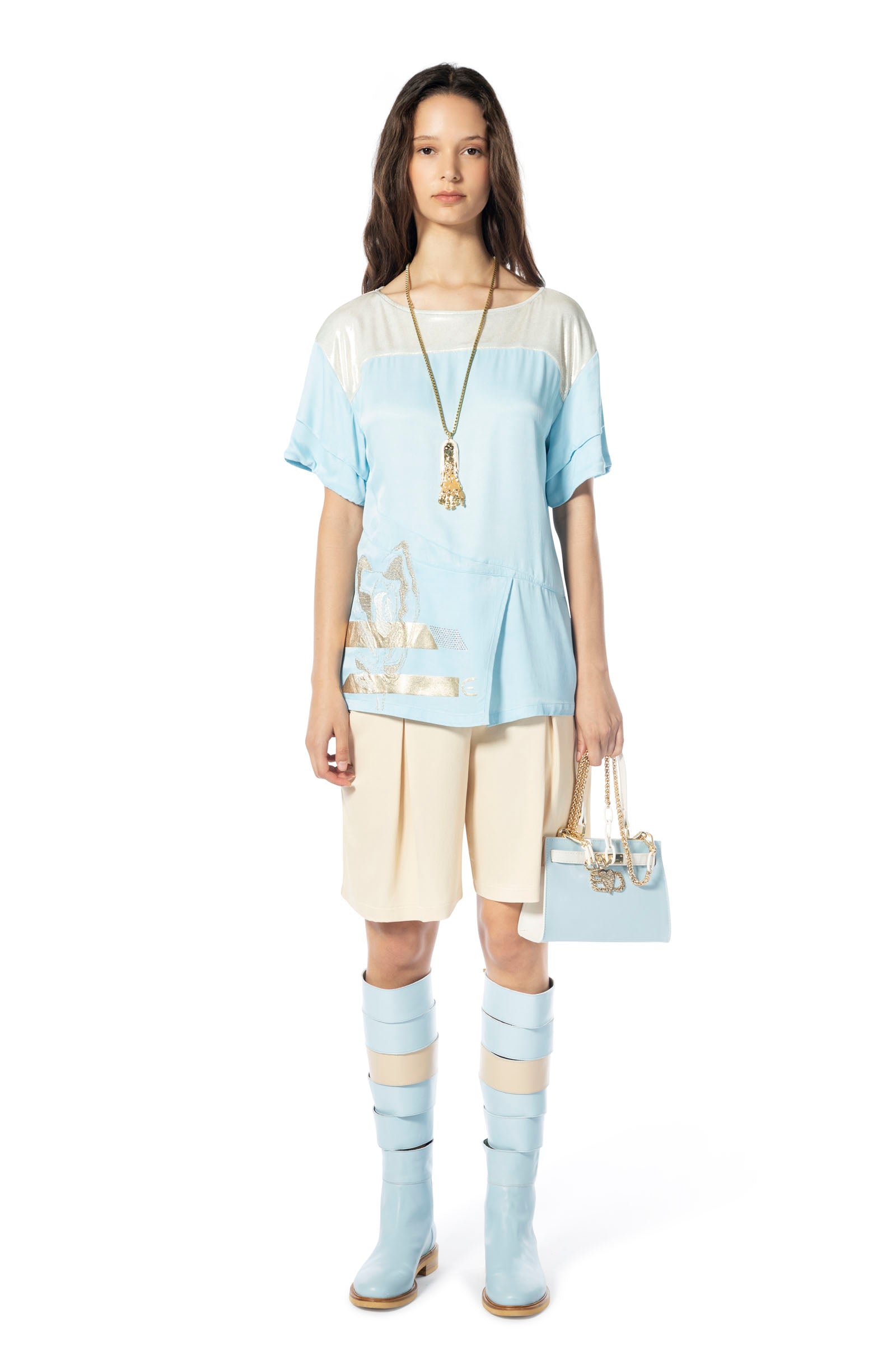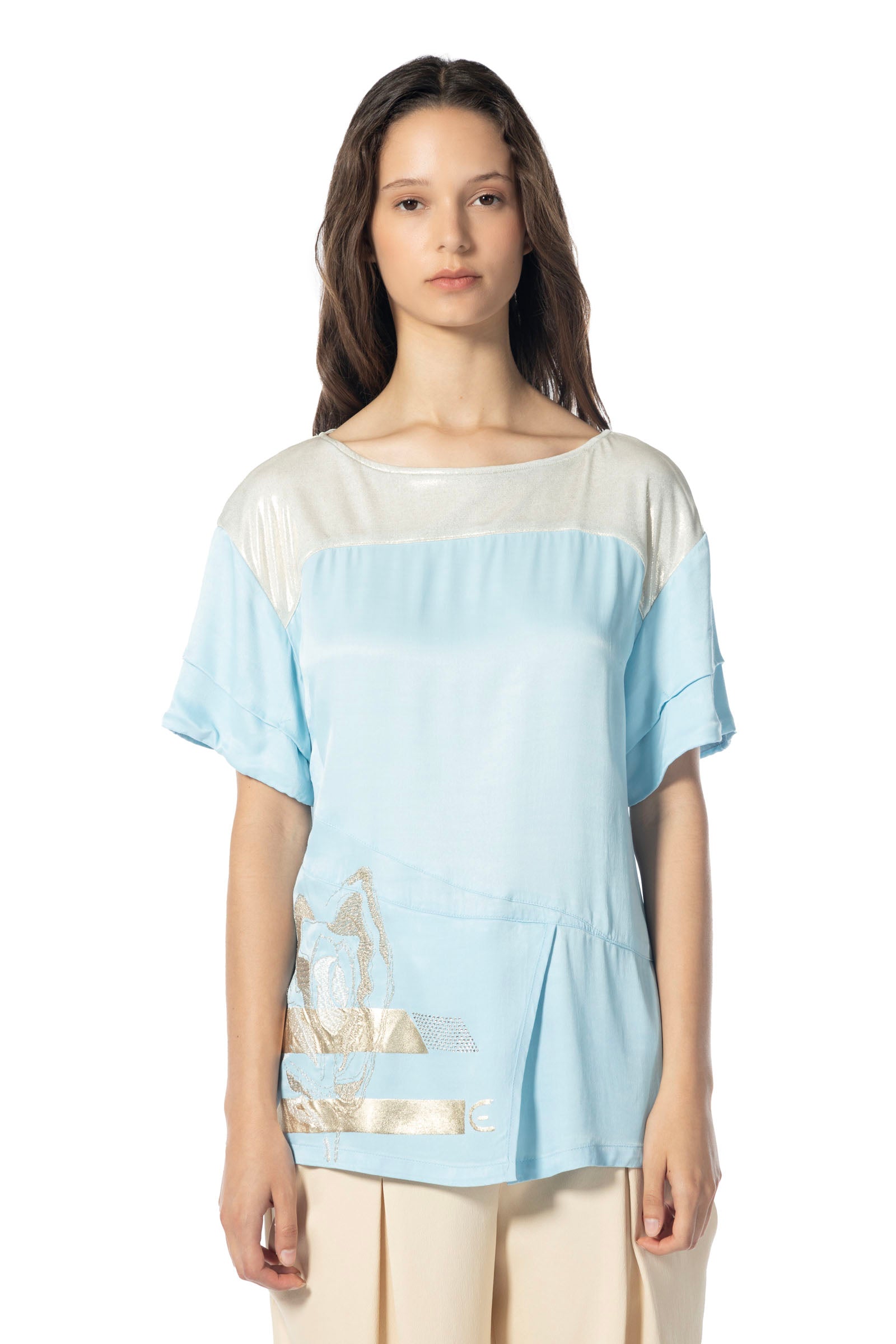 Experience pure elegance with the ELISA CAVALETTI Lindo T-shirt. This light blue hue is adorned with shimmering gold appliqués. Treat yourself to a touch of luxury and make a stylish statement with this exquisite T-shirt.