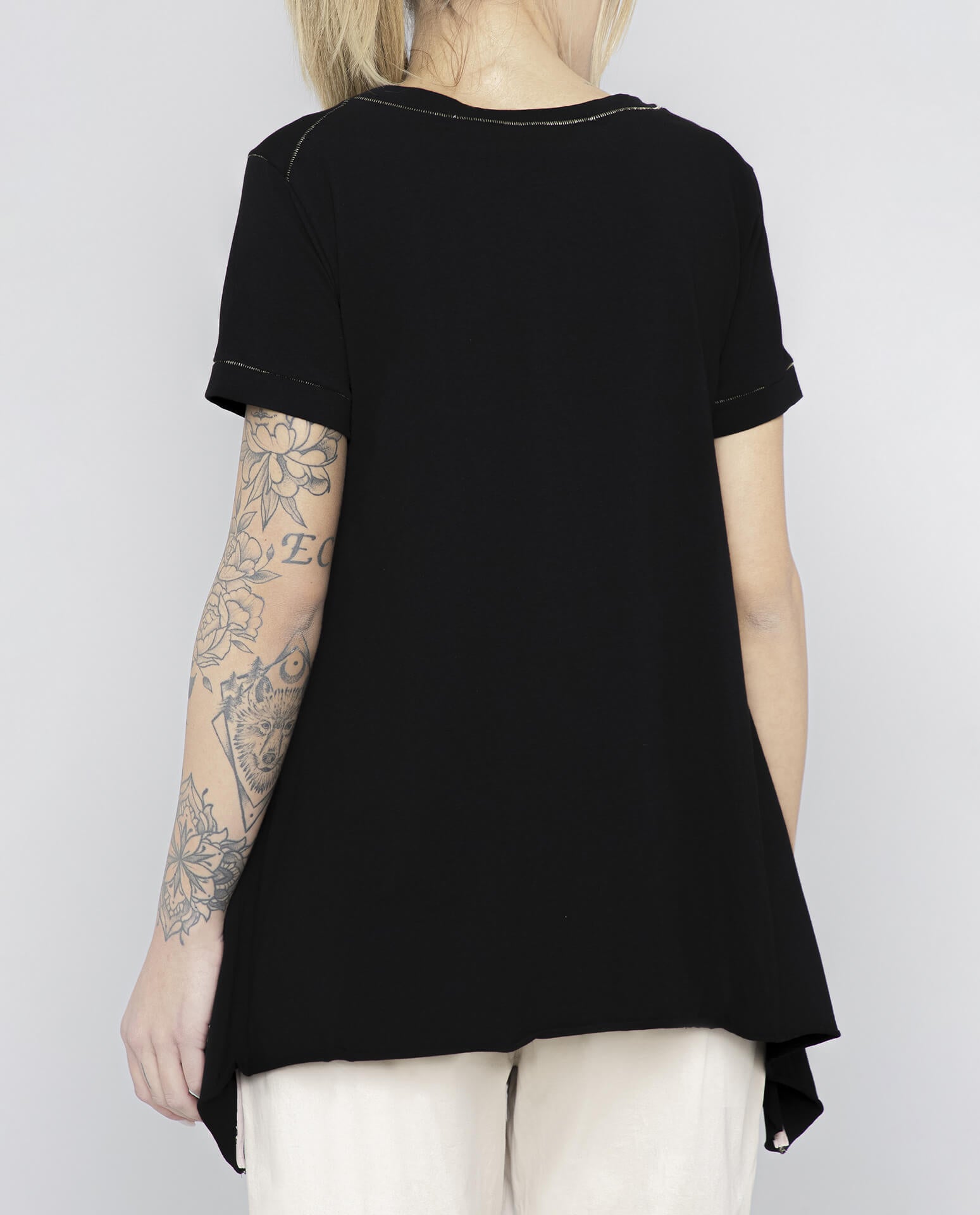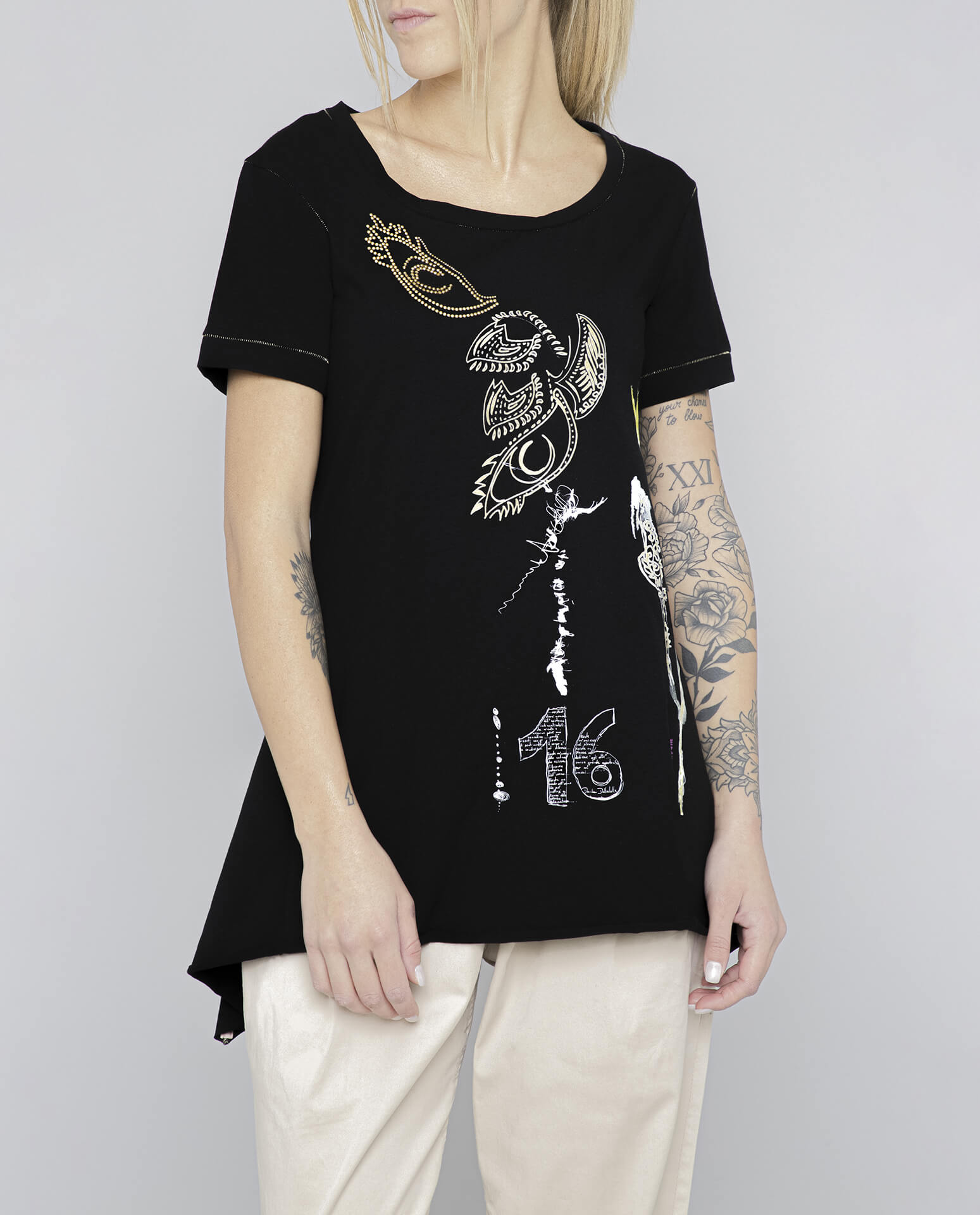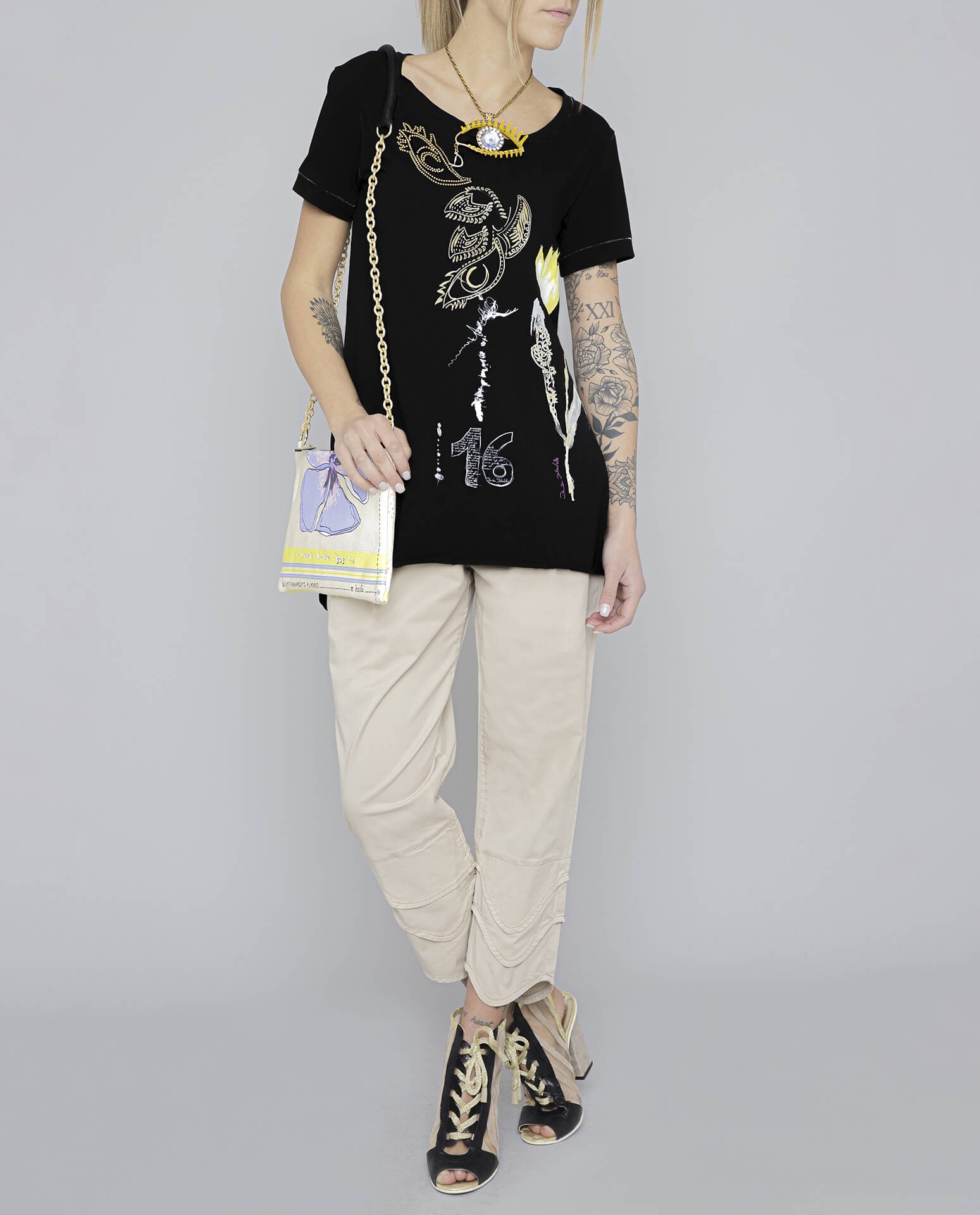 The DANIELA DALLAVALLE Brontolo T-shirt is a must-have for every wardrobe! This black T-shirt features a striking, colorful print that's sure to turn heads. Show off your individual style and make a fashion statement with this unique T-shirt!