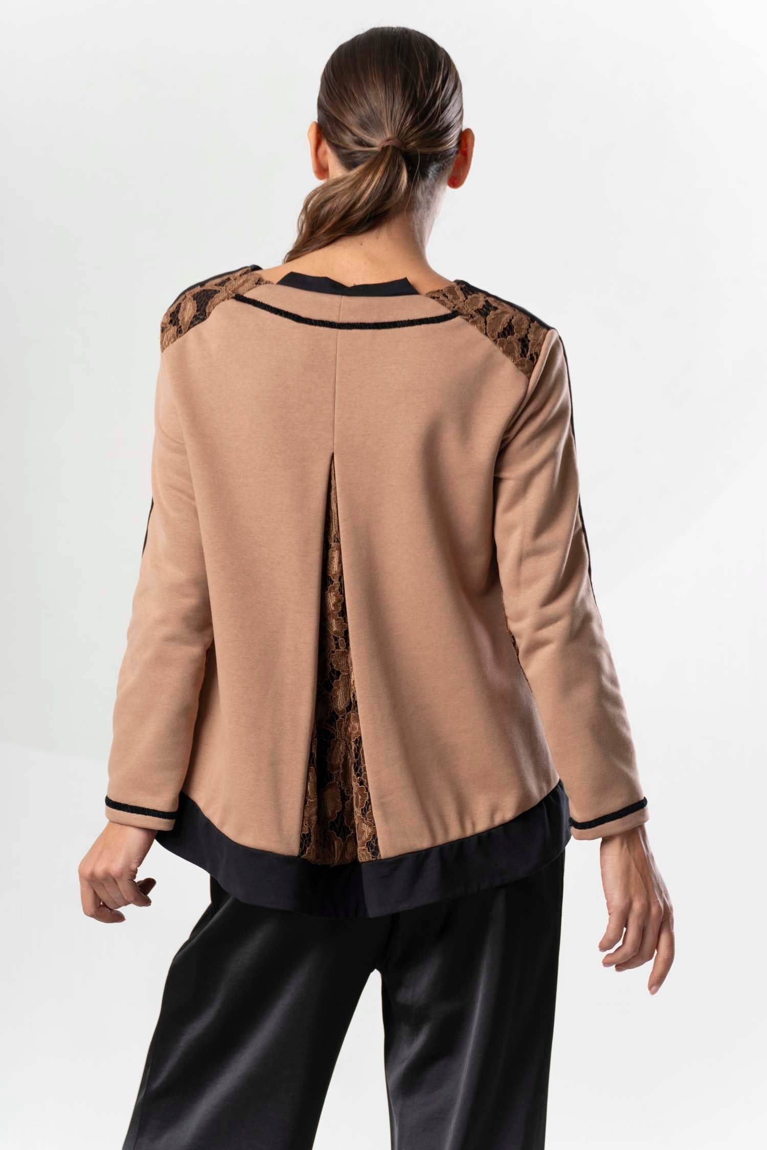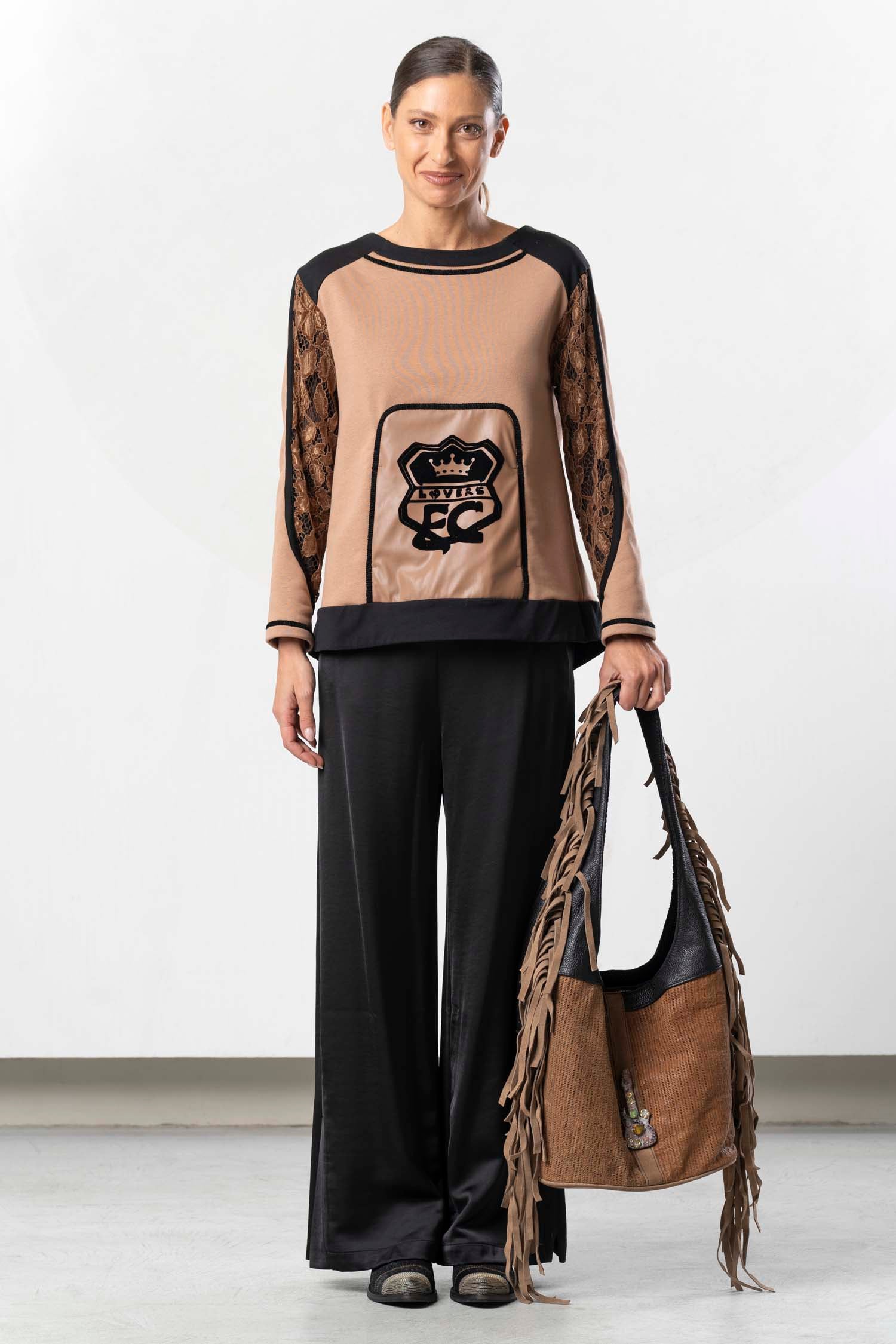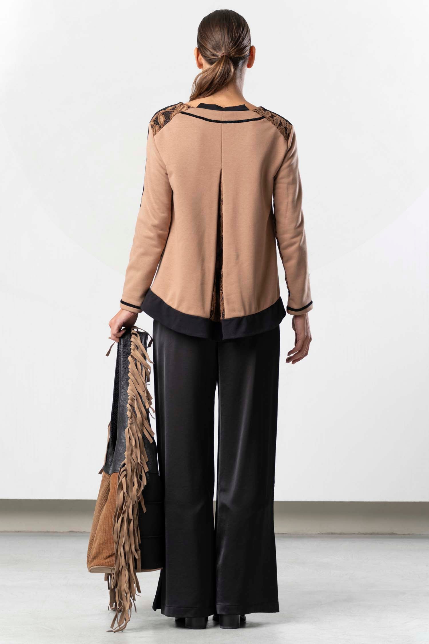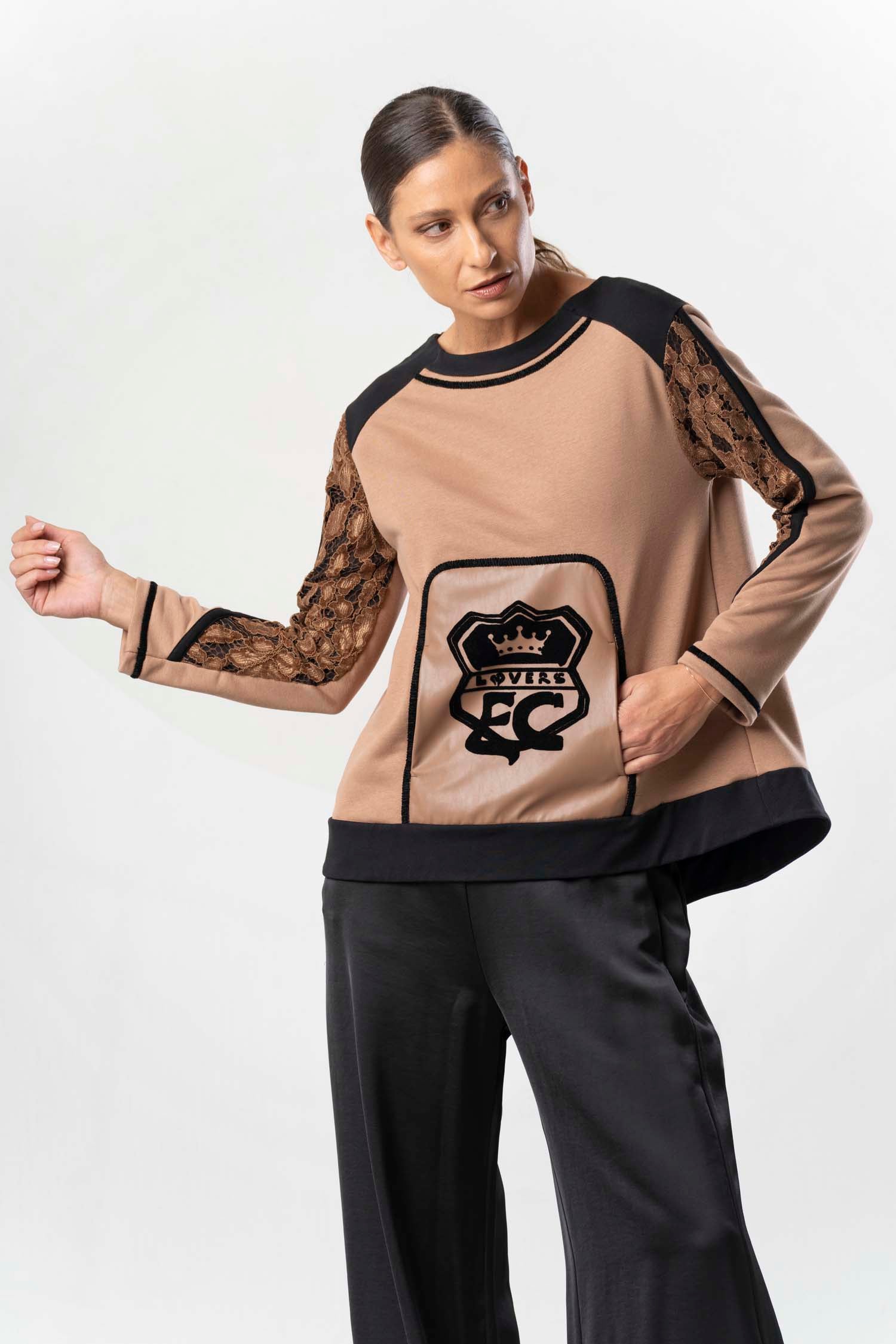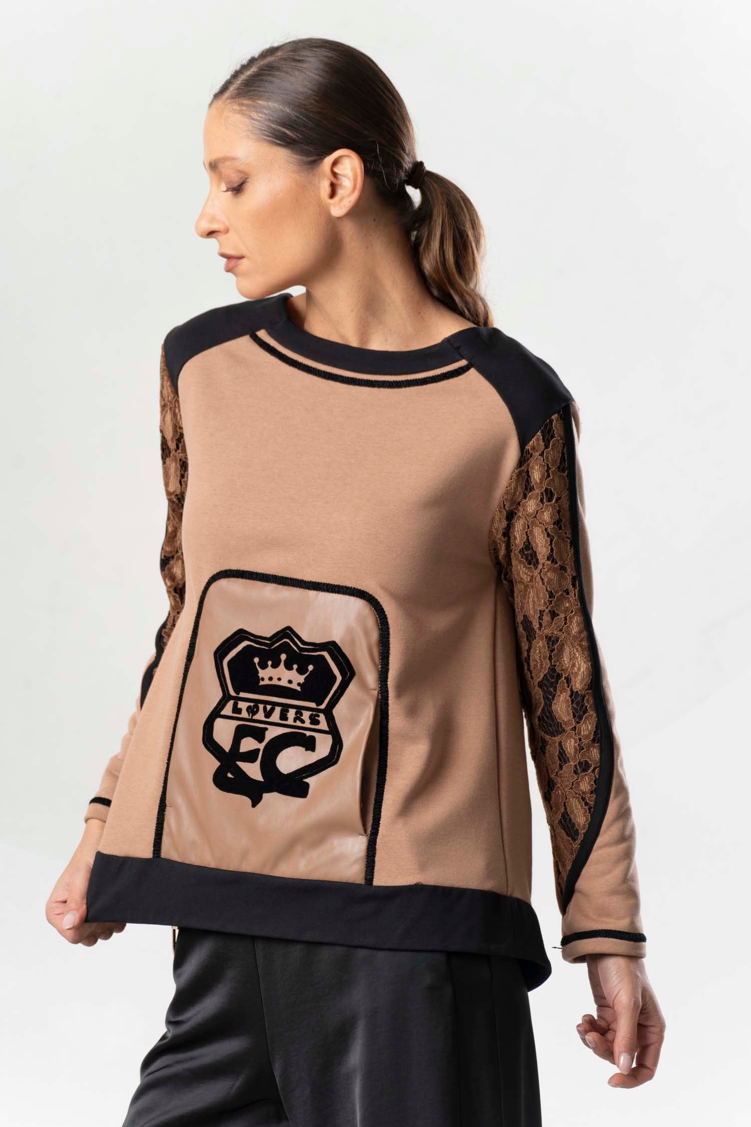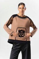 Be captivated by the ELISA CAVALETTI Frizzante sweatshirt! The beautiful brown hue and black lace trim create a unique look. Enjoy the perfect blend of elegance and comfort. Let yourself be swept away by the passion and enthusiasm of this exceptional sweater!