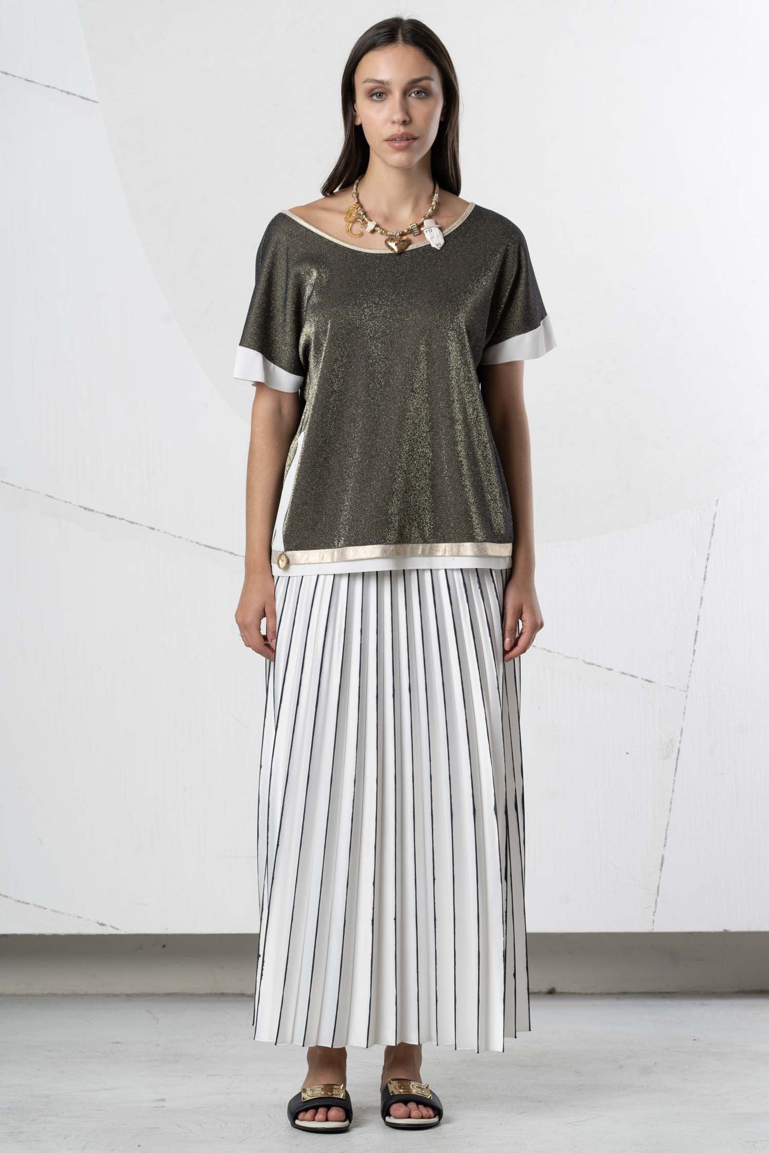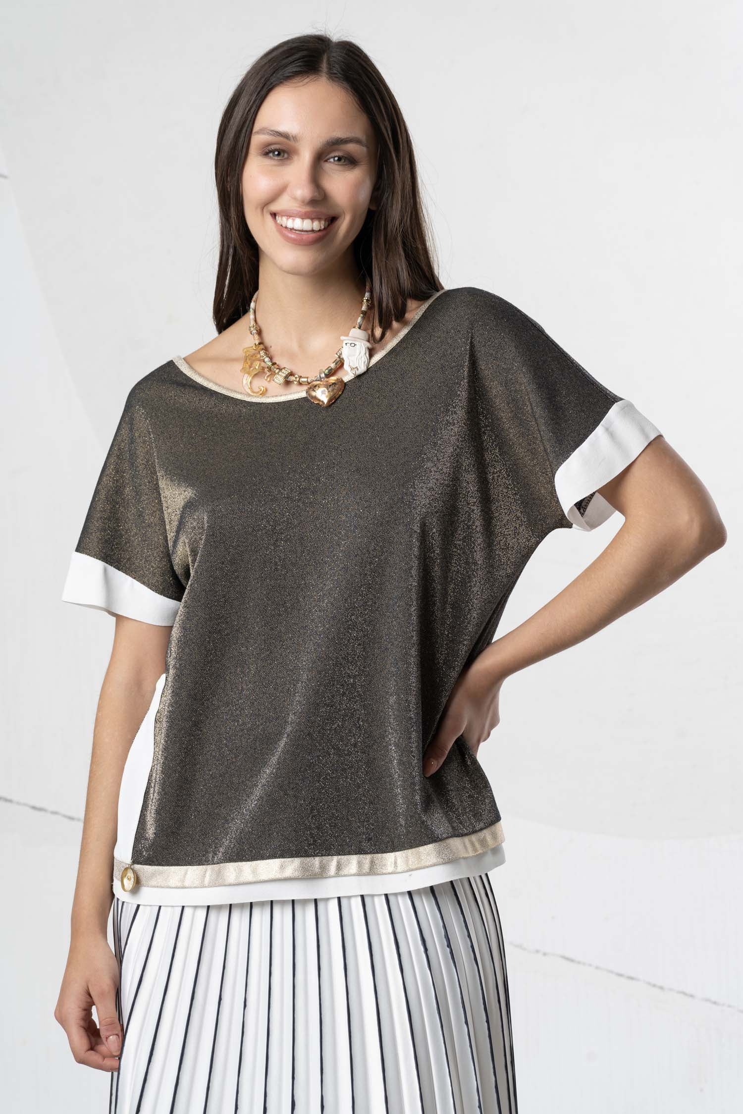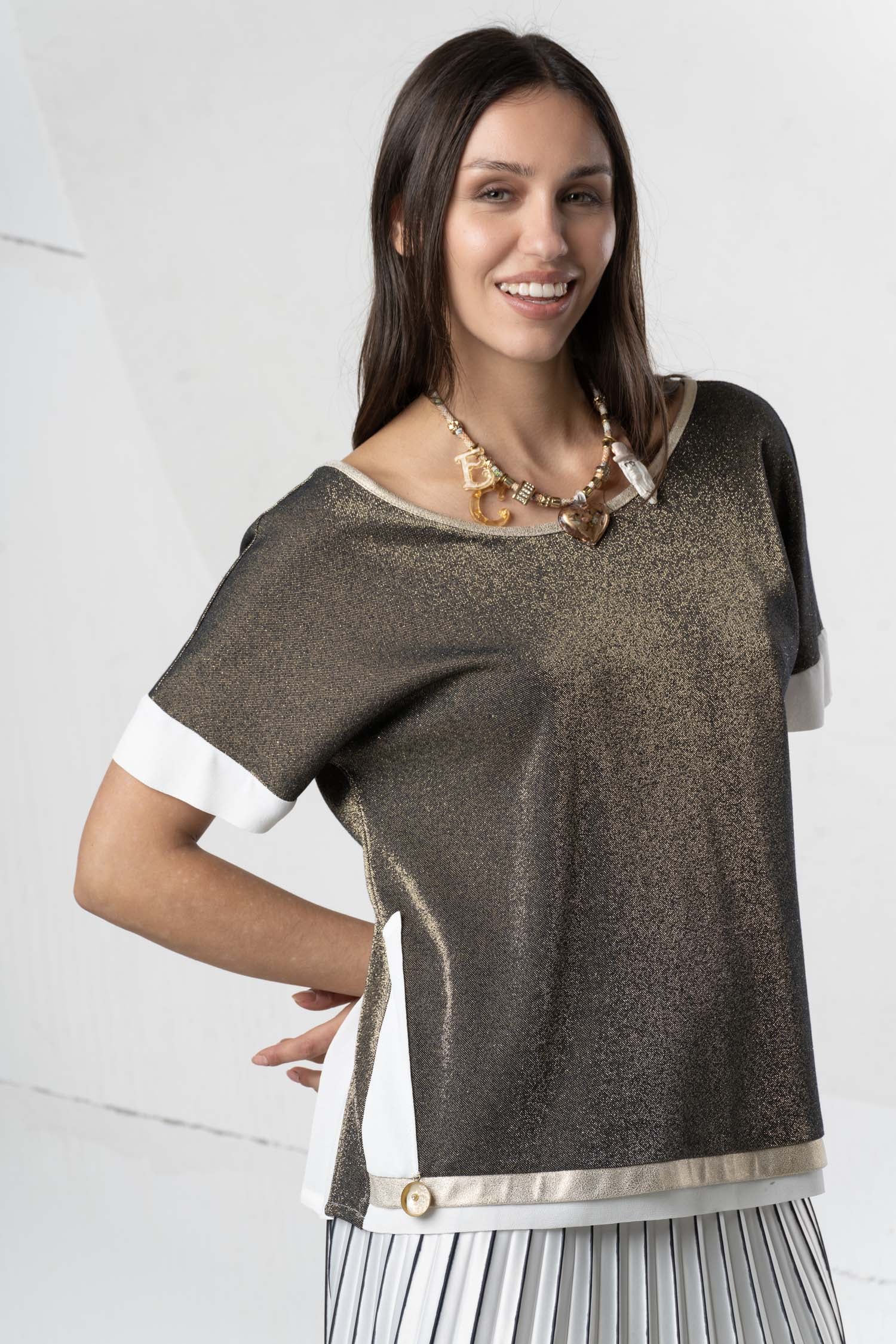 Be captivated by the ELISA CAVALETTI Tiramisu T-shirt in blue/grey melange! This short-sleeved shirt features gold-tone appliqués and impresses with its unique style. Make a stylish statement and turn heads with this shirt!