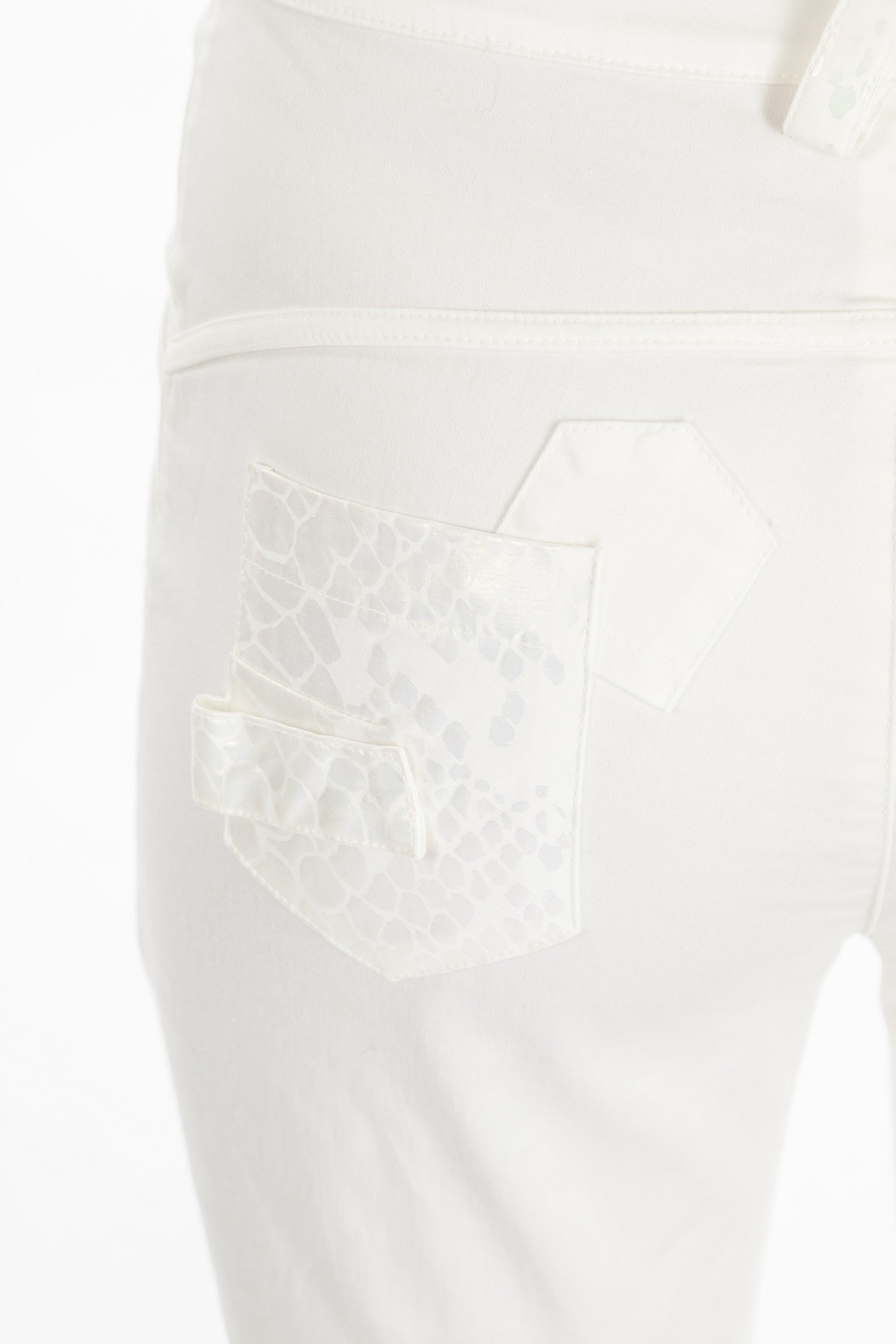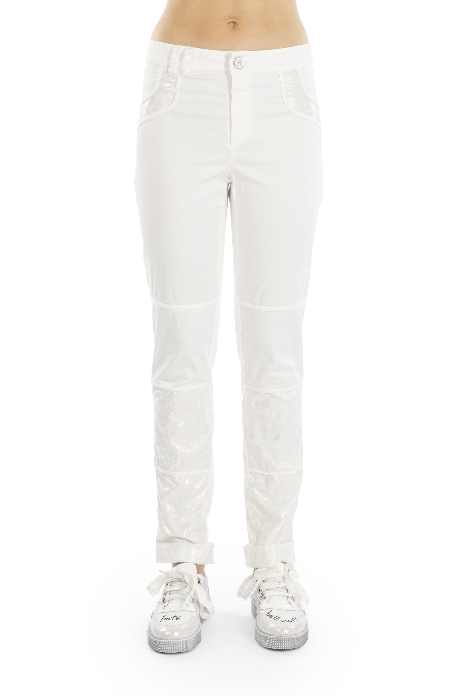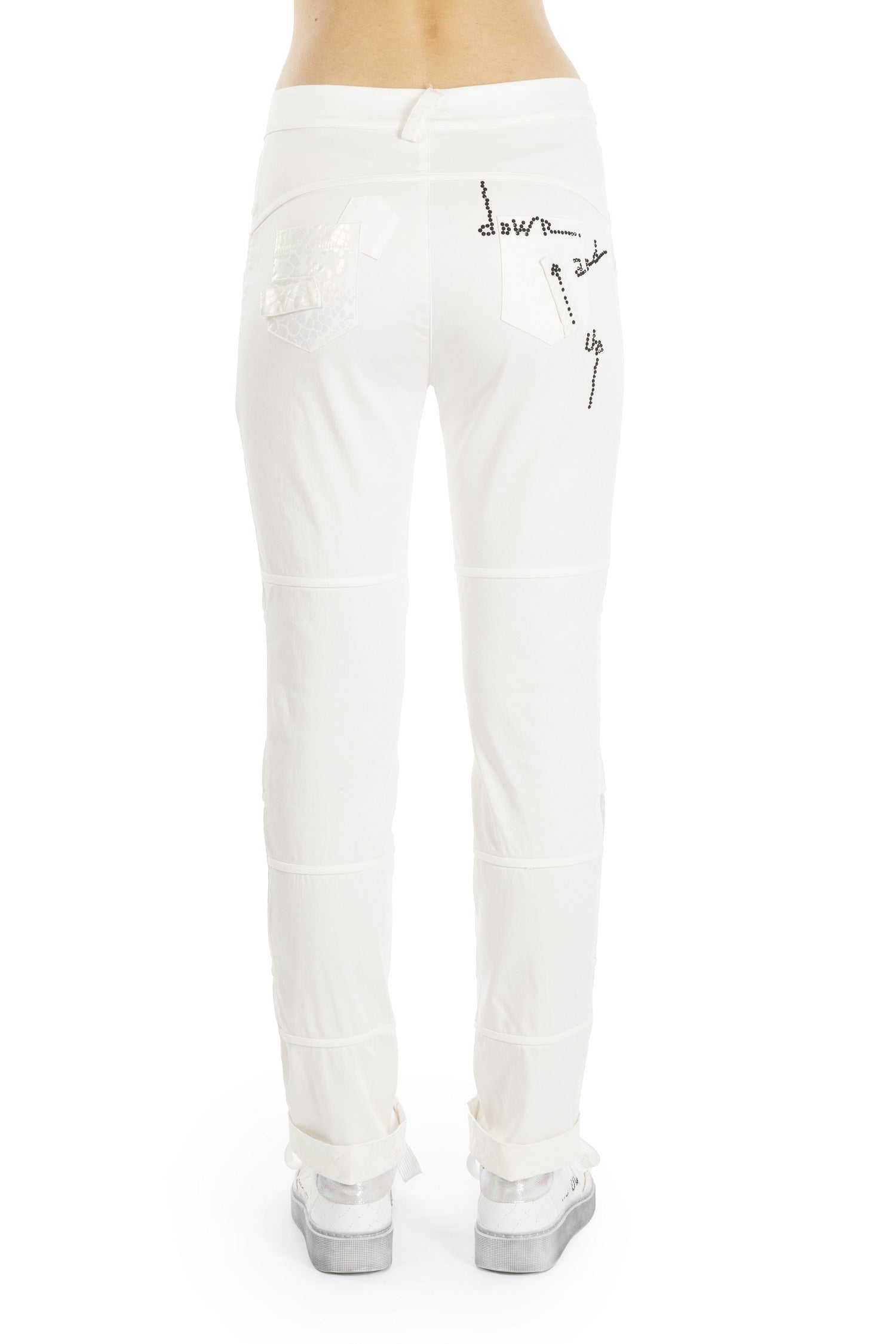 ELISA CAVALETTI's Incontro trousers create a fashionable look with their classic fit and sturdy cotton fabric. They come in an elegant white tone and are adorned with delicate silver appliqués and a black logo on the trouser pocket.