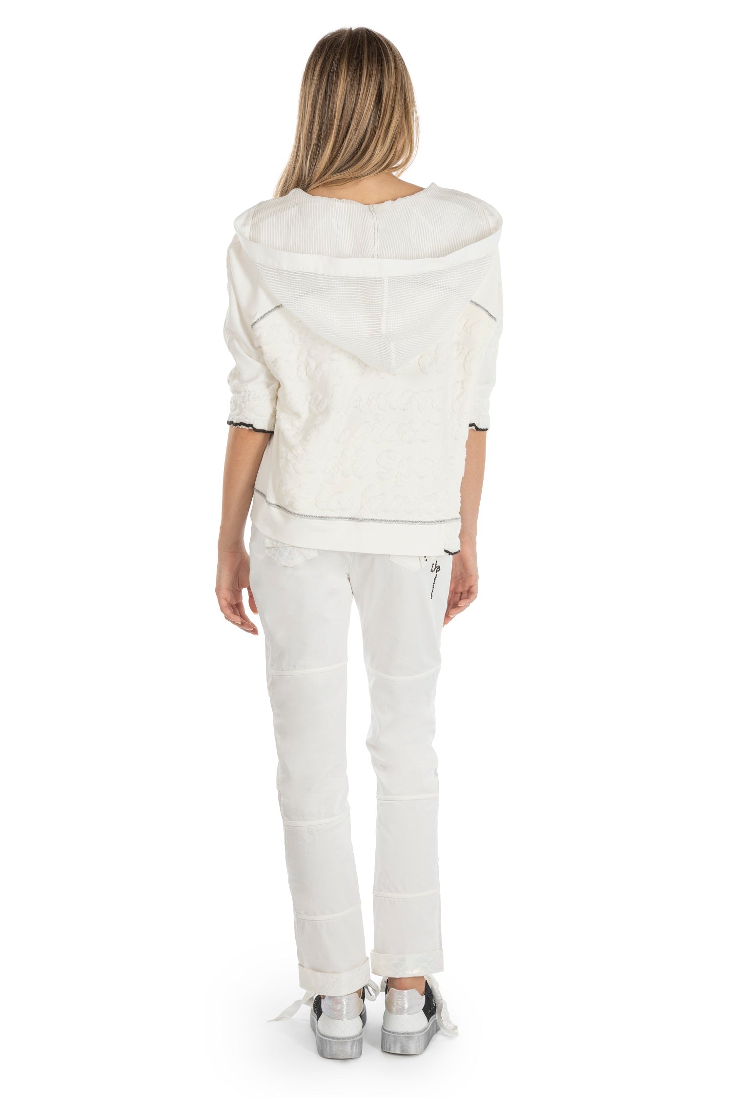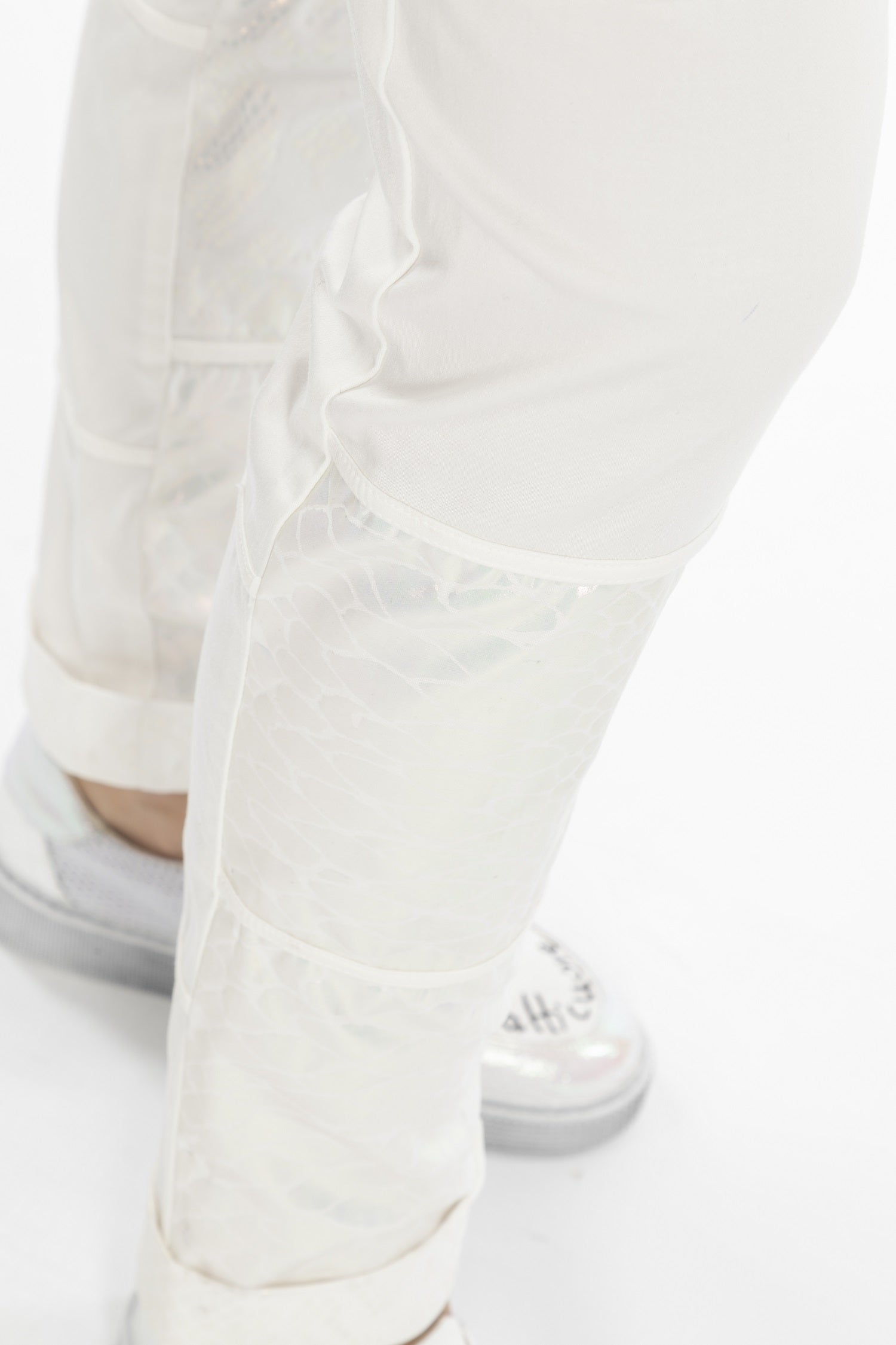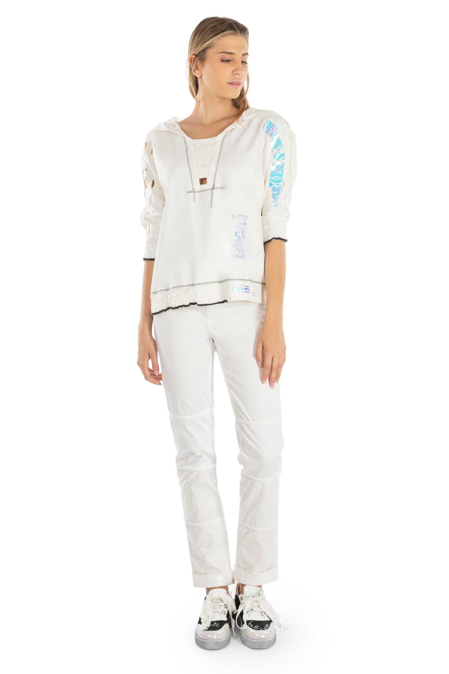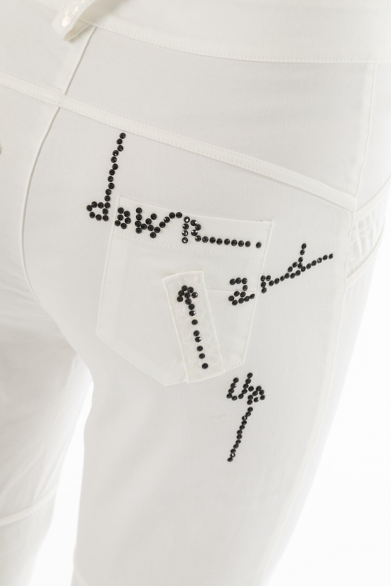ELISA CAVALETTI's Incontro trousers create a fashionable look with their classic fit and sturdy cotton fabric. They come in an elegant white tone and are adorned with delicate silver appliqués and a black logo on the trouser pocket.
