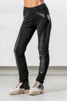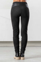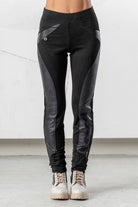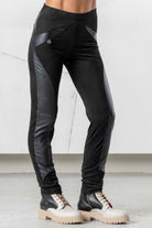 These black leggings impress with their fashionable cut and high-quality leather details, ensuring a sophisticated look and lasting quality. Ideal for style-conscious outfits, they combine comfort with an elegant finish.