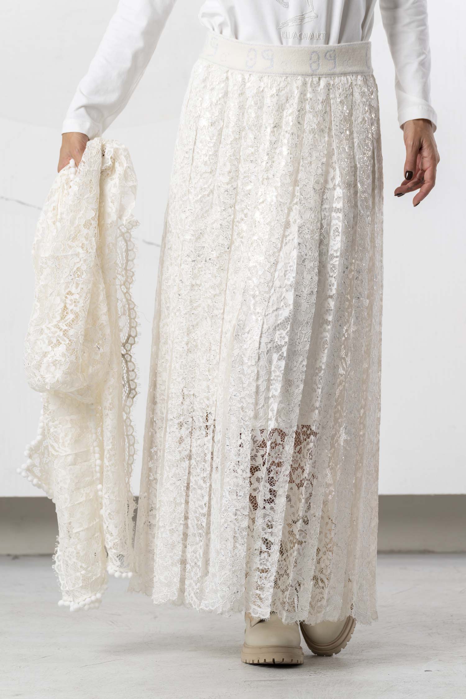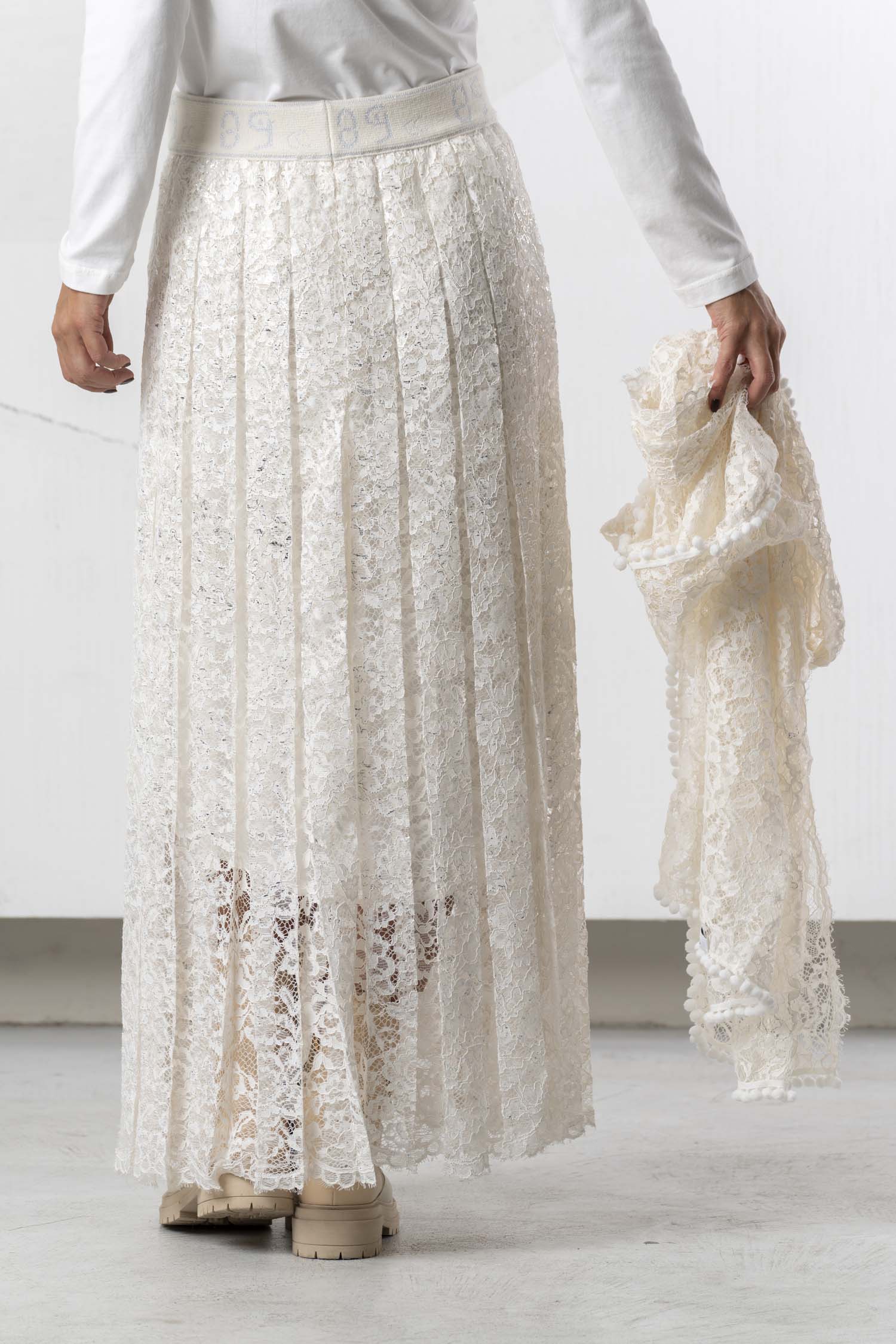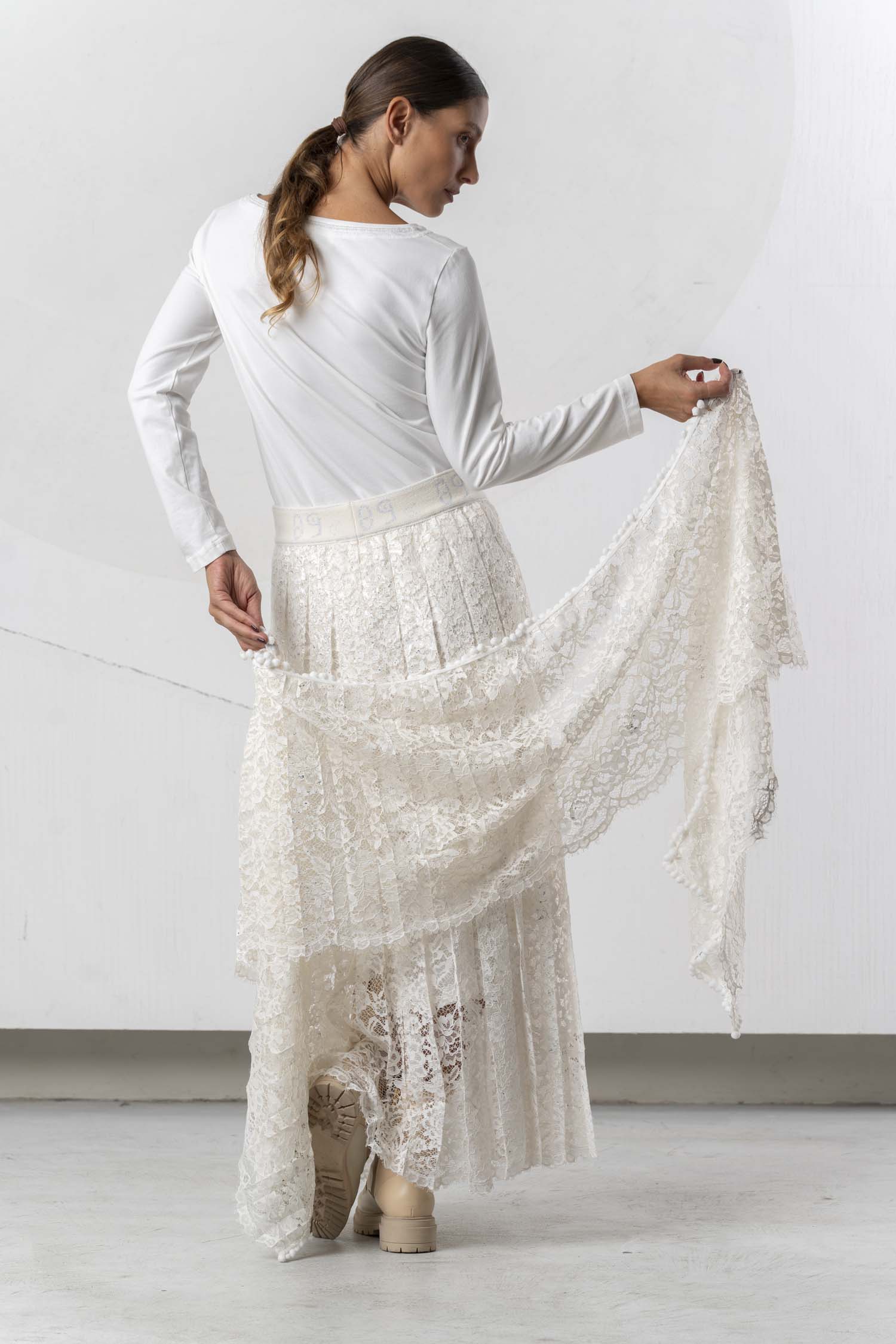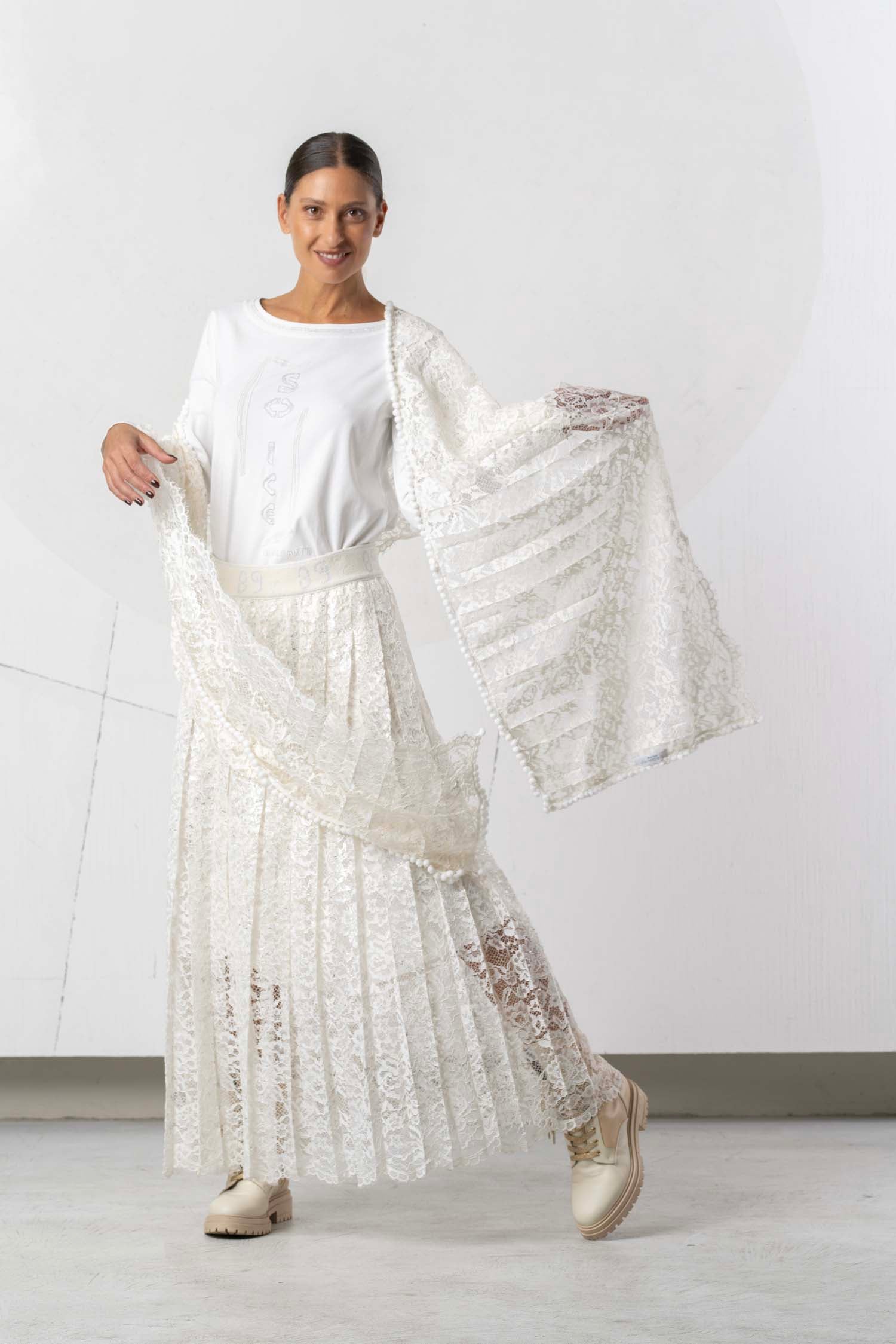 This elegant, long white skirt made of delicate lace captivates with its timeless sophistication. Combined with a matching scarf, it offers versatile styling options for special occasions. The high-quality workmanship ensures comfortable wear and accentuates your stylish appearance.