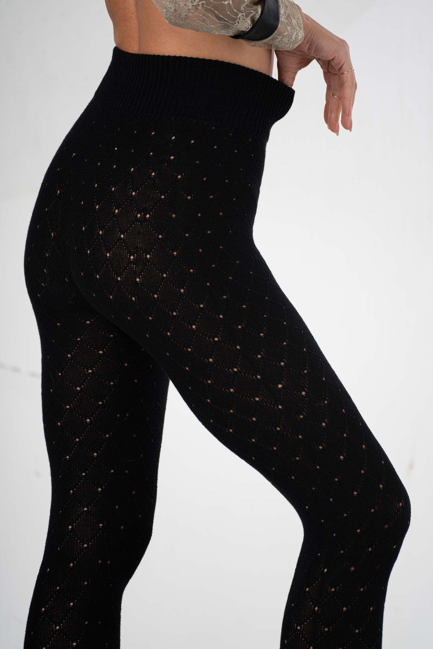 These black knit leggings impress with their modern openwork pattern, adding a stylish touch. Their close fit creates a trendy silhouette and makes them versatile enough to combine with other pieces – ideal for fashion-conscious individuals who appreciate contemporary comfort. The high-quality workmanship guarantees a comfortable fit and long-lasting durability.