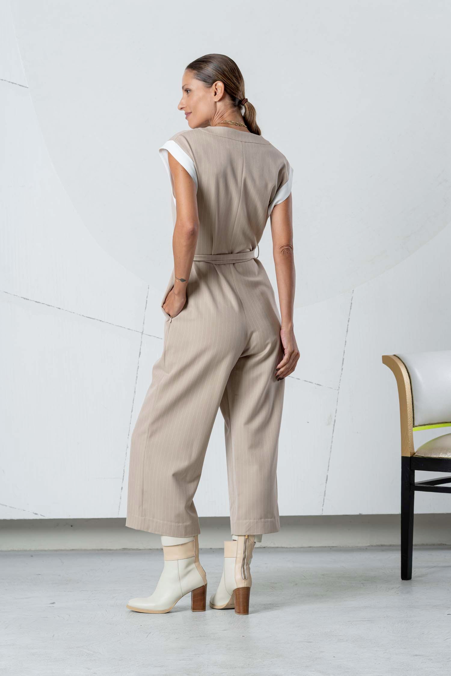 Discover the stylish DANIELA DALLAVALLE jumpsuit in beige! This elegant calf-length jumpsuit features a classic pinstripe pattern, giving you a timelessly sophisticated look. Perfect for various occasions – from work to a relaxed stroll around town. Get this must-have piece for your wardrobe now!
