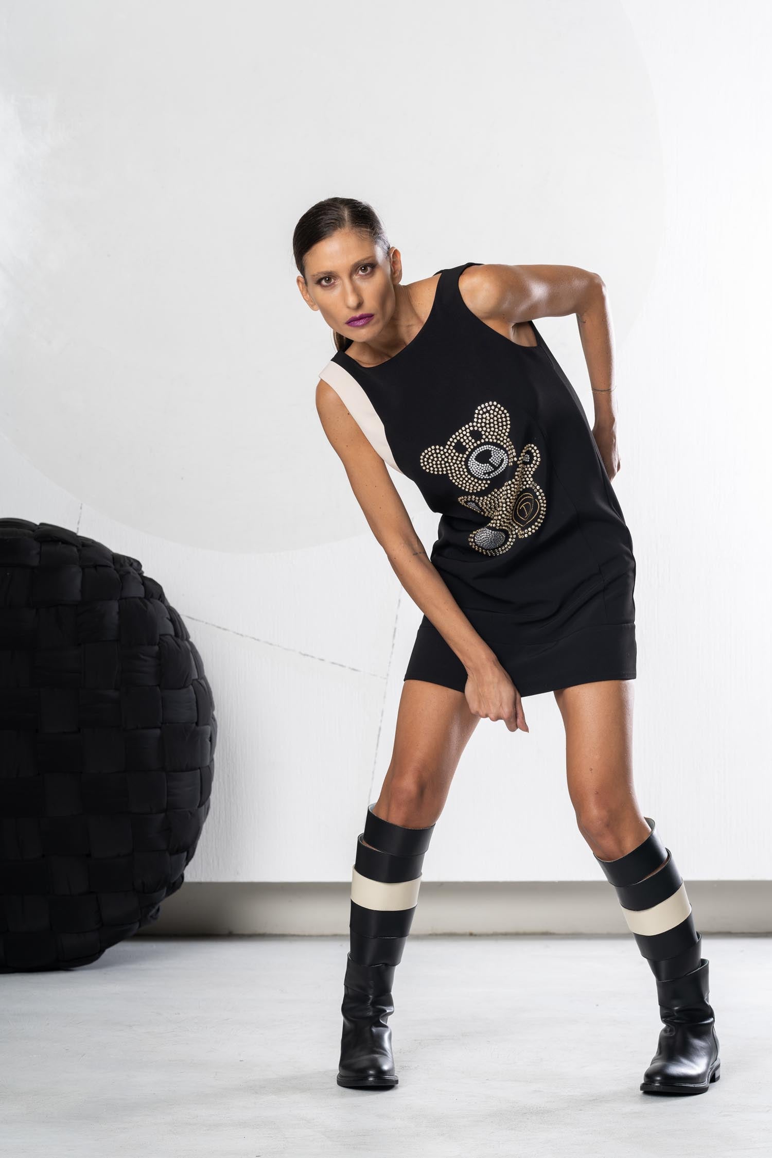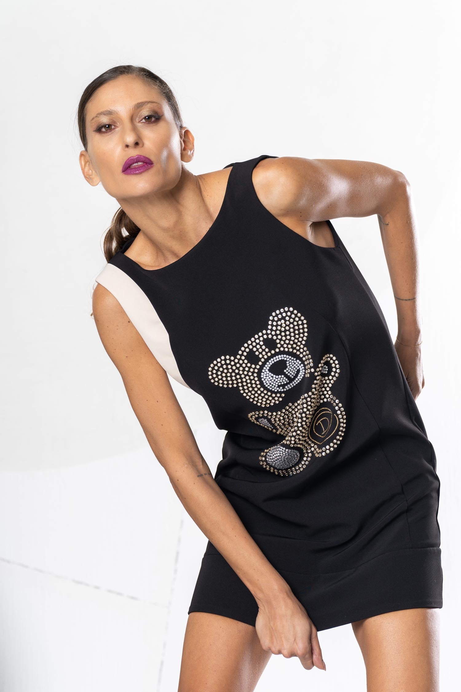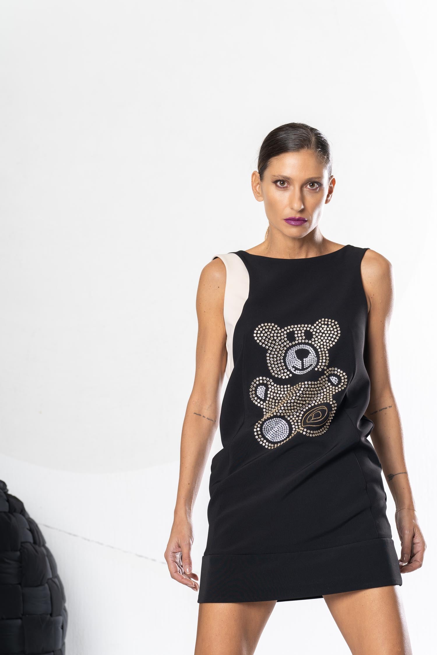 This short dress by DANIELA DALLAVALLE captivates with its elegant rhinestones in a bear pattern, adding a touch of glamour to the black or white design. Perfect for special occasions and making a stylish statement.