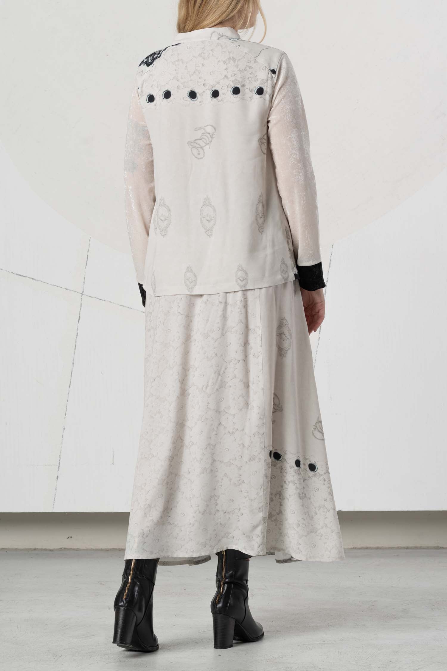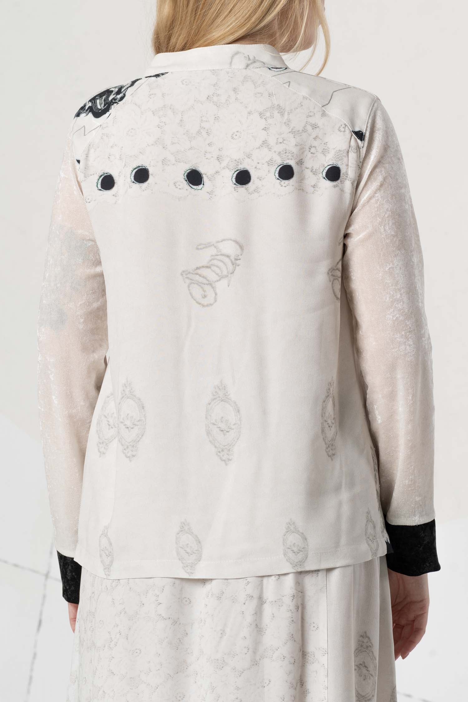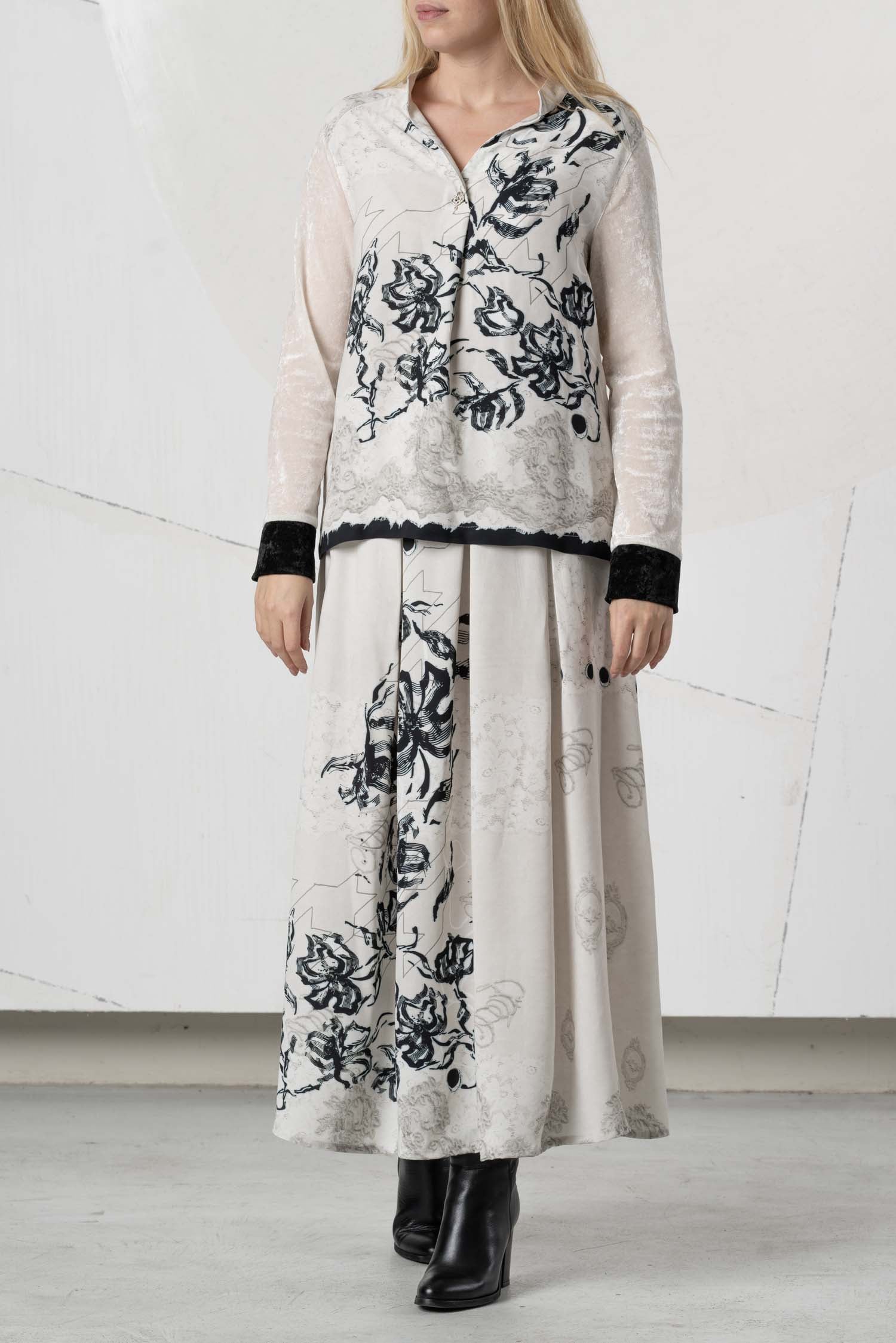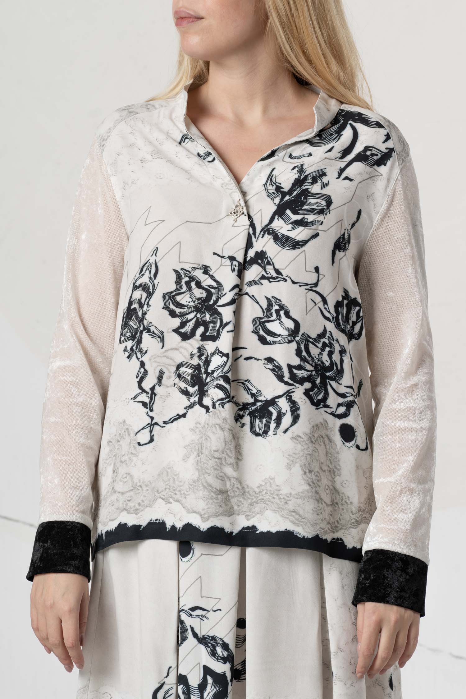 This blouse impresses with its elegant floral pattern in beige and black, combining timeless aesthetics with fashionable flair. The long sleeves ensure comfortable wear and make the garment particularly versatile – ideal for both professional and stylish casual looks. High-quality workmanship and carefully selected materials guarantee durability and a sophisticated appearance.