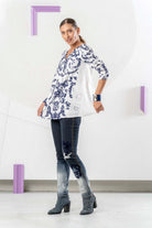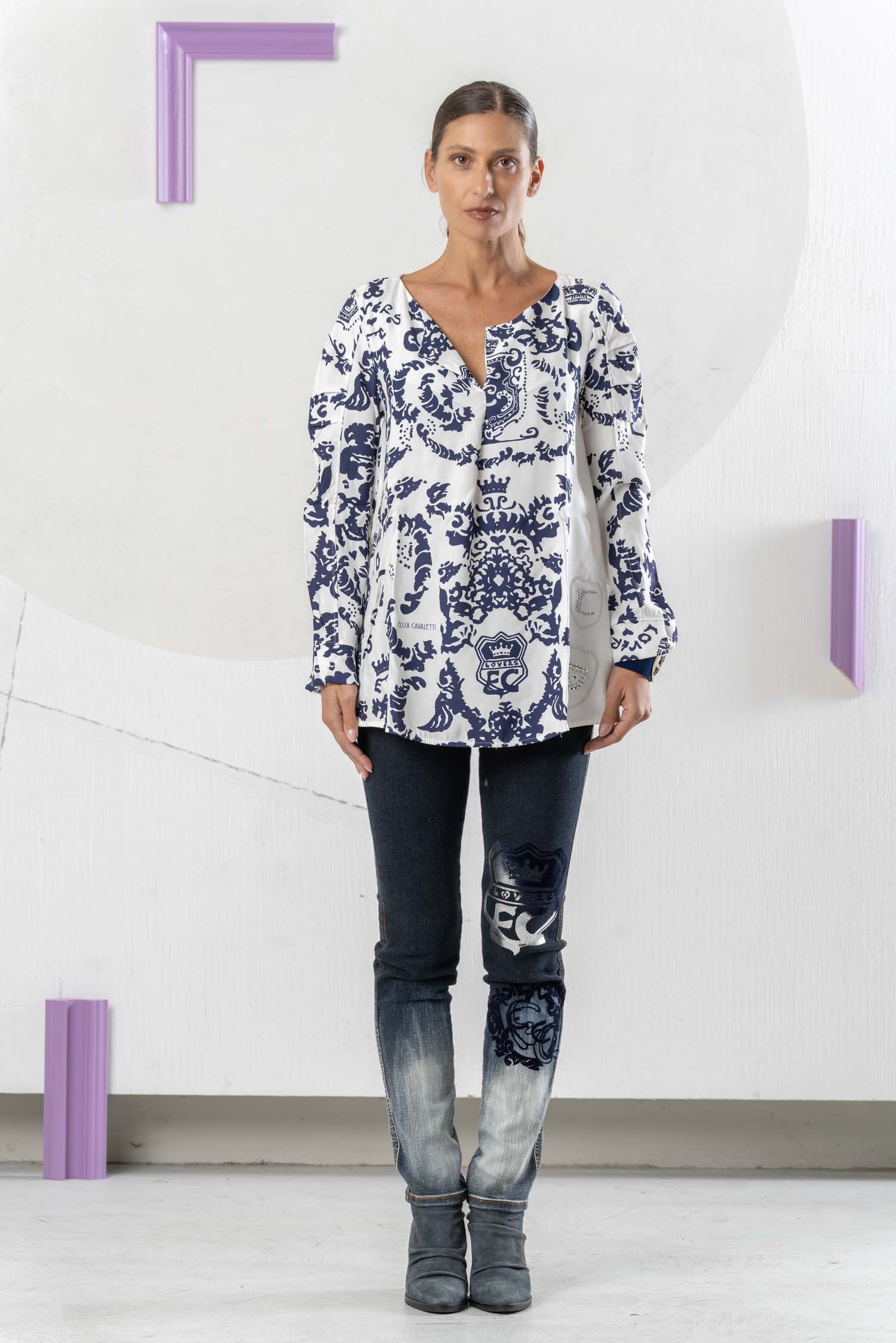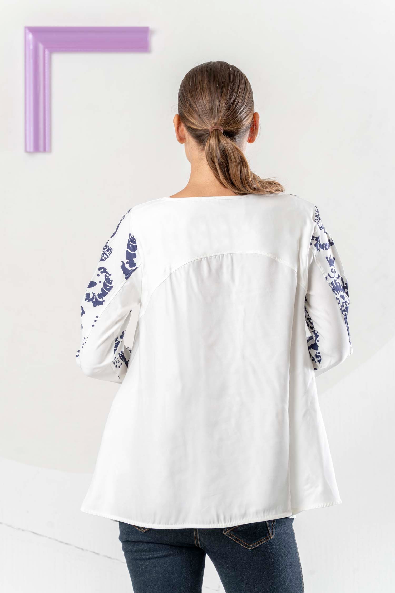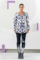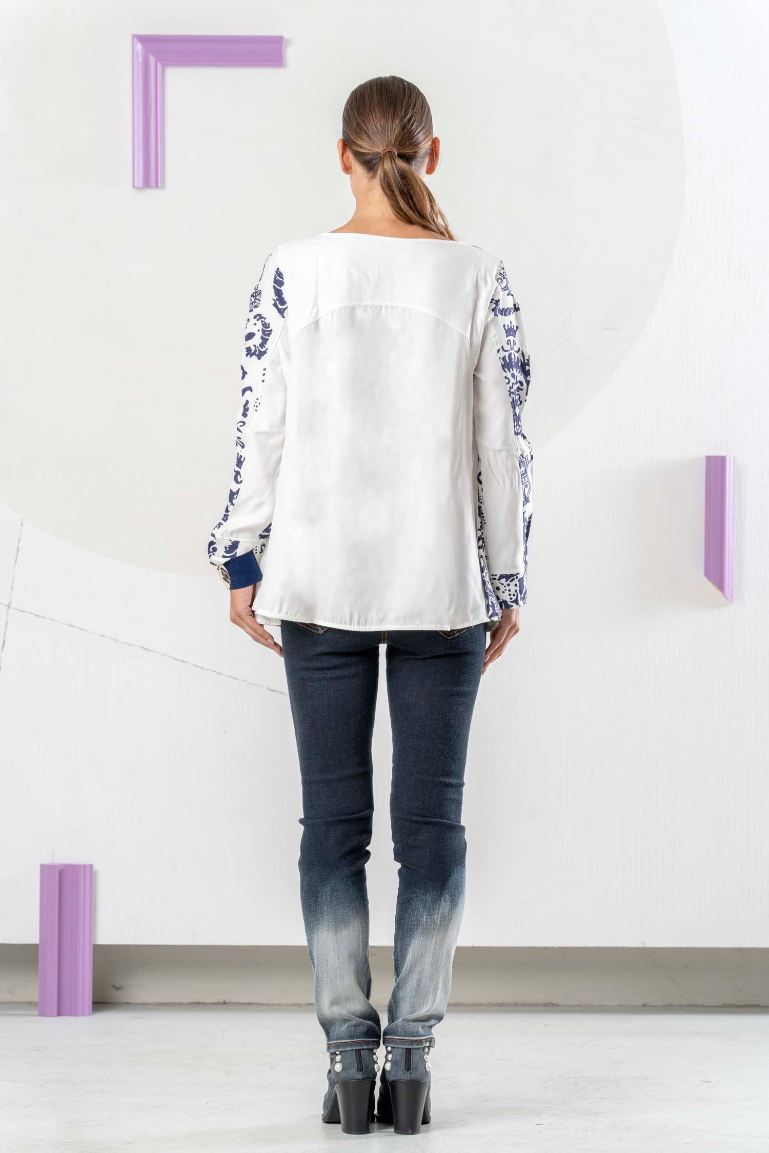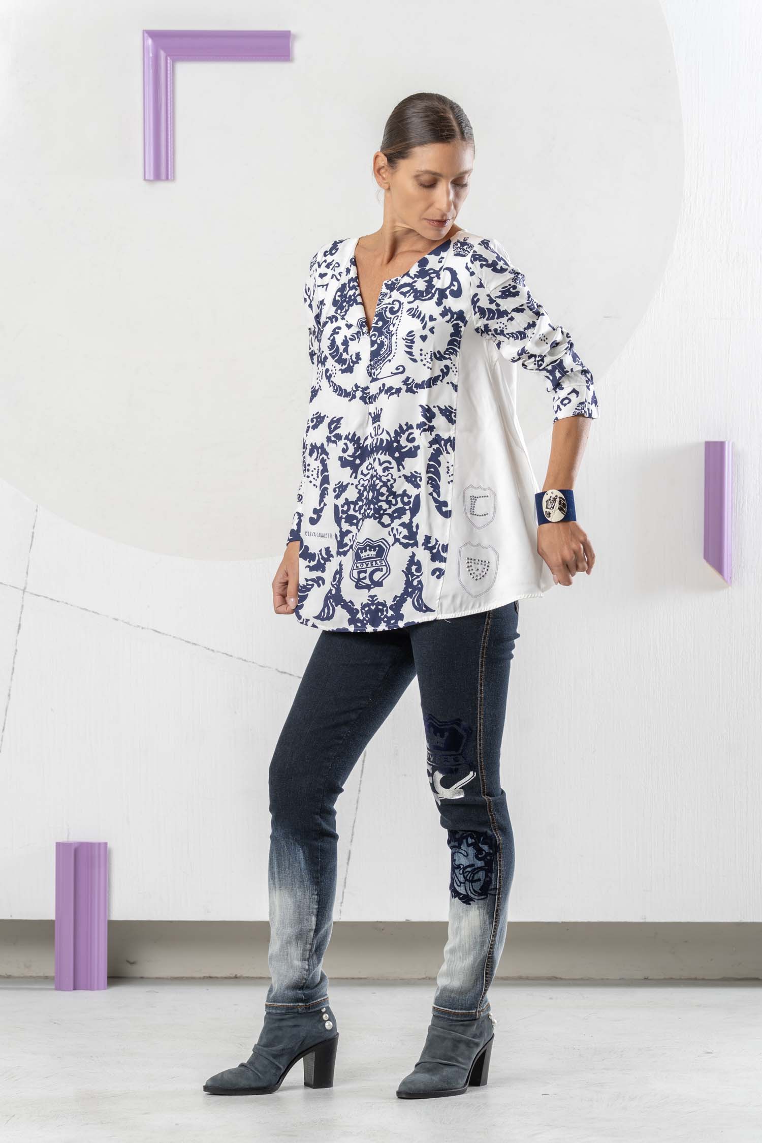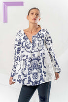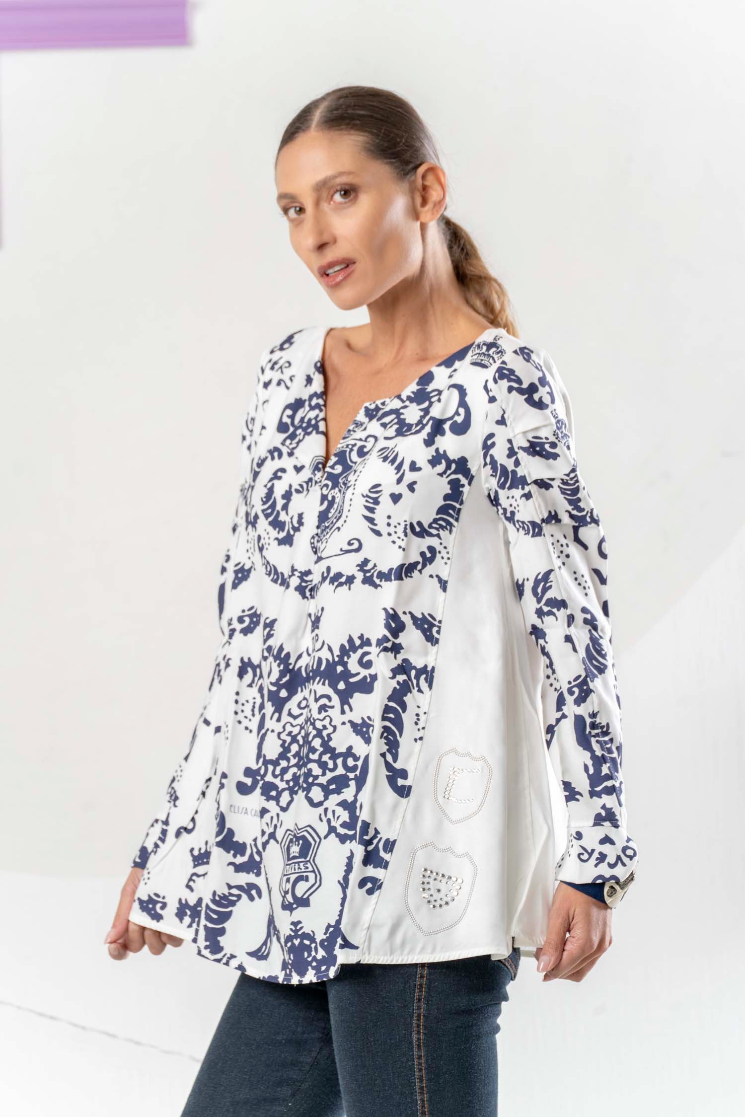 Bring your wardrobe to life with this stylish blouse! The unique white and dark blue design with a V-neck gives you a sophisticated look. Perfect for any occasion, whether at the office or in your free time. Show off your unique personality with this blouse!