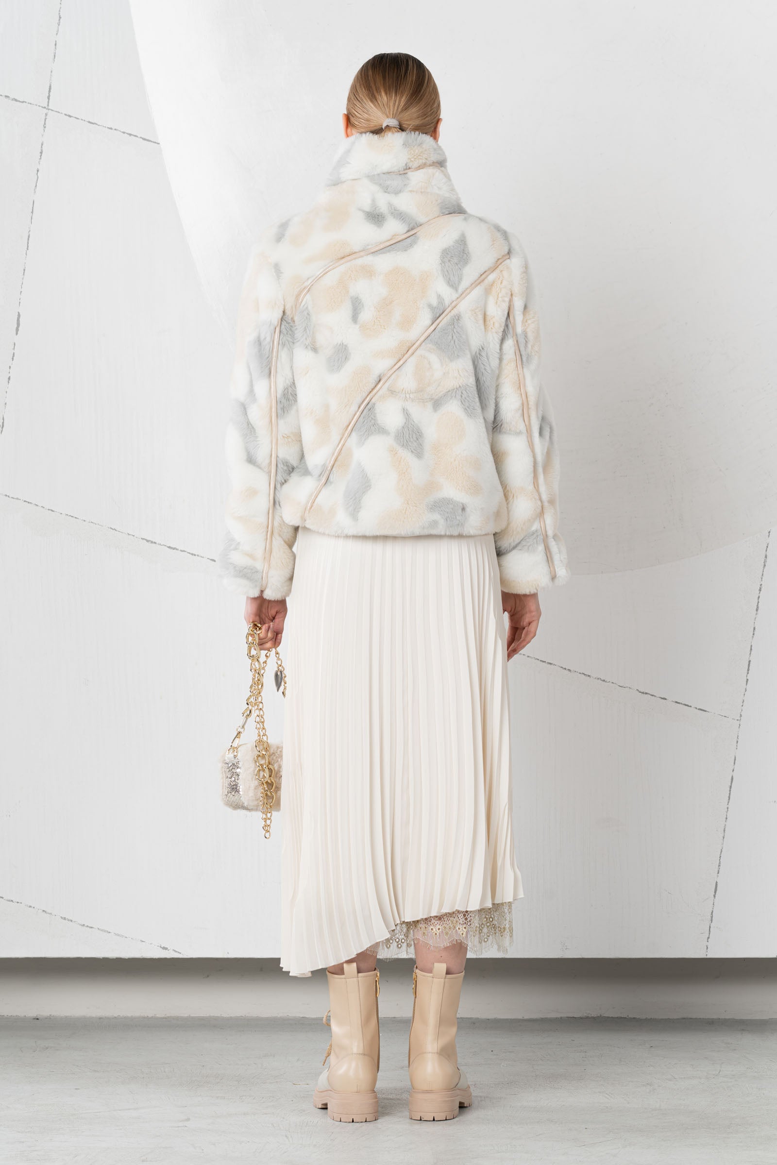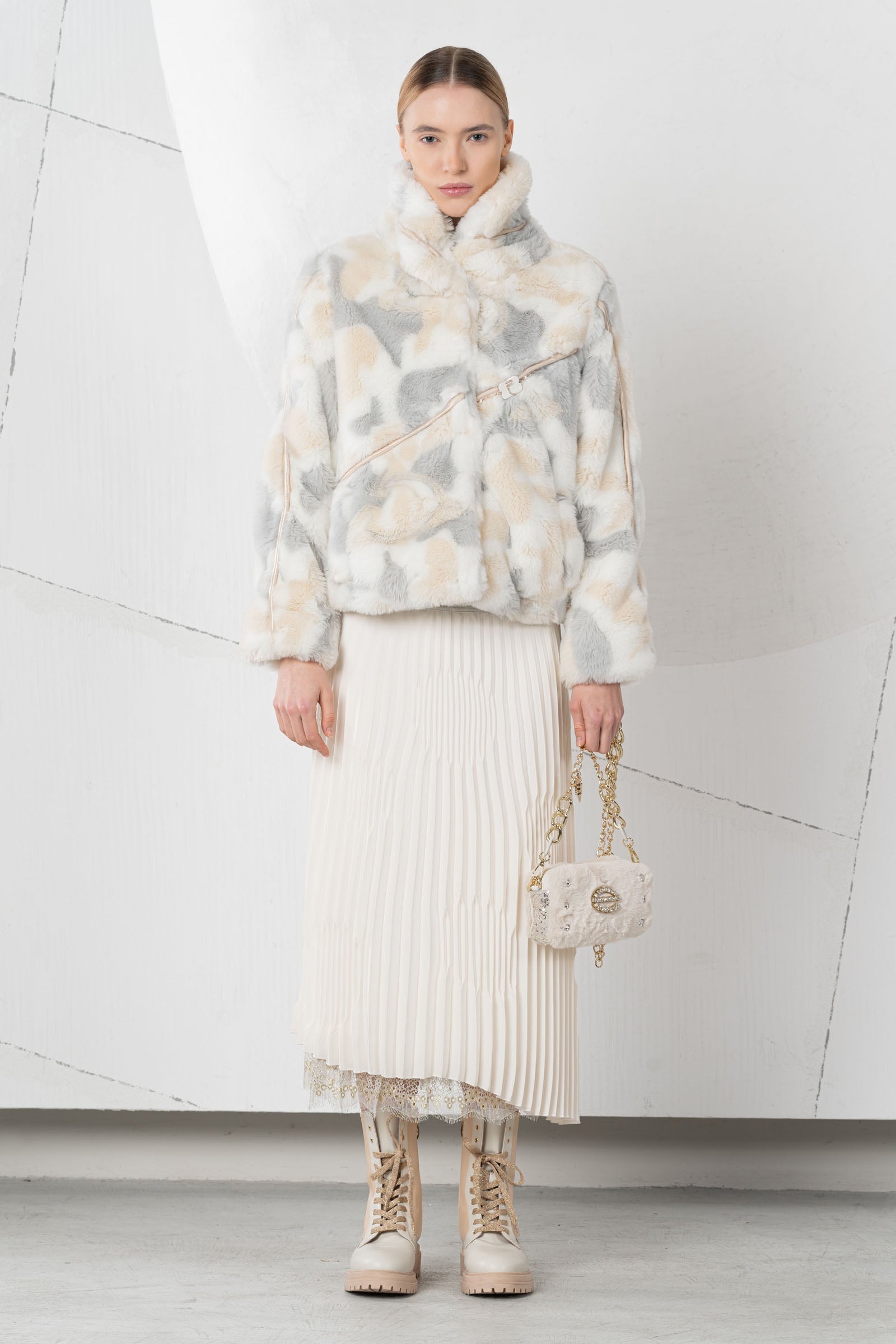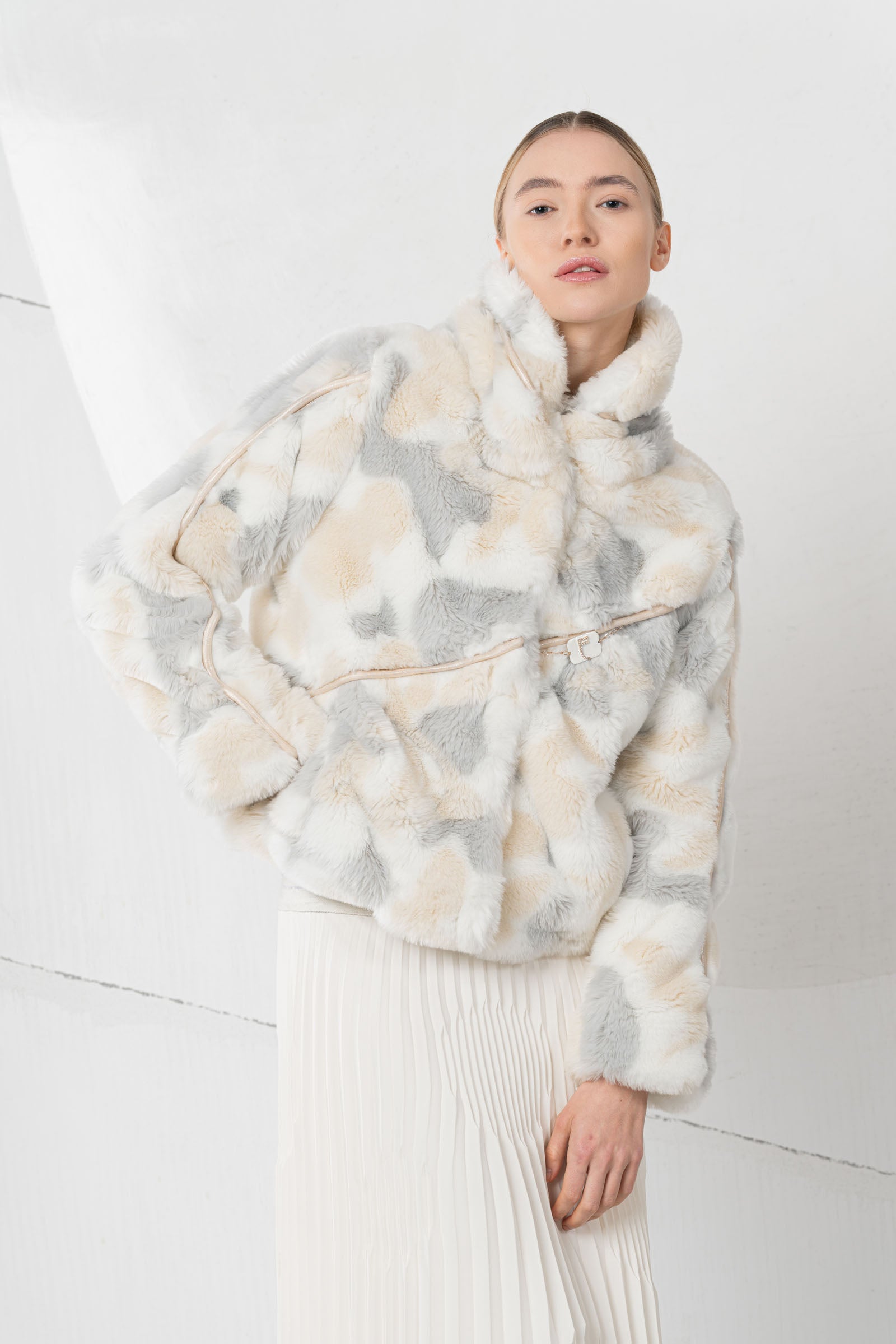 Discover the cozy Incontro fur jacket from ELISA CAVALETTI! Available in white, beige, and grey, it offers a striking visual contrast. It also keeps you wonderfully warm and invites you to snuggle up. Enjoy comfort and style in one garment!