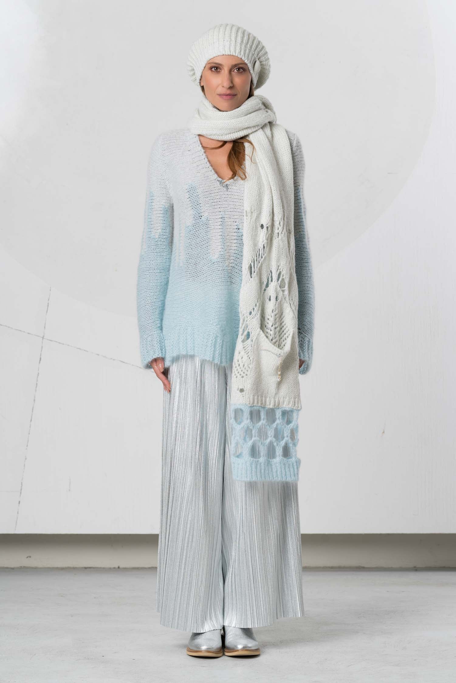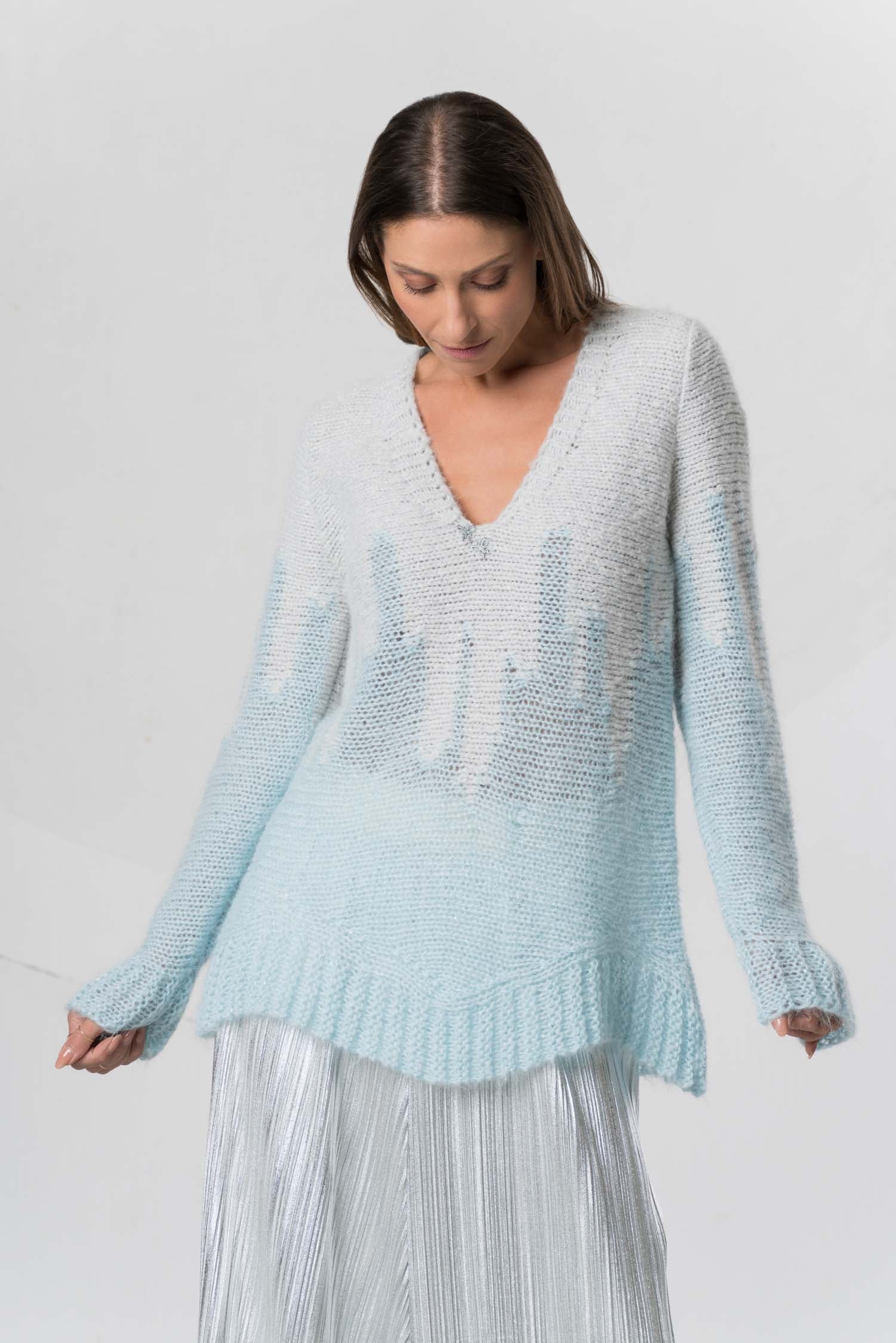 This stylish knit sweater combines comfort with elegant simplicity. Made from high-quality alpaca wool, it offers an exceptionally soft feel and warm comfort. The V-neck adds a subtle touch, while the harmonious interplay of light gray and light blue creates a modern, versatile look. Ideal for discerning fashionistas who value quality and style.