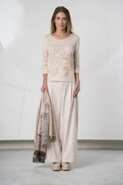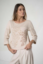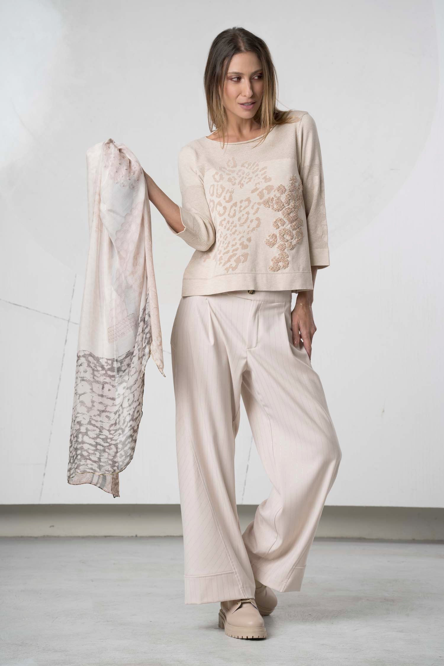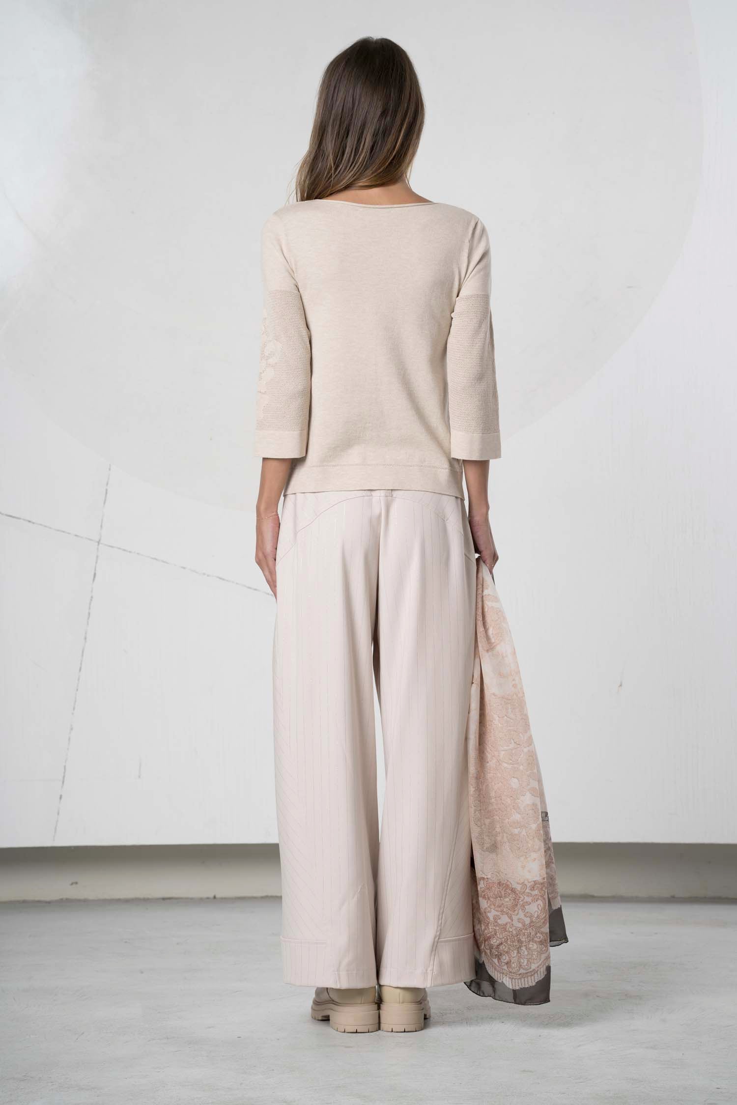 This modern knit sweater impresses with its elegant beige color and three-quarter sleeves, ideal for unpredictable weather. The carefully designed fit ensures a comfortable and flattering feel with any outfit. The subtle pattern adds a stylish touch, making the sweater incredibly versatile. A thoughtfully chosen piece for discerning wardrobes.