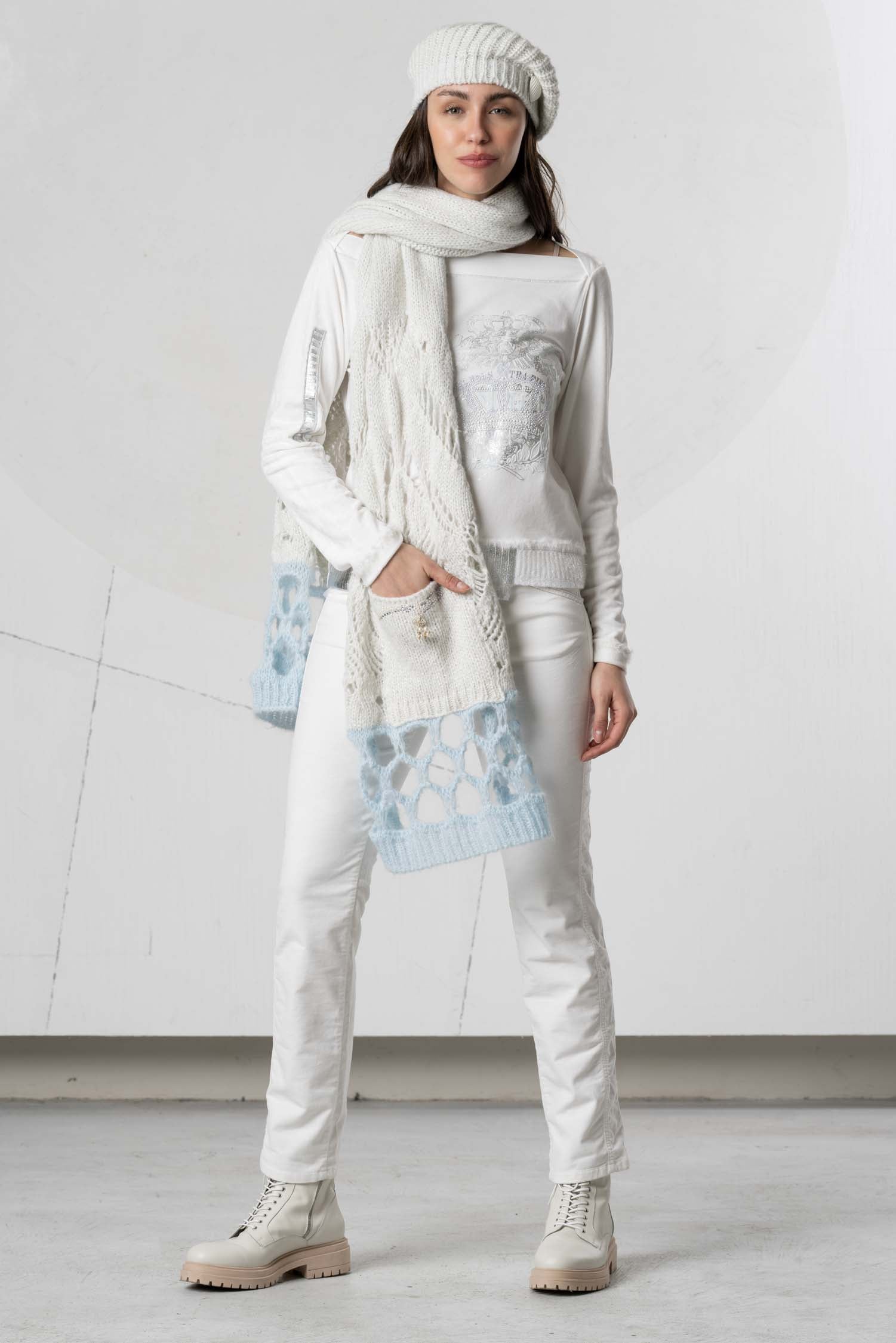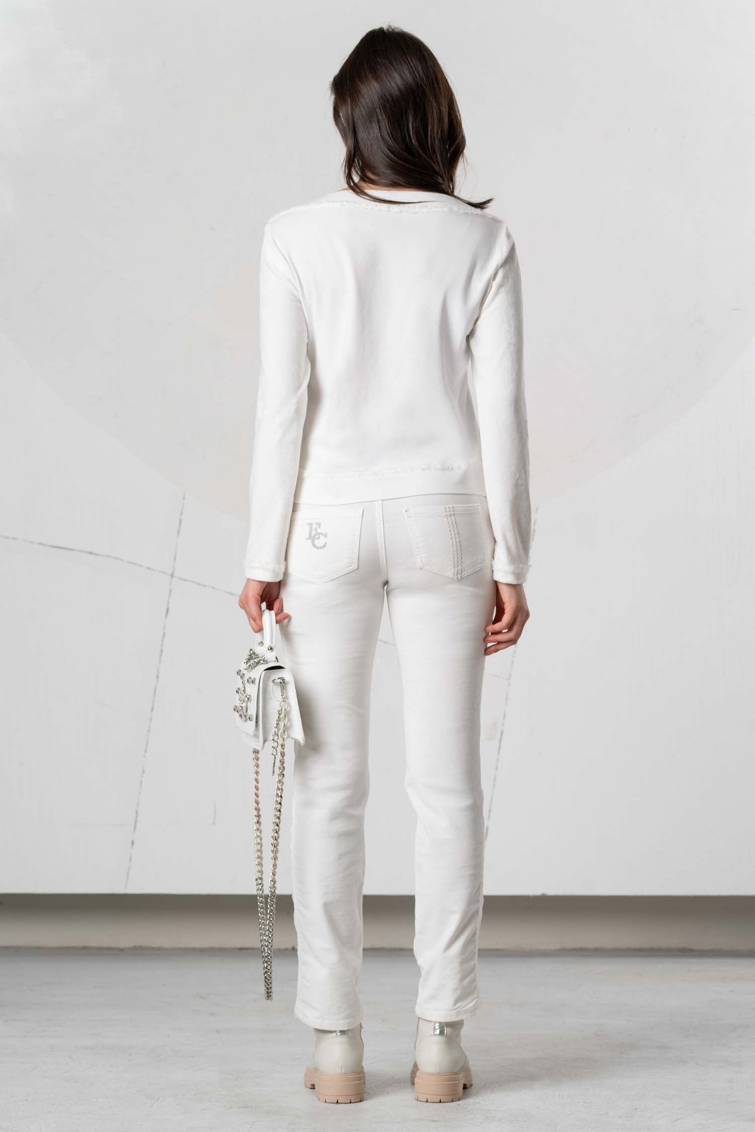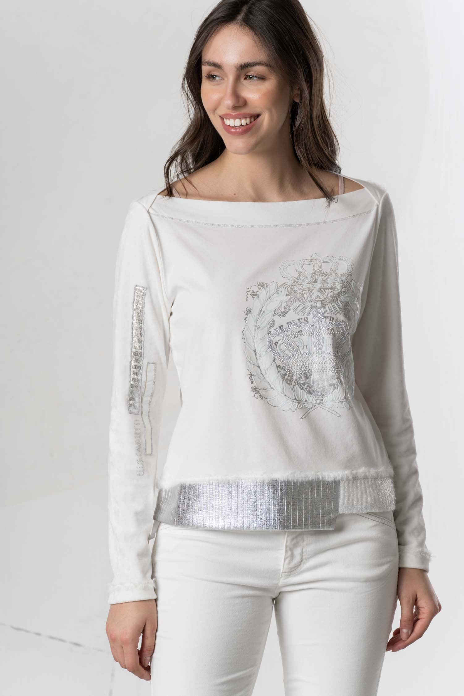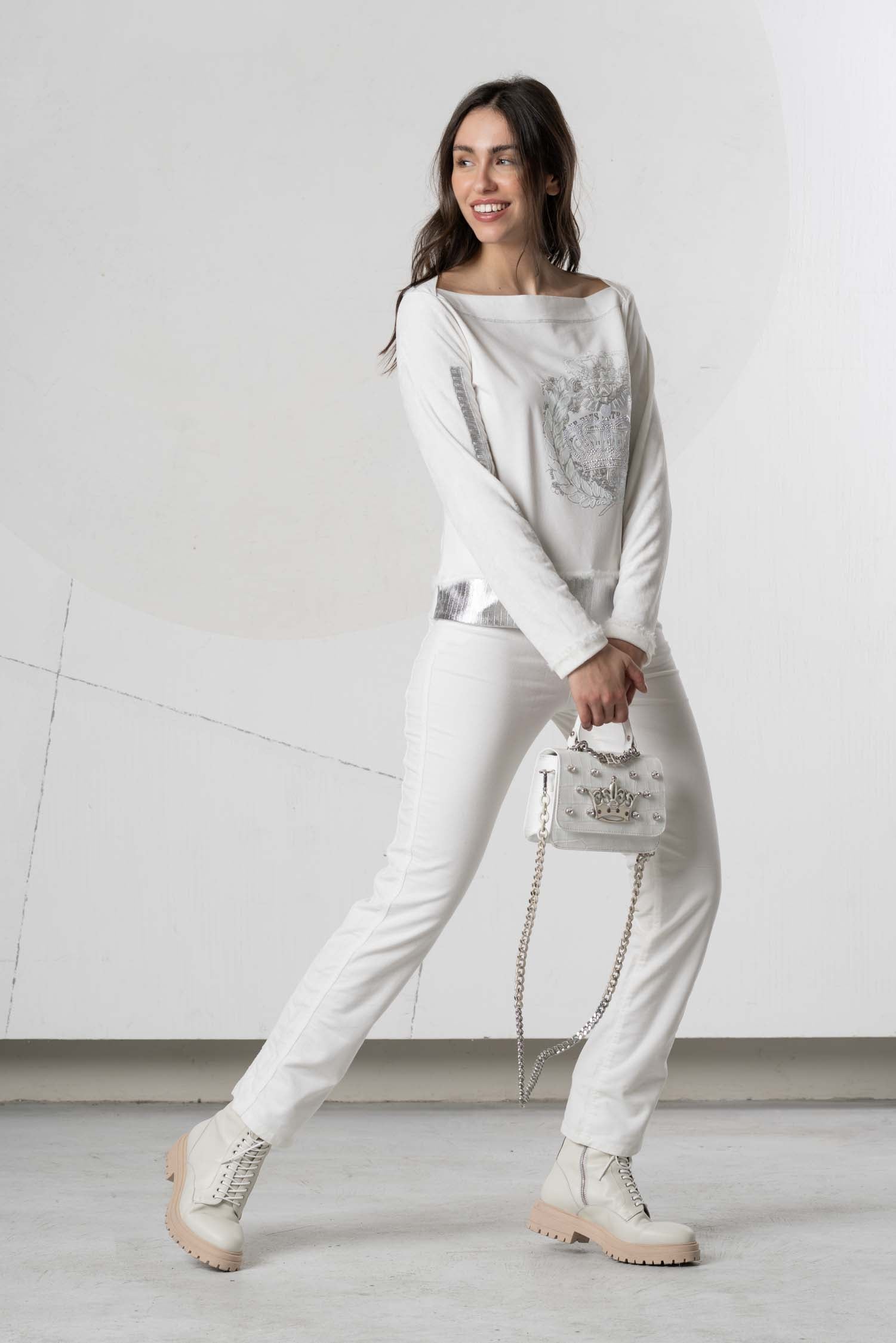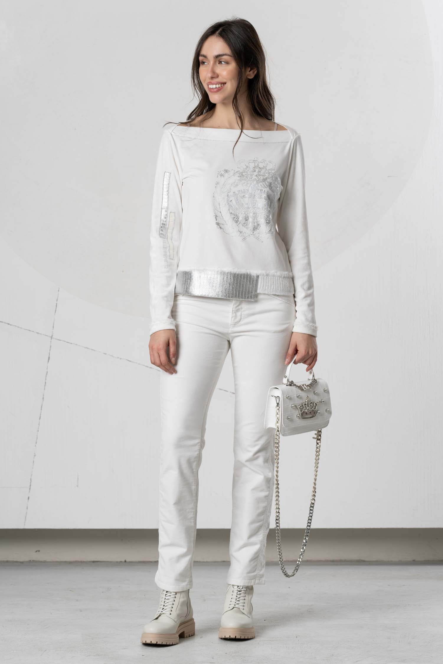 This stylish sweatshirt comes in elegant white with subtle silver appliqués that add a modern touch. The long sleeves offer comfort and versatile styling options. The combination of different fabrics creates an appealing variety of textures, making the design unique while ensuring a comfortable fit. Ideal for sophisticated looks that appreciate subtle details.