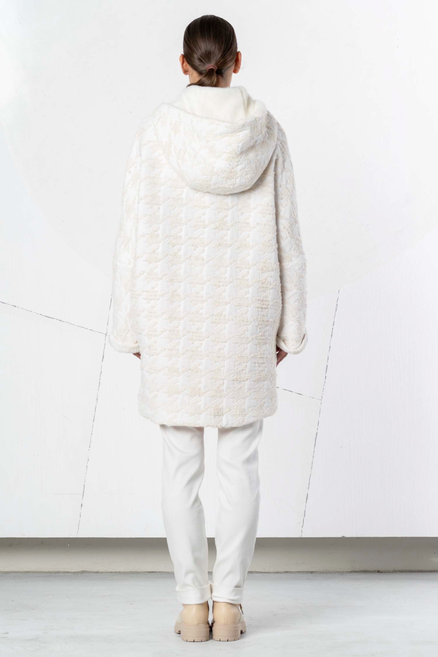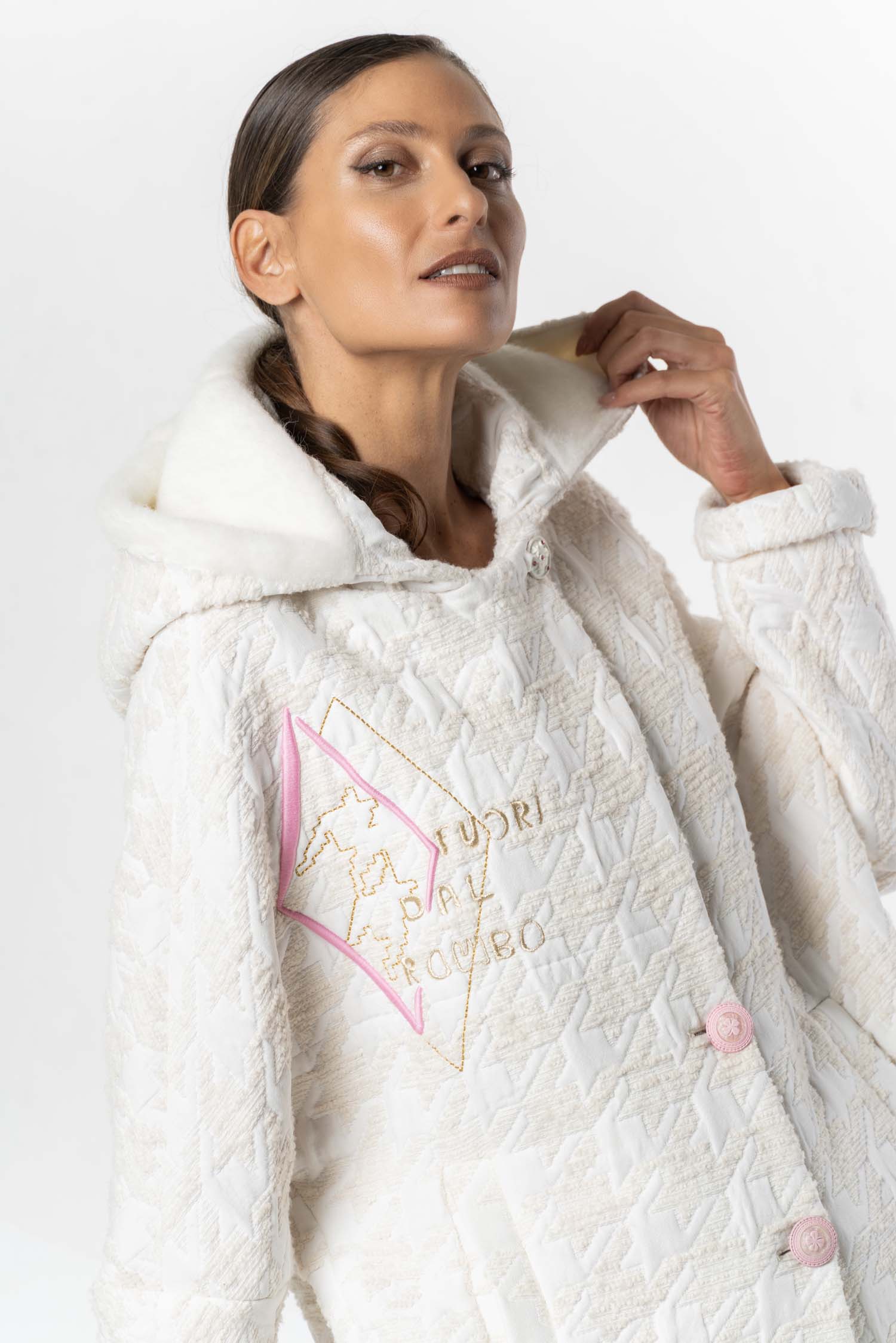 The ELISA CAVALETTI winter coat impresses with its creamy white color and delicate pink appliqués, which lend the design an elegant touch. The wool content ensures pleasant warmth and exceptional comfort during the cold season. This model combines stylish looks with functional quality and is ideal for discerning winter wardrobes.