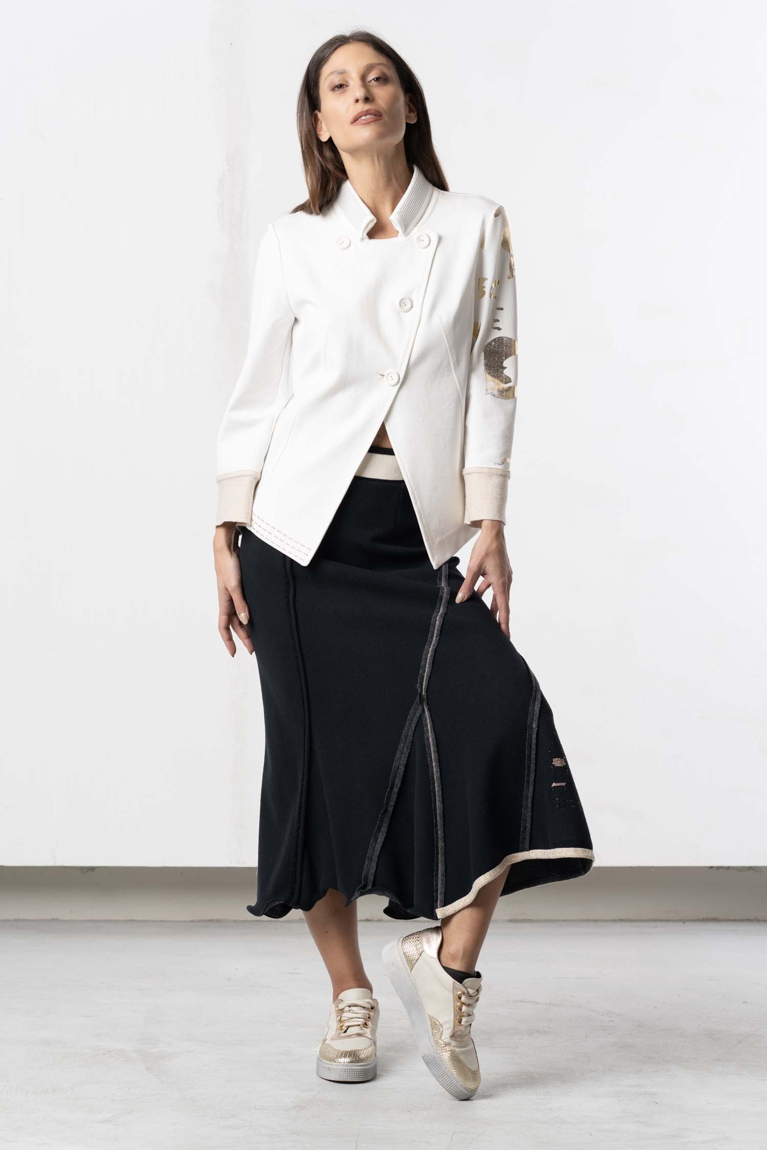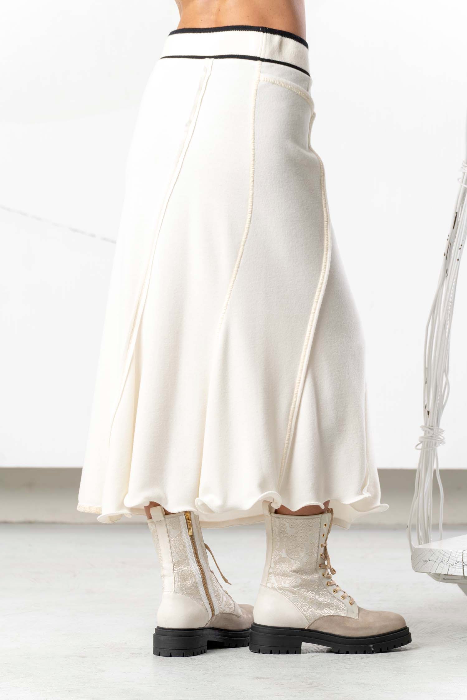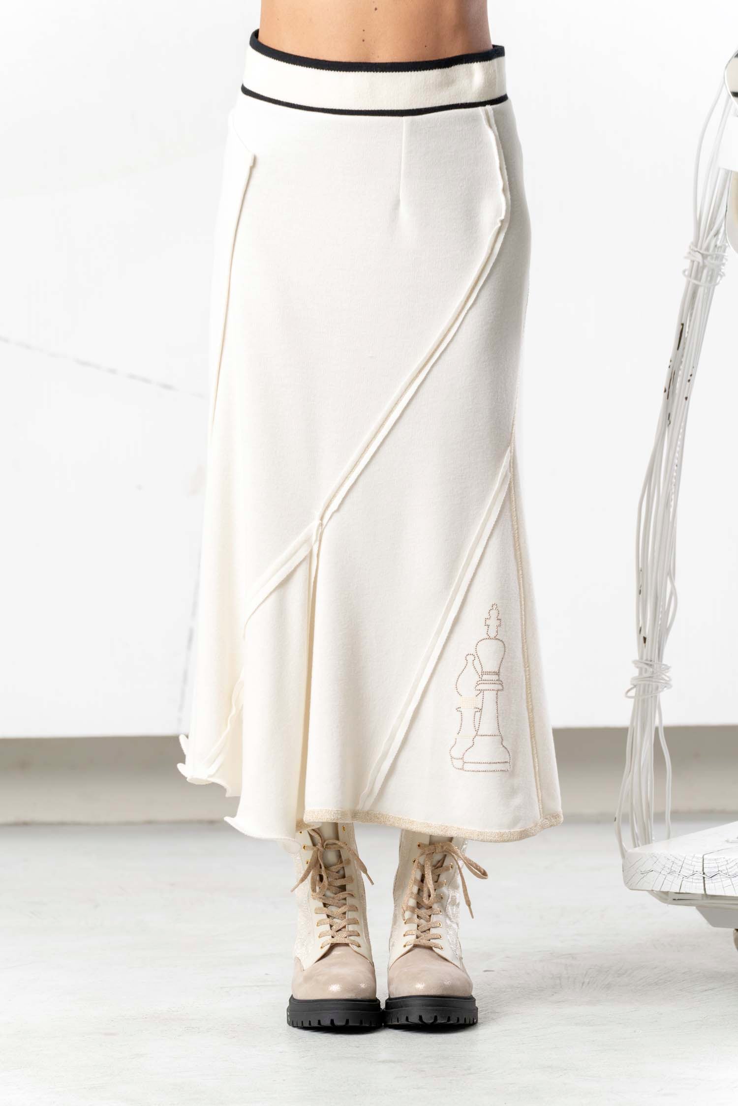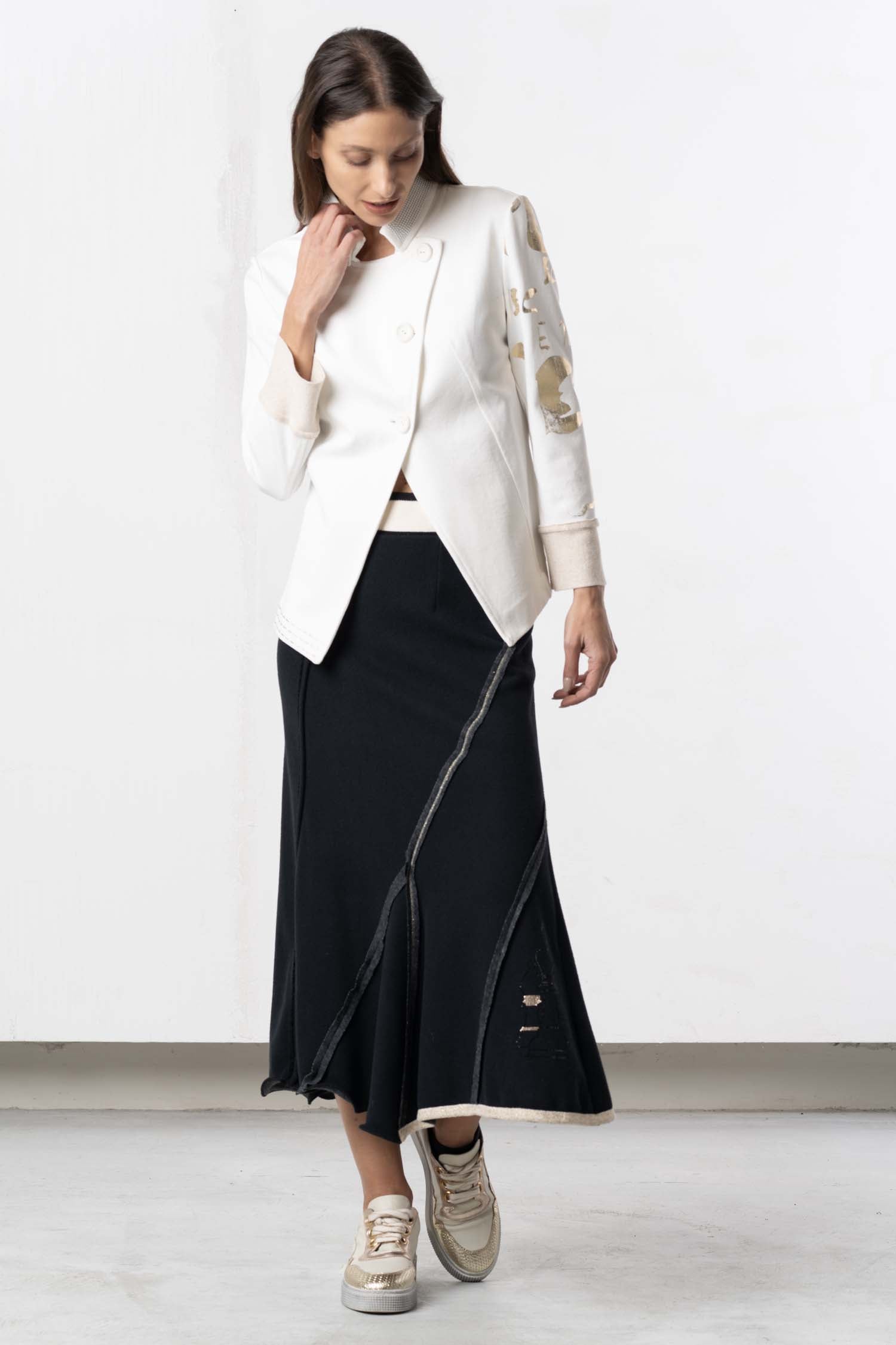 This elegant, long skirt in delicate cream and black captivates with its timeless beauty and versatile wearability. The comfortable waistband sits perfectly and offers pleasant comfort all day long. The flowing fabric flatters the silhouette and creates a feminine, sophisticated look. Ideal for style-conscious women who value quality and design – a must-have for every modern wardrobe that can be effortlessly combined with everything from classic to casual outfits.