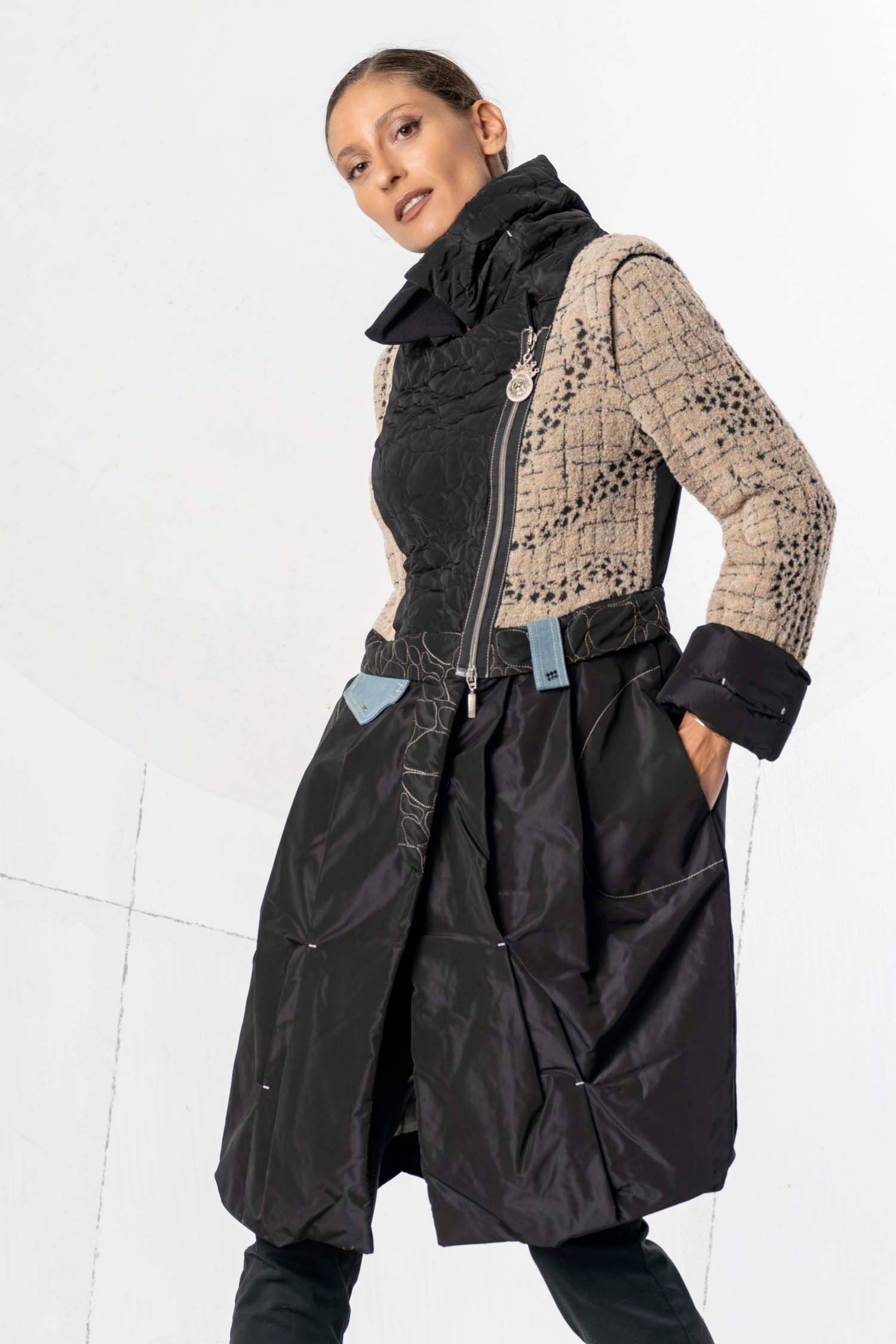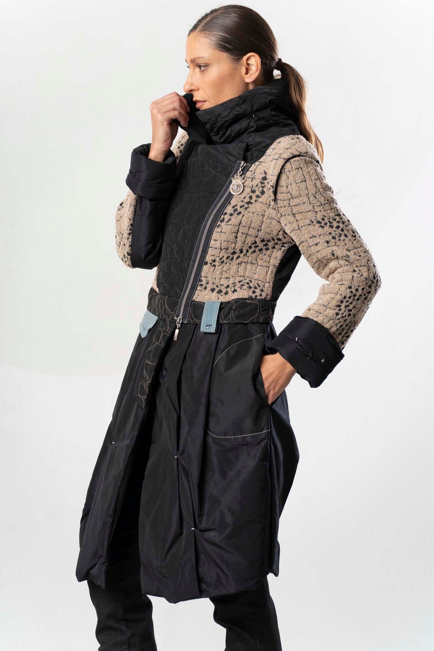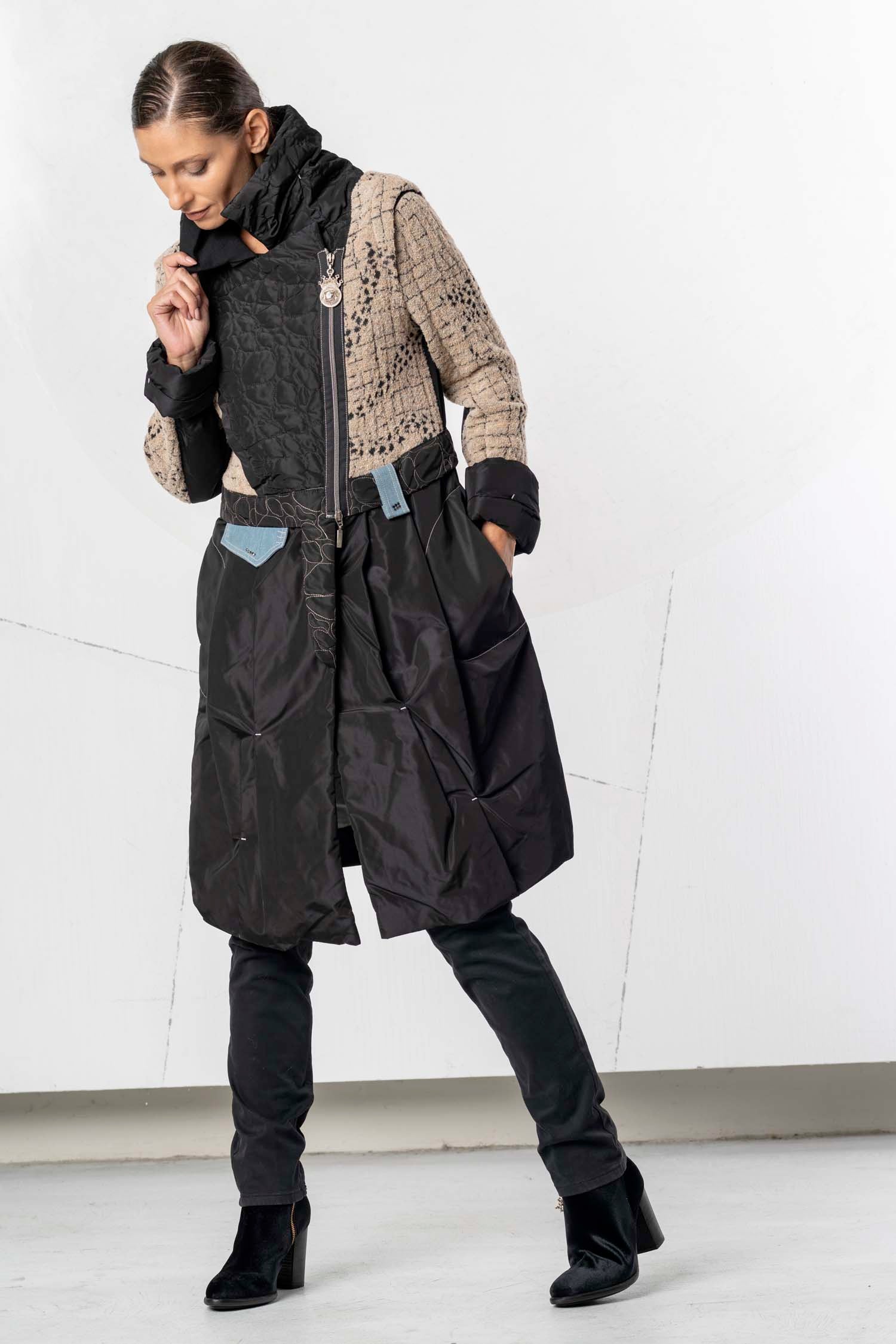 Ce manteau élégant associe différentes matières et textures pour un style moderne et sophistiqué. La partie supérieure est confectionnée dans un tissu beige texturé rehaussé de détails noirs, tandis que la partie inférieure est réalisée dans une matière noire brillante qui lui confère un drapé impeccable. Le col montant et les détails de fermeture éclair originaux apportent une touche urbaine et tendance. Des poches pratiques et une ceinture décorative complètent le modèle. Un vêtement polyvalent, à la fois élégant et fonctionnel.