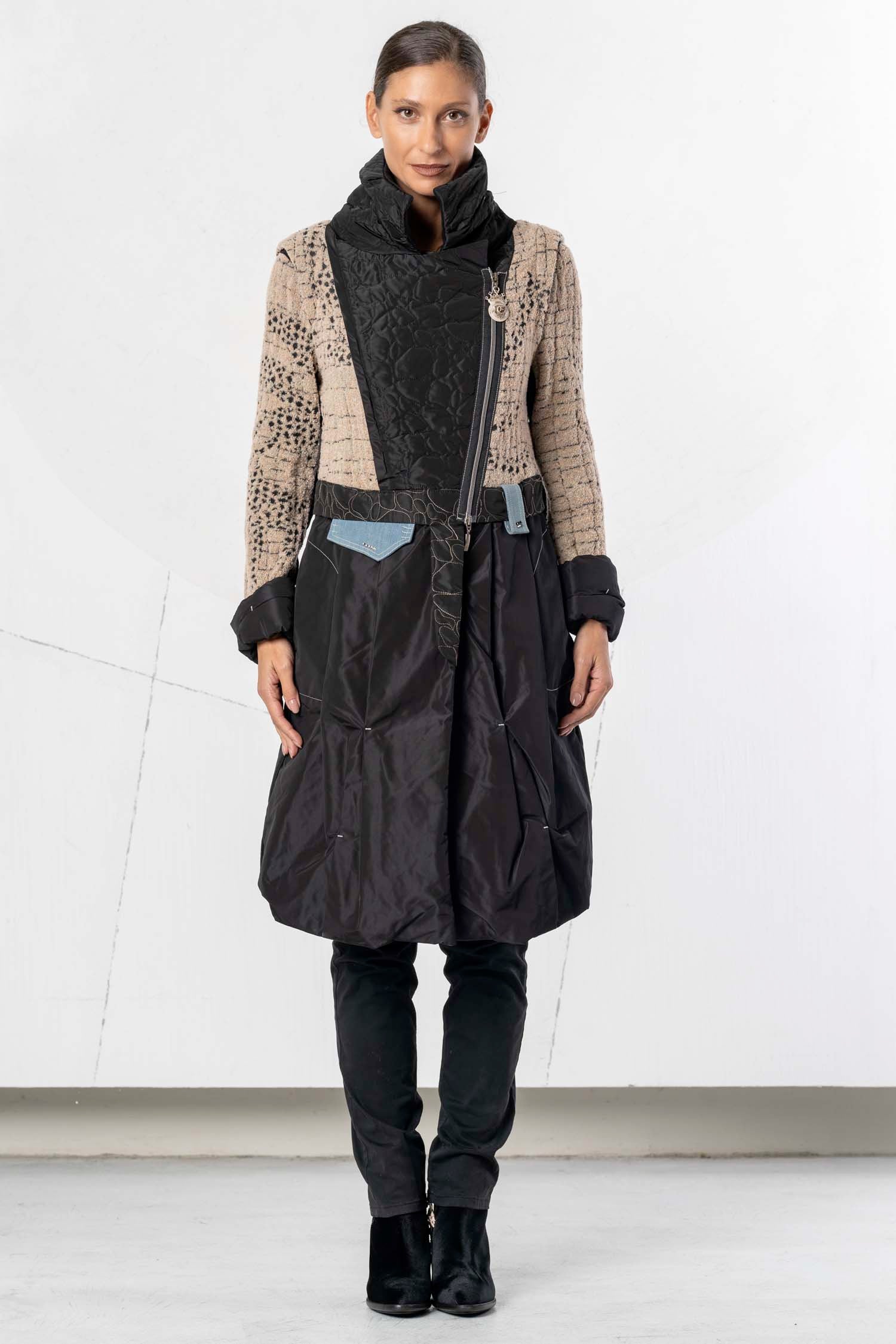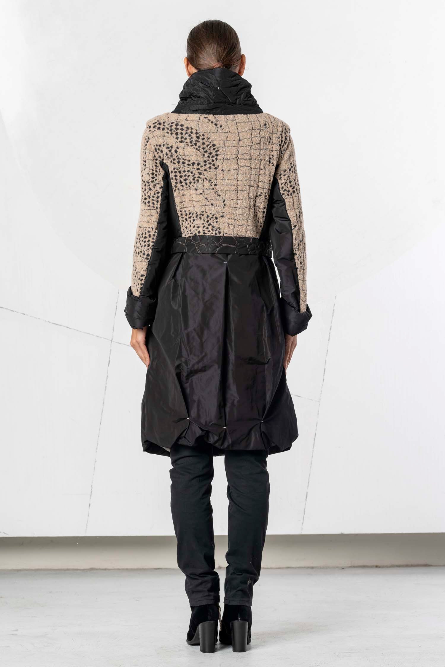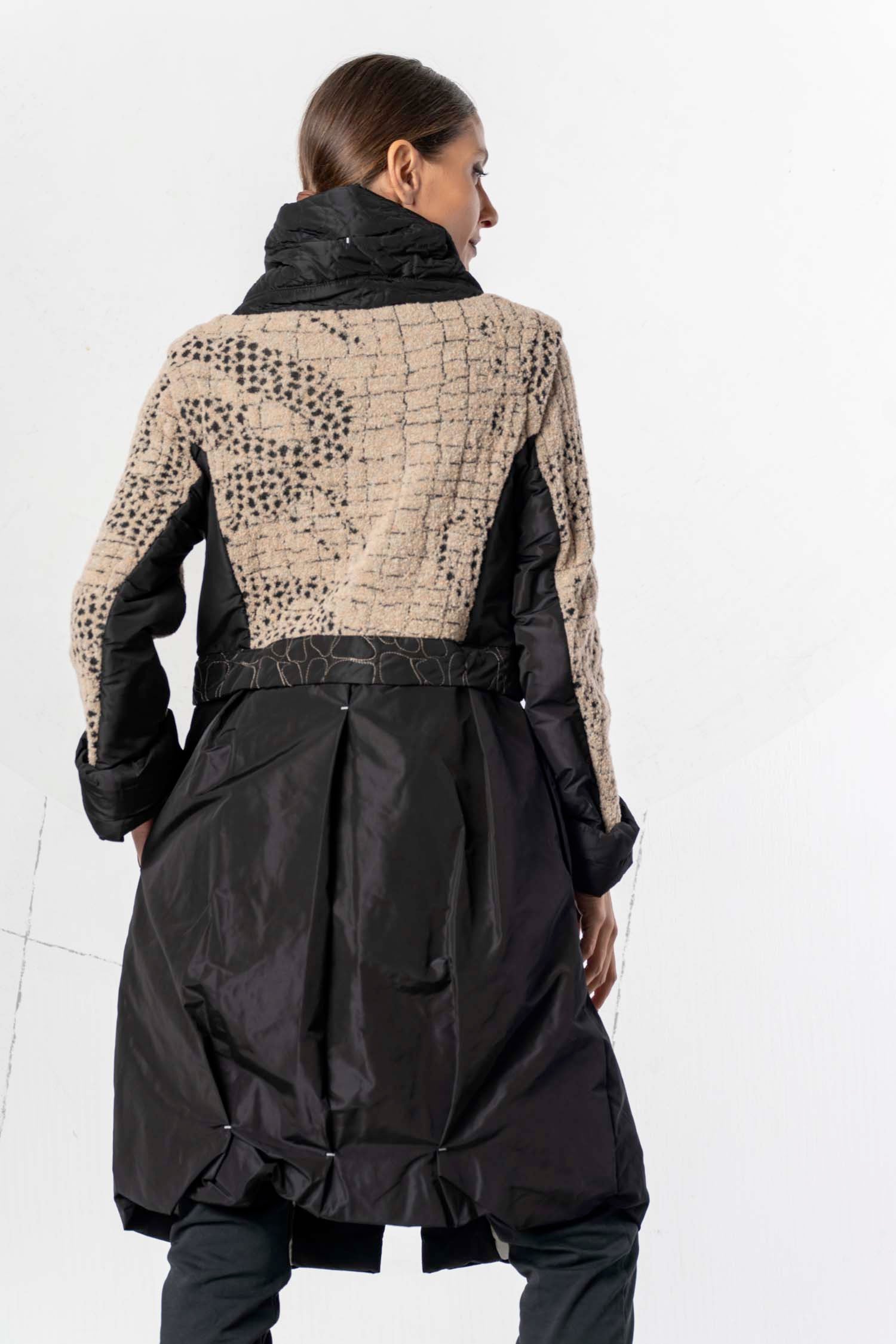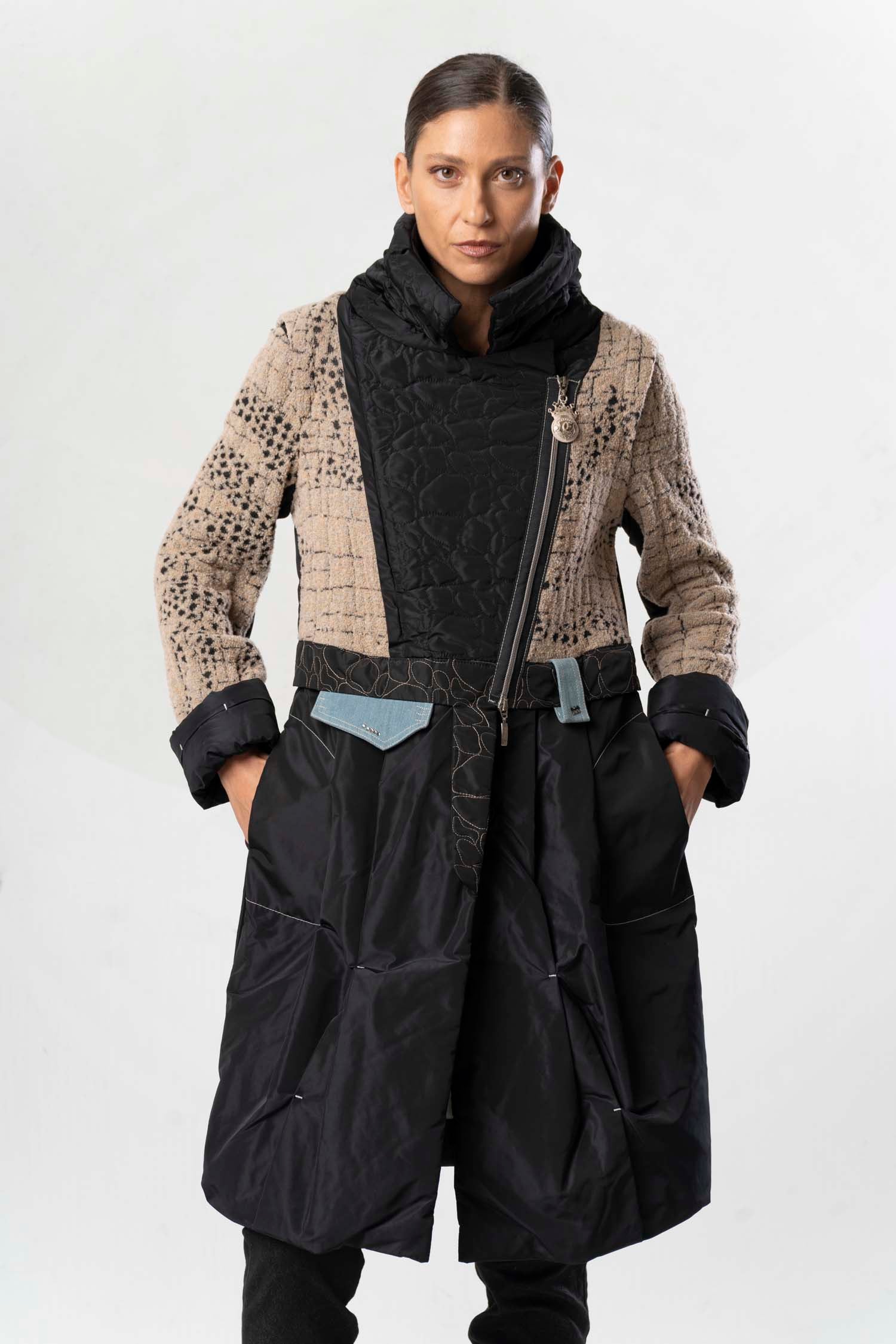 Ce manteau élégant associe différentes matières et textures pour un style moderne et sophistiqué. La partie supérieure est confectionnée dans un tissu beige texturé rehaussé de détails noirs, tandis que la partie inférieure est réalisée dans une matière noire brillante qui lui confère un drapé impeccable. Le col montant et les détails de fermeture éclair originaux apportent une touche urbaine et tendance. Des poches pratiques et une ceinture décorative complètent le modèle. Un vêtement polyvalent, à la fois élégant et fonctionnel.