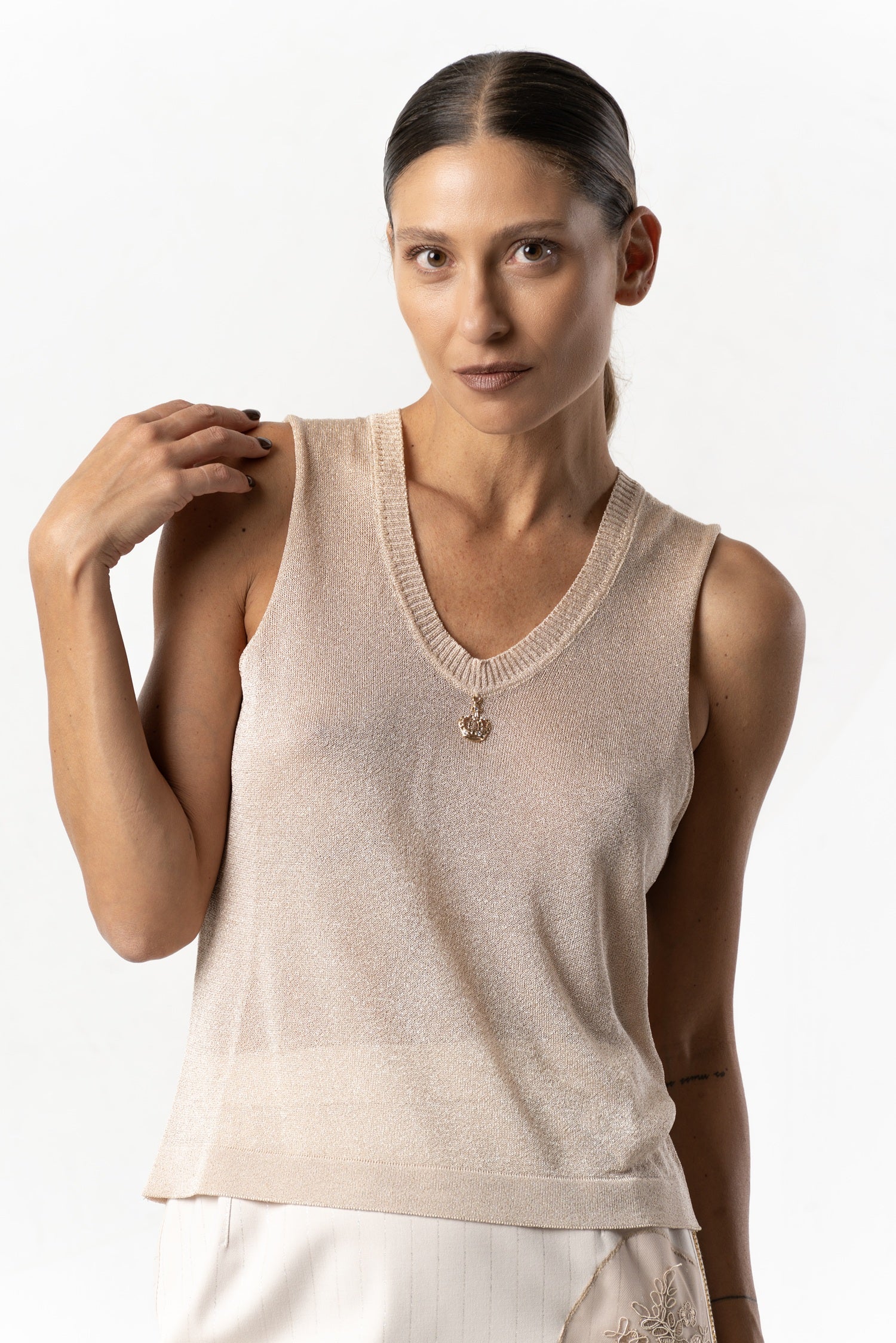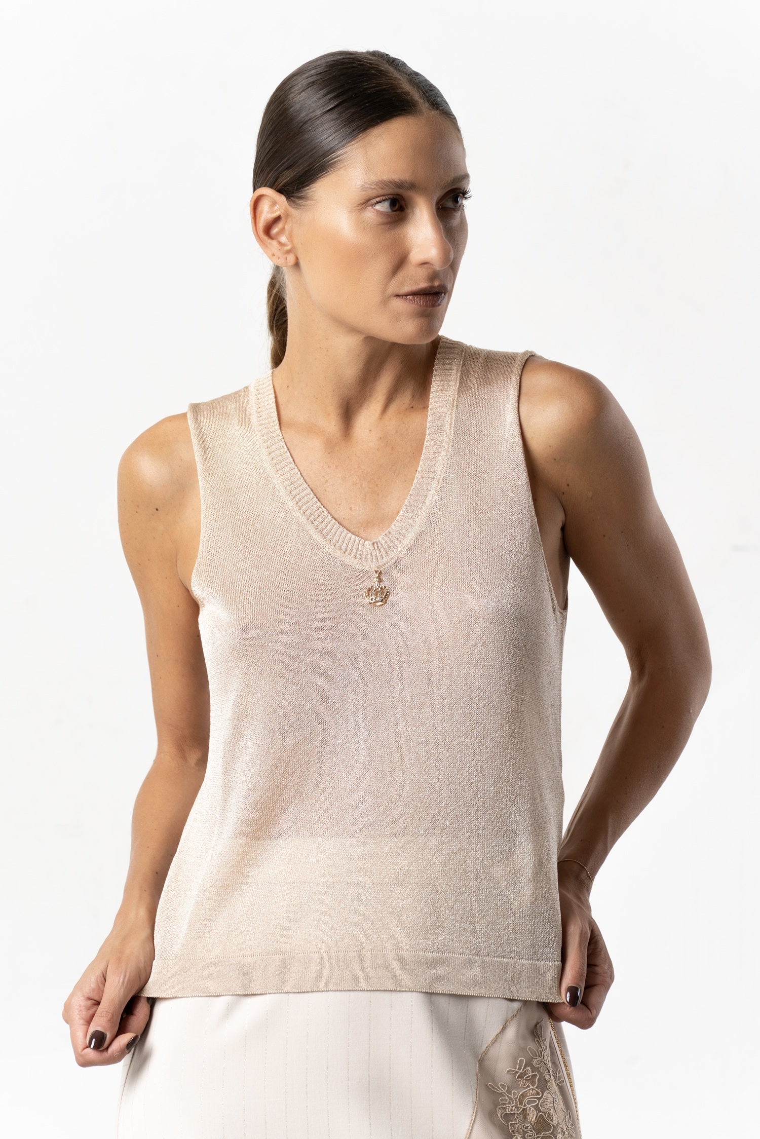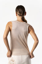 Ce top en maille séduit par sa teinte marron clair et ses larges bretelles, créant une allure élégante et raffinée. Sa confection de haute qualité garantit un confort optimal et une grande polyvalence – idéal pour composer des tenues sophistiquées.