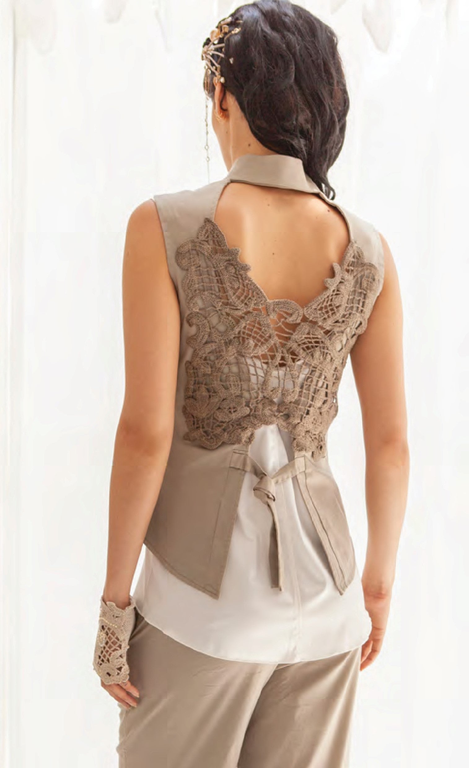 Pantalon en tissu beige/marron à jambes larges et petites applications.