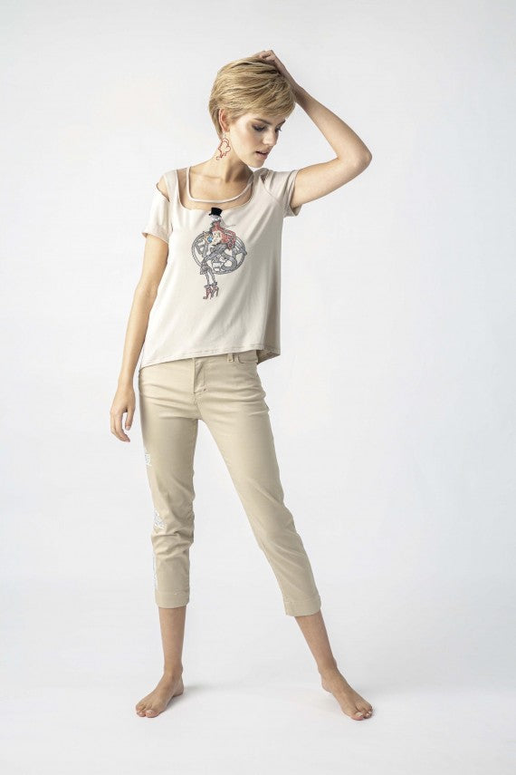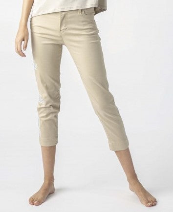 Pantalon d'été beige décontracté (longueur 3/4) orné de strass sur la jambe et la poche arrière.