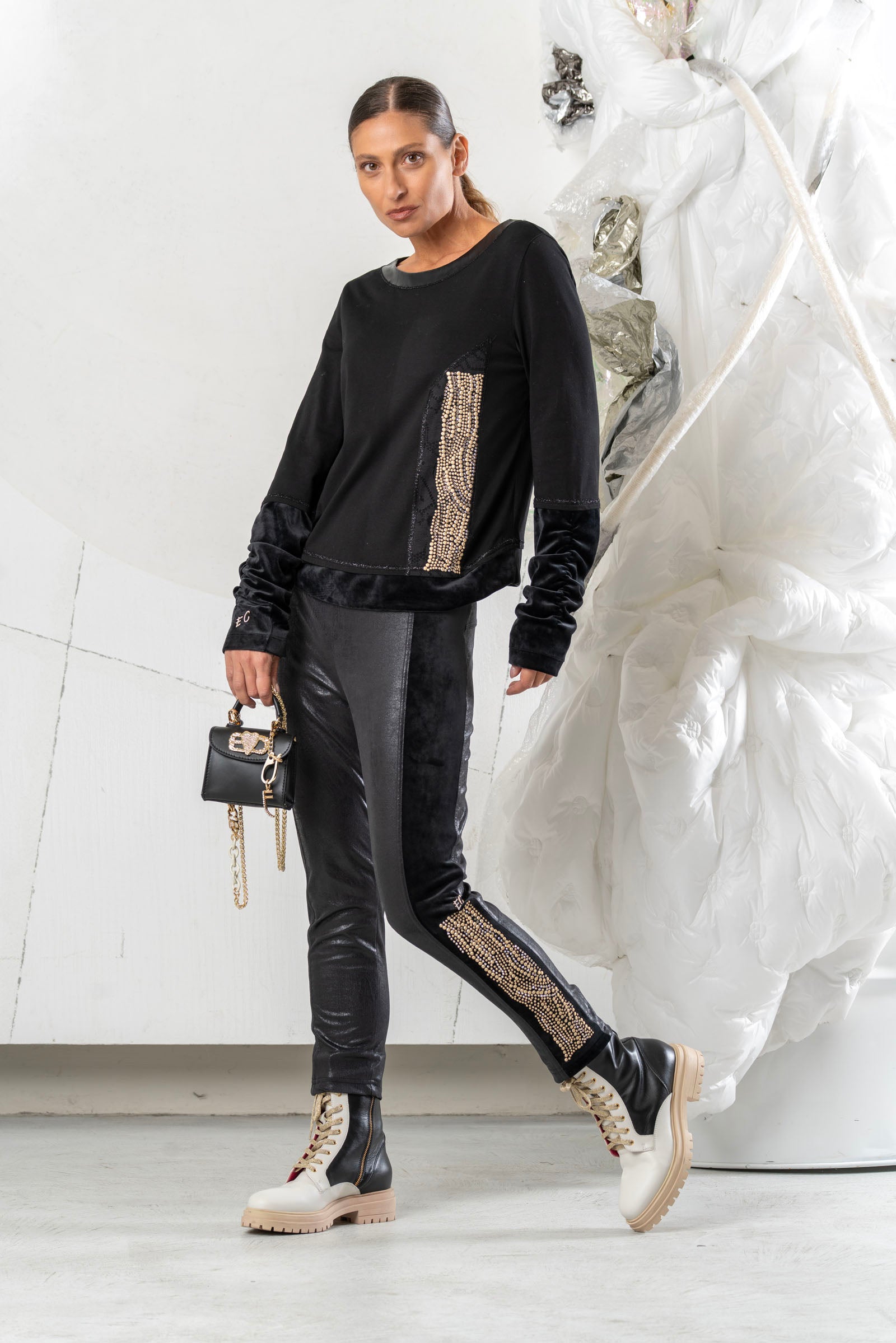 Diese schmal geschnittene Hose überzeugt mit einer edlen Lederoptik und hohem Tragekomfort durch den elastischen Bund. Der seitliche Zierstreifen mit feinen Glanzdetails setzt einen modernen Akzent und streckt optisch das Bein. Ein stilvoller Allrounder für lässige wie auch elegante Looks.