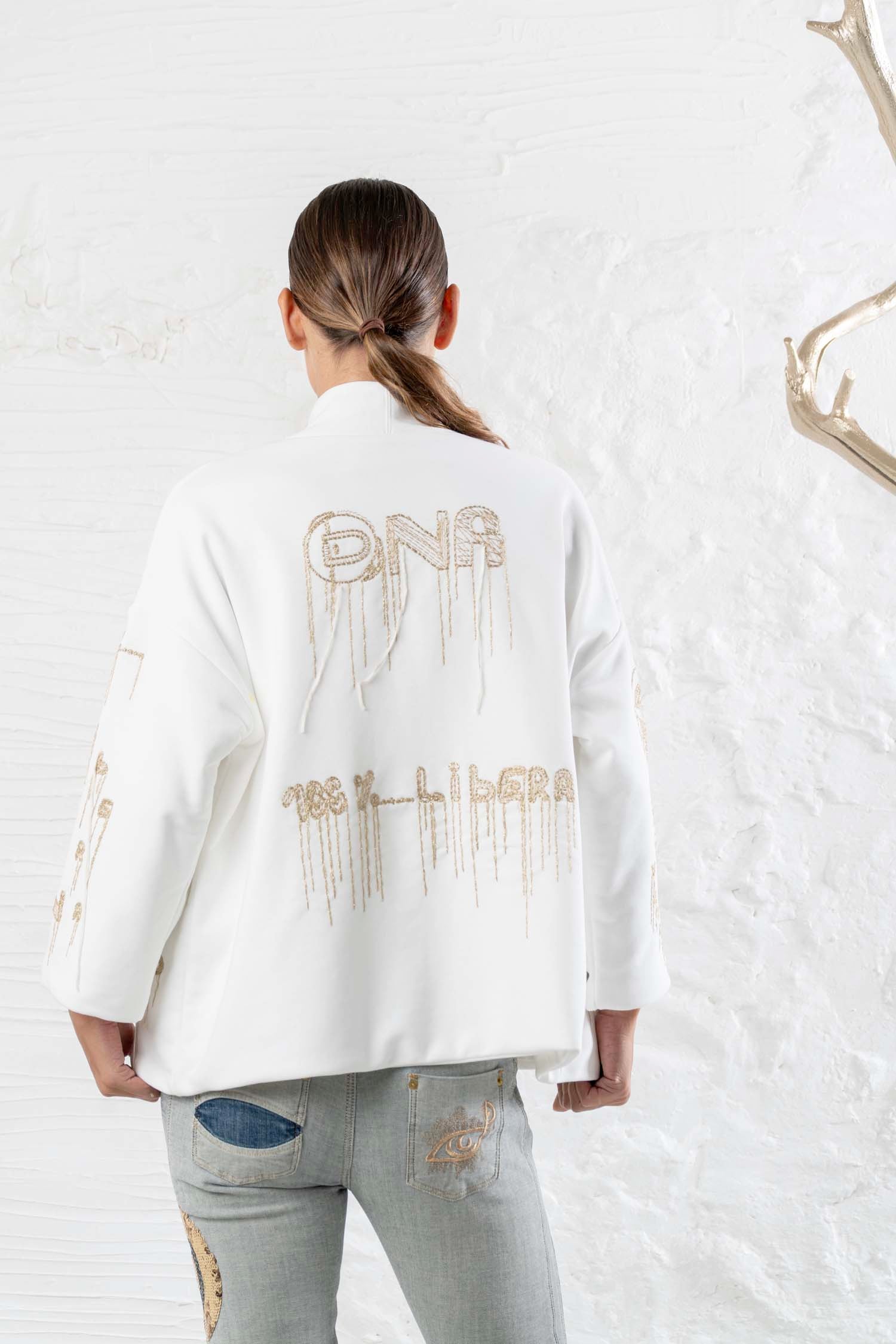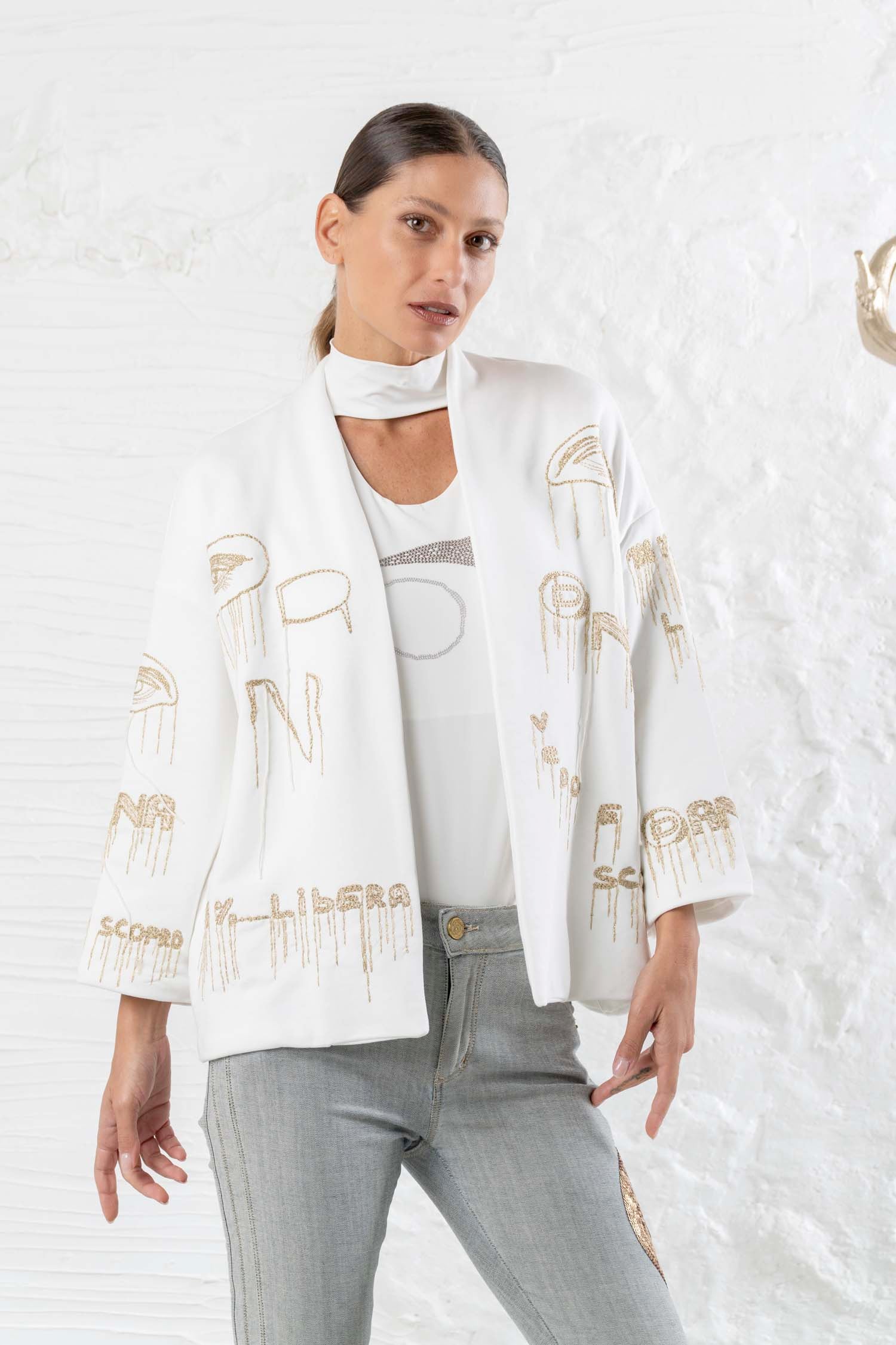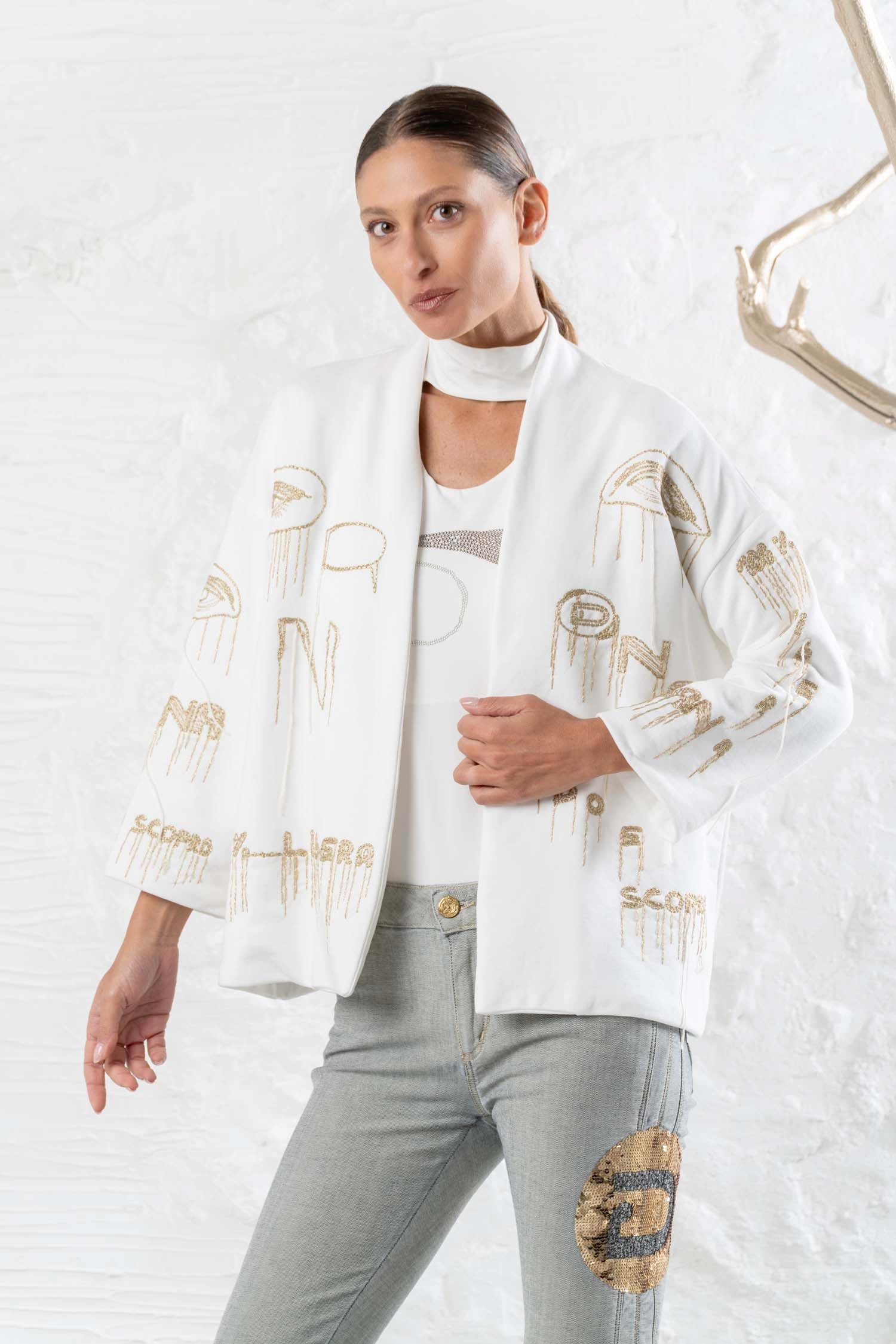 Affirmez votre style avec élégance et raffinement grâce au blazer DANIELA DALLAVALLE en tissu fluide couleur crème. Les applications dorées confèrent à cette veste à manches longues une touche de luxe. Parfait pour toutes les tenues et toutes les occasions. Sublimez votre look avec ce blazer imprimé de haute qualité.