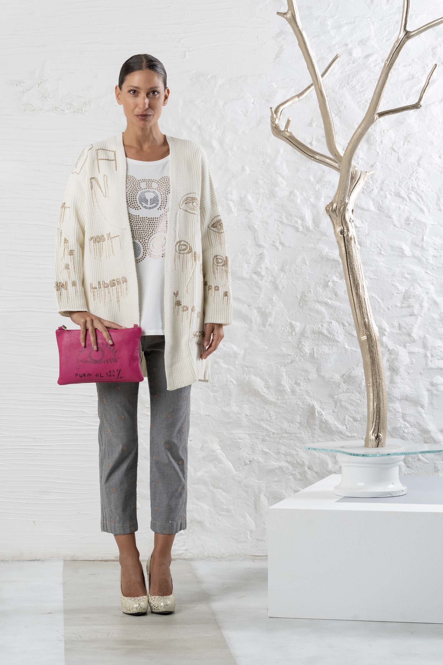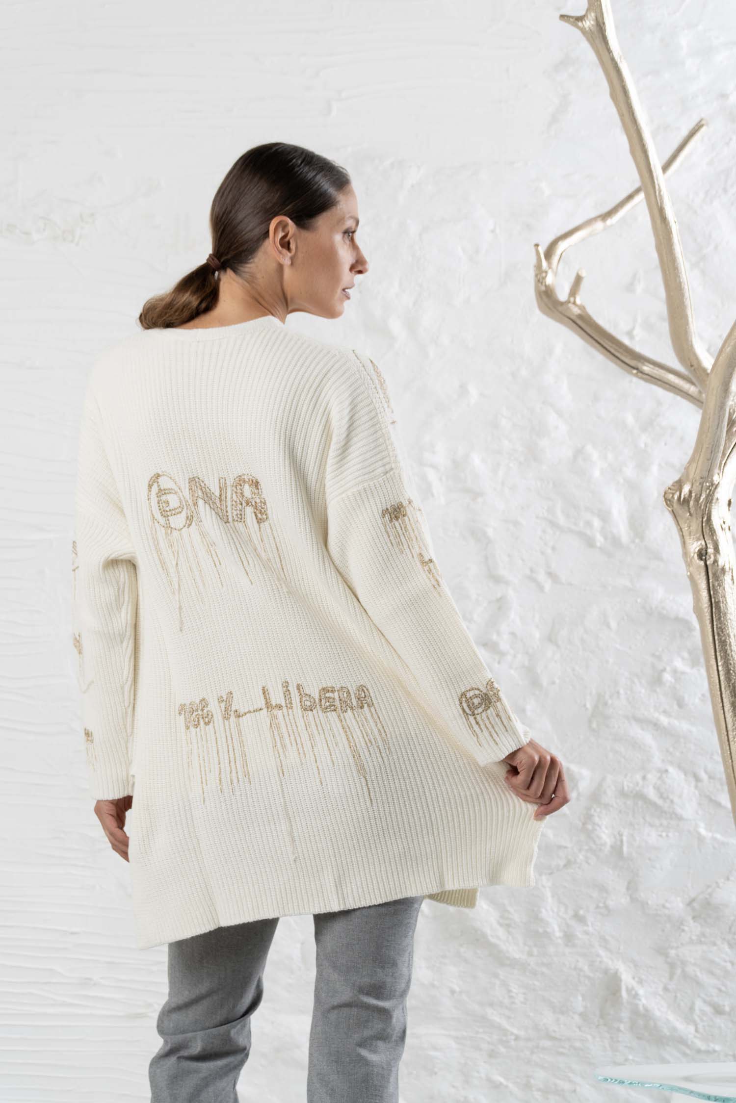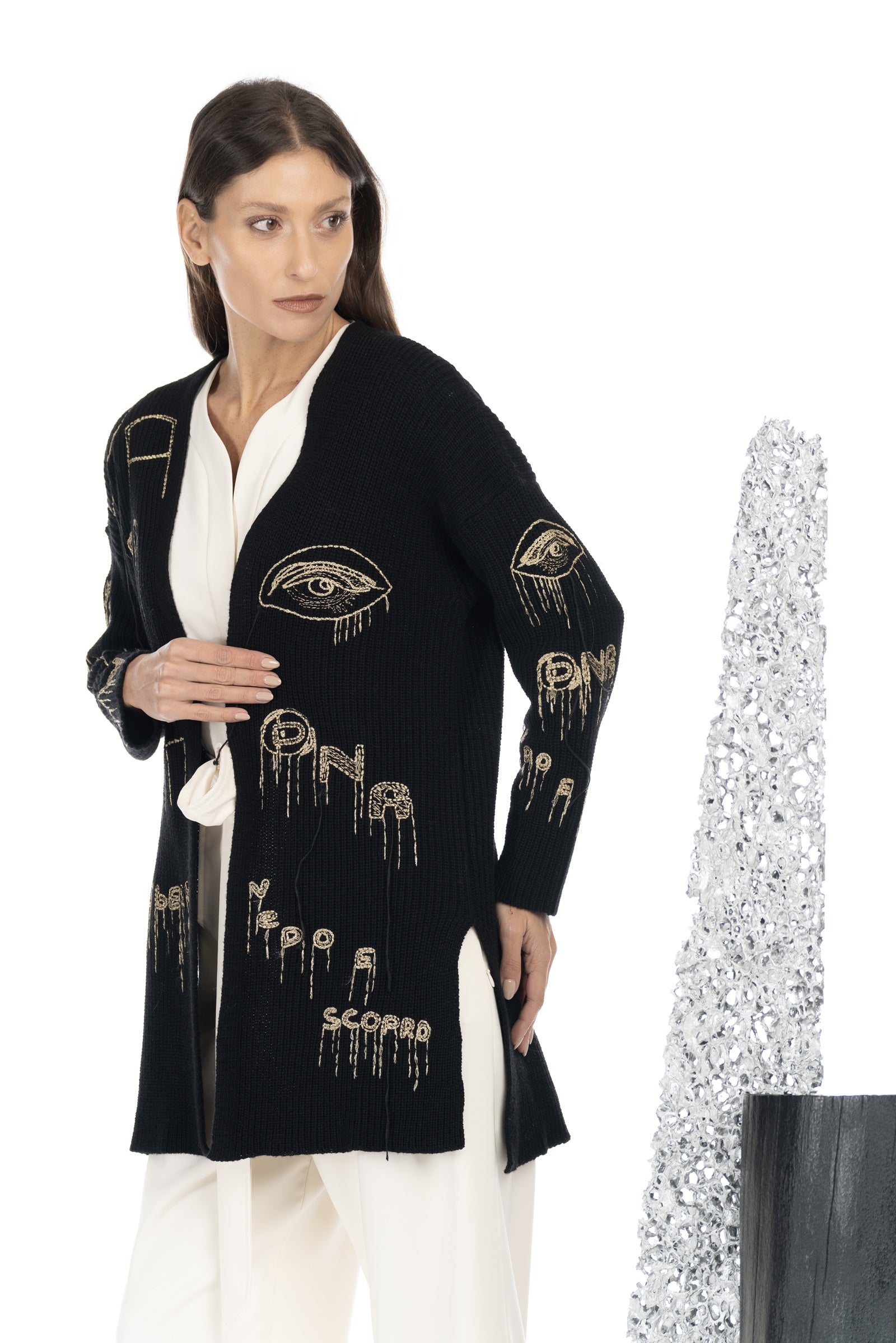 Cardigan long et élégant de DANIELA DALLAVALLE, en noir et blanc cassé. Fente et imprimé doré pour une allure tendance. Chaud et stylé à la fois. Un indispensable pour une garde-robe élégante !