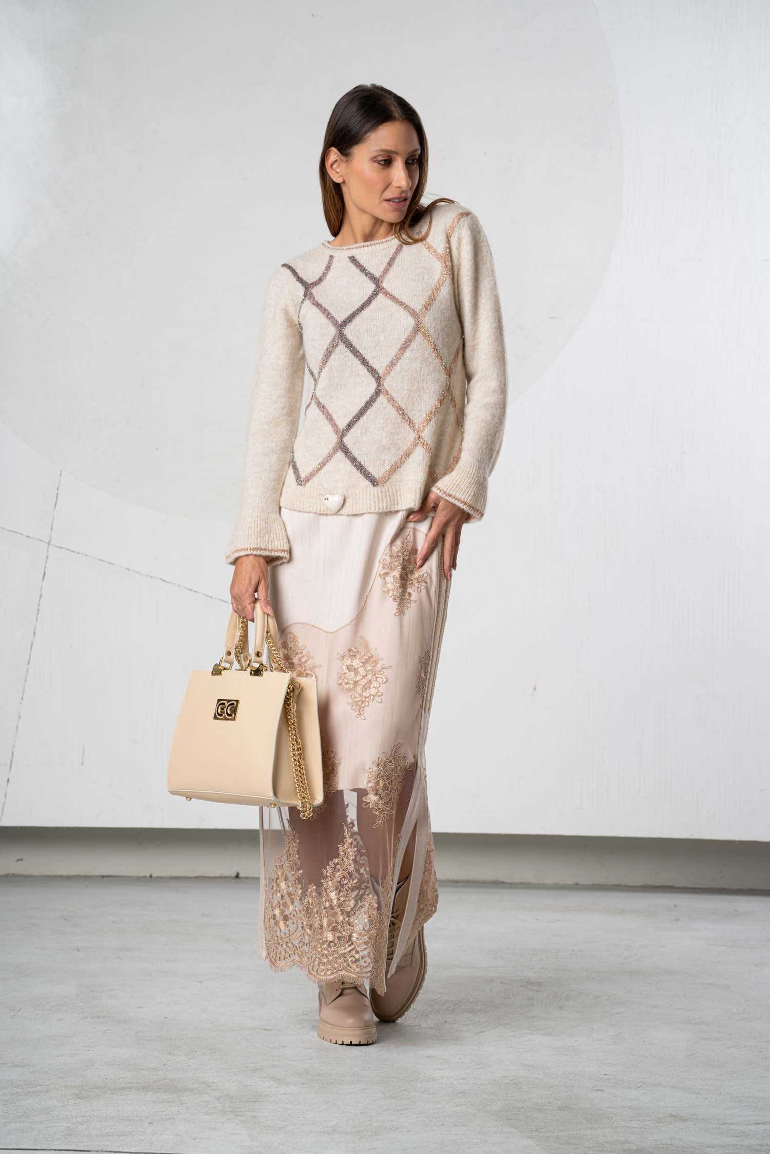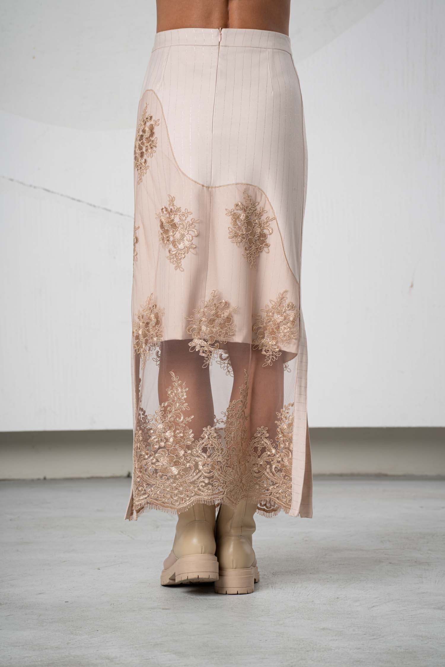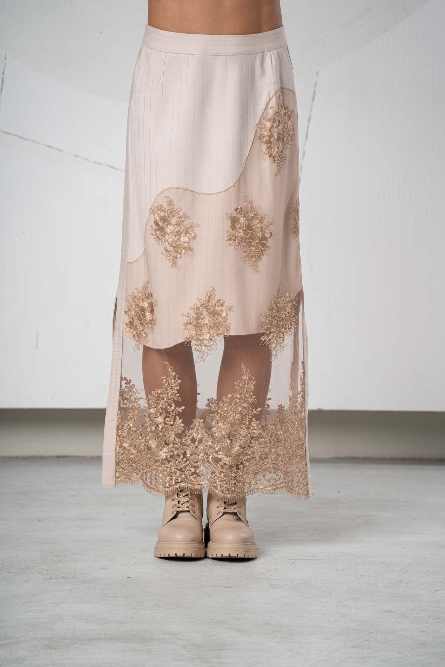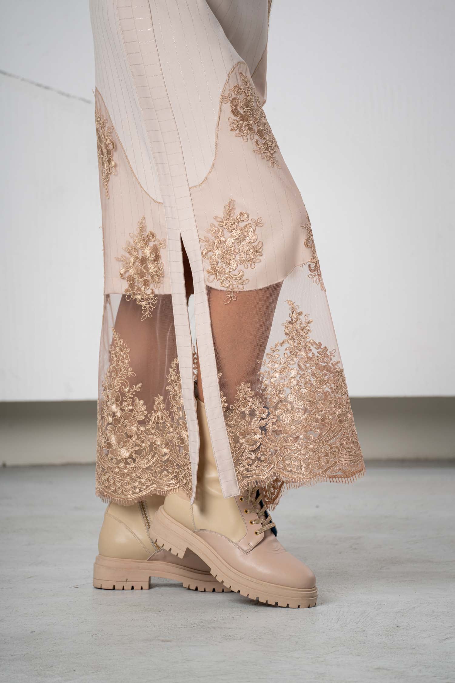 Cette longue jupe séduit par son élégant beige nude et sa délicate bordure en dentelle, qui lui confère une touche raffinée. Son tissu fin assure un drapé fluide qui flatte toutes les silhouettes et crée une allure élégante aussi bien pour les grandes occasions que pour le quotidien. Un incontournable pour les femmes exigeantes qui apprécient le raffinement discret allié à une pointe d'extravagance.