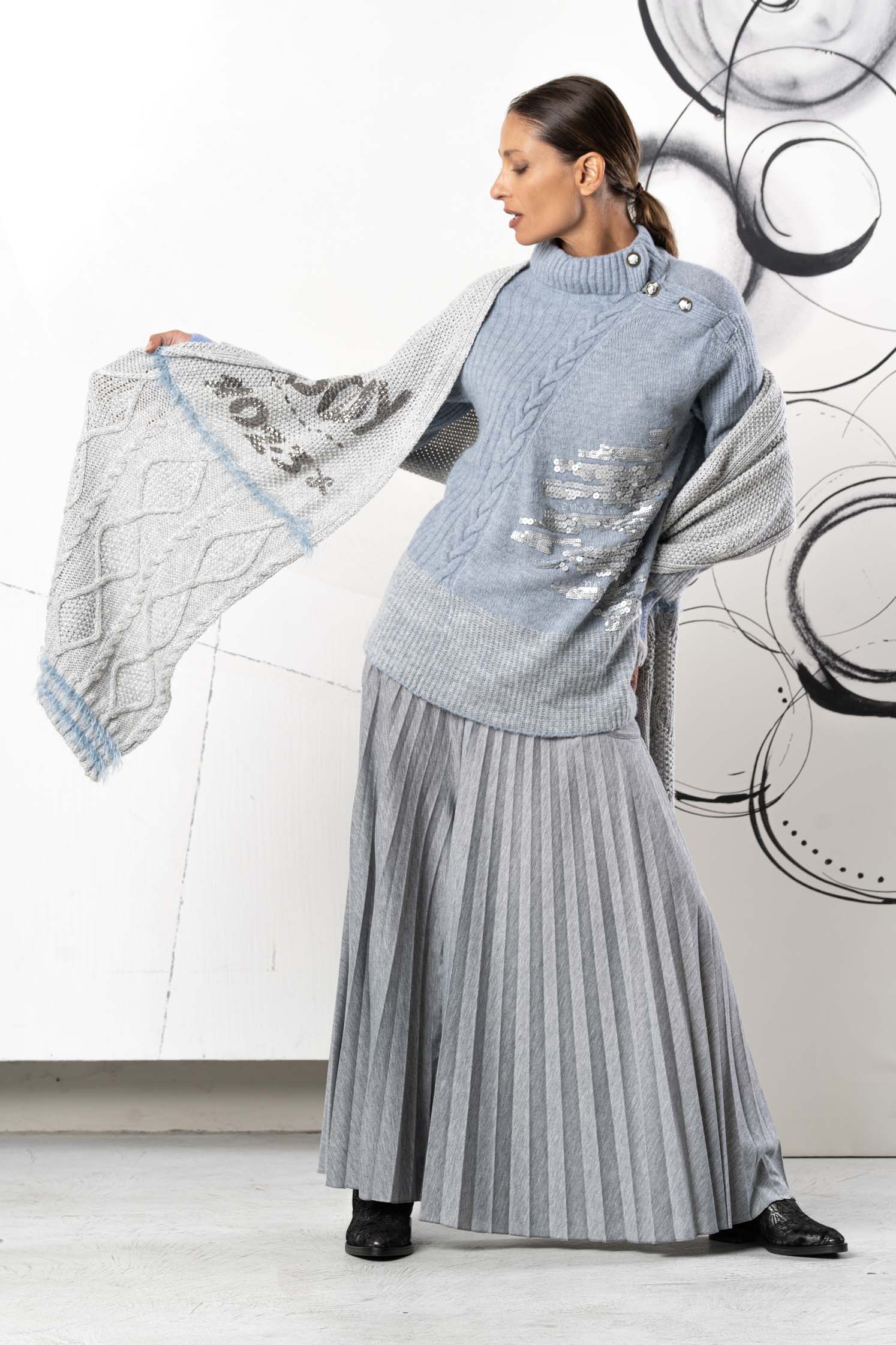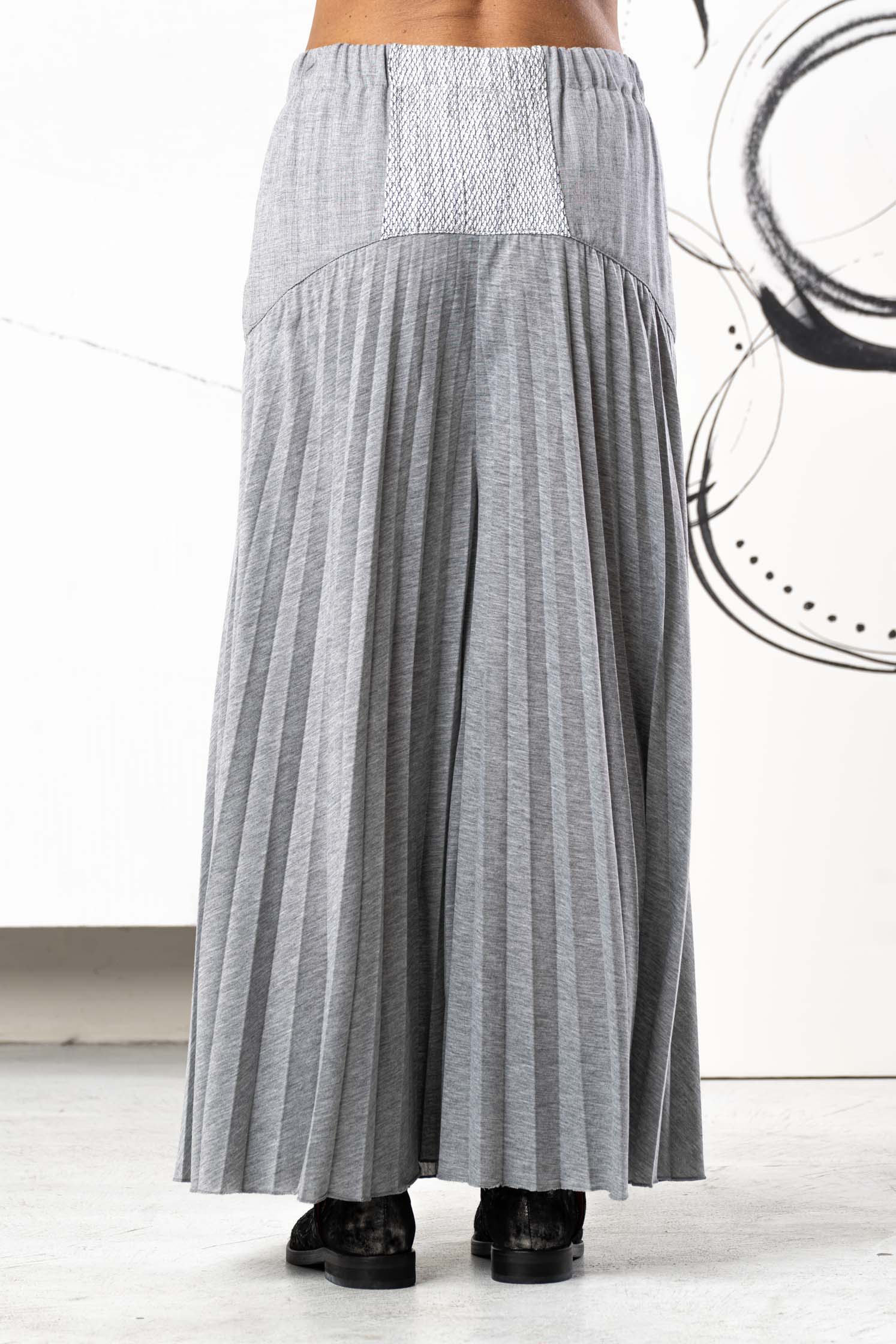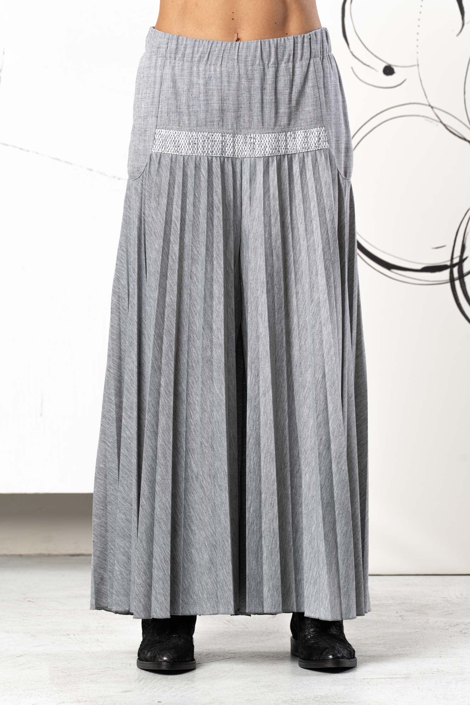 Cette élégante jupe longue séduit par sa coupe ample et son gris intemporel. Ses délicates applications lui confèrent une touche sophistiquée, la distinguant des modèles du quotidien. Confectionnée en laine de haute qualité, elle garantit un confort optimal et une silhouette fluide qui met en valeur votre silhouette. Pièce incontournable et polyvalente pour les femmes soucieuses de leur style, elle s'accorde avec élégance aussi bien avec des tenues classiques que contemporaines, apportant une touche de modernité à votre garde-robe.
